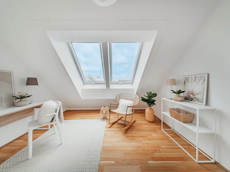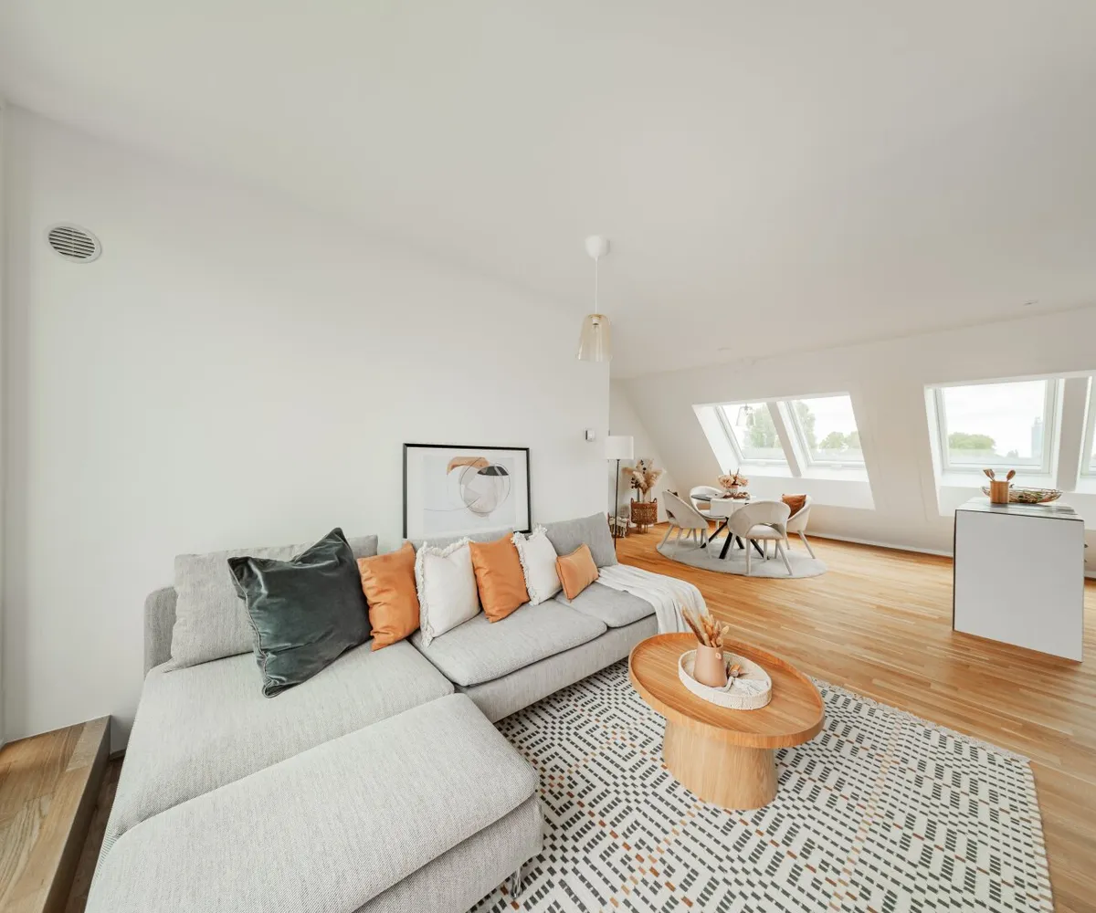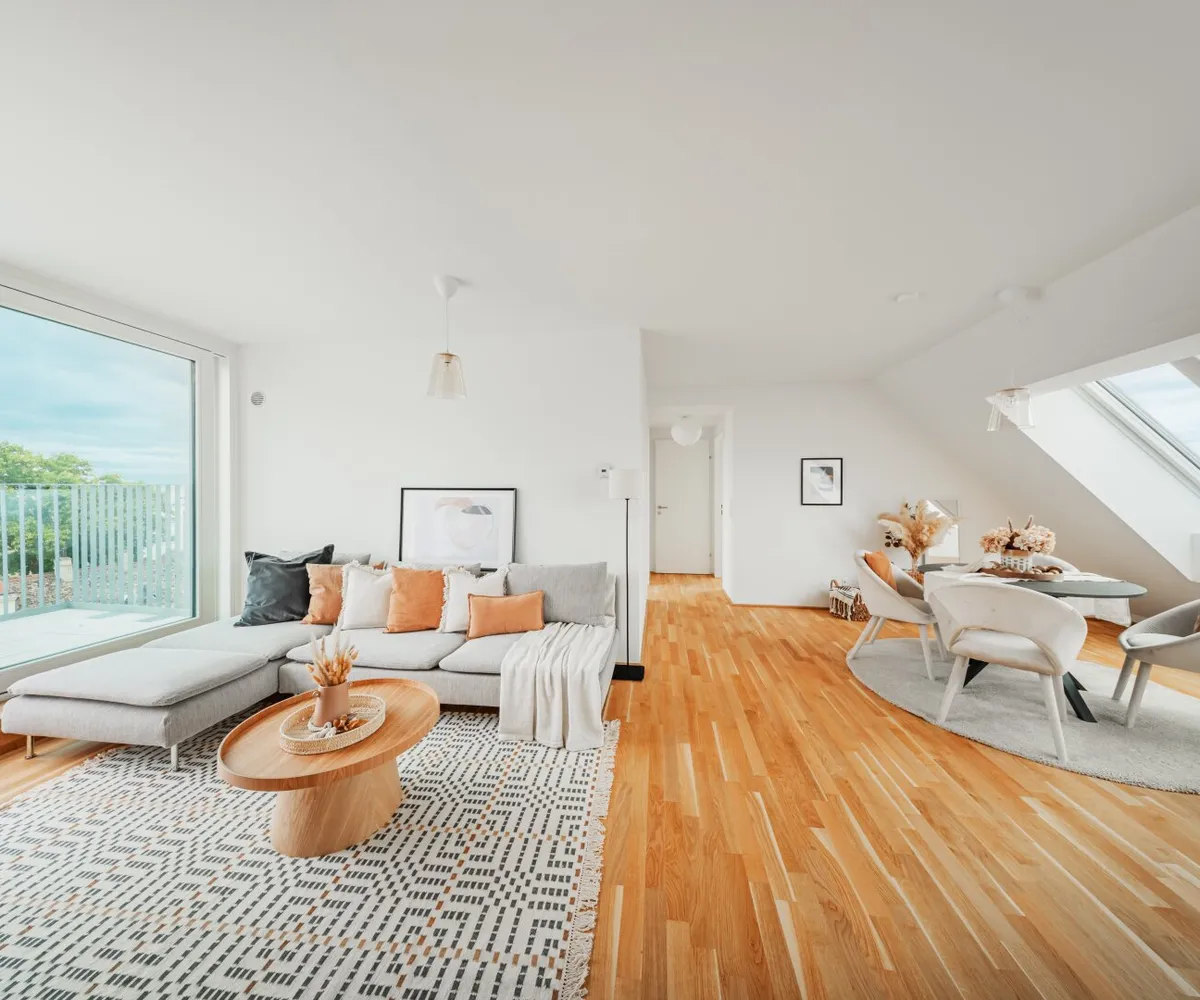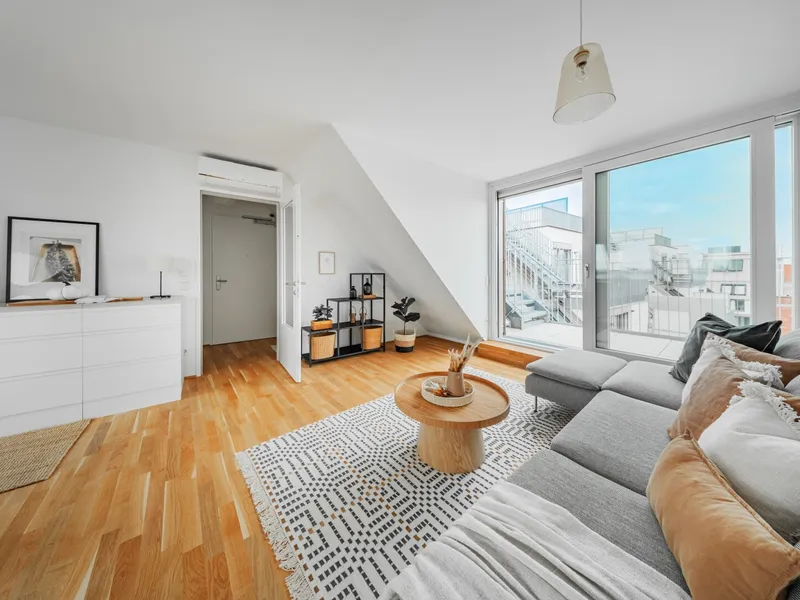 Die 2-Zimmer-Wohnung mit ca. 98 m² Wohnnutzfläche sowie einer Terrasse und einer privaten Dachterrasse befindet sich im 2. Dachgeschoss.