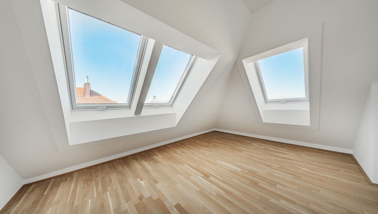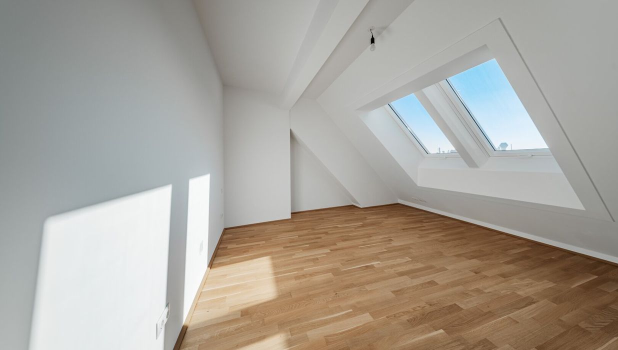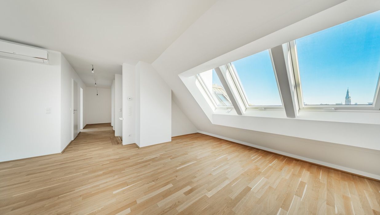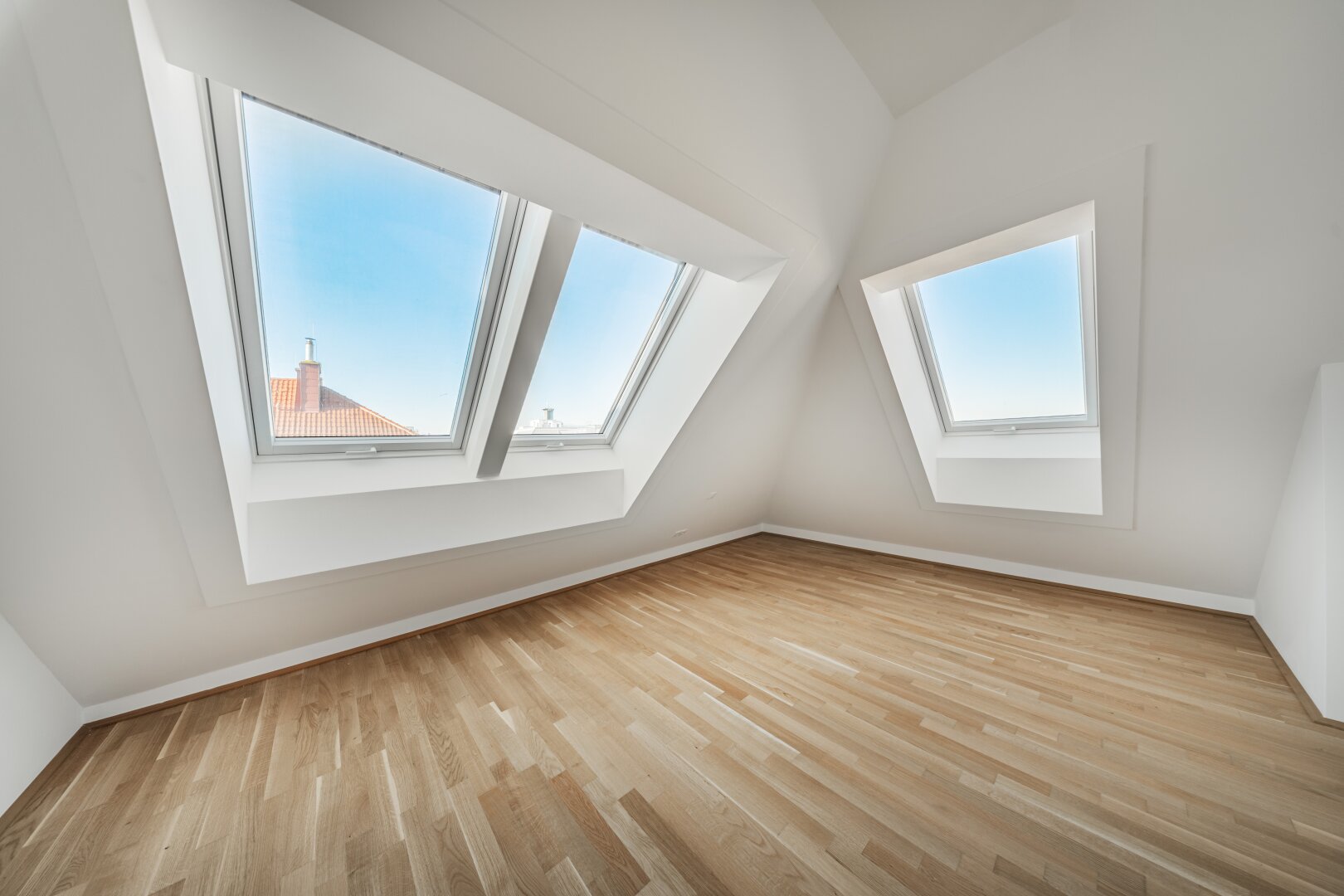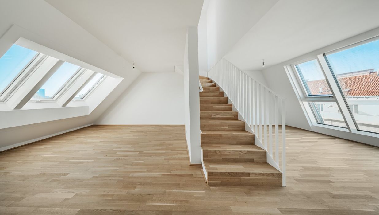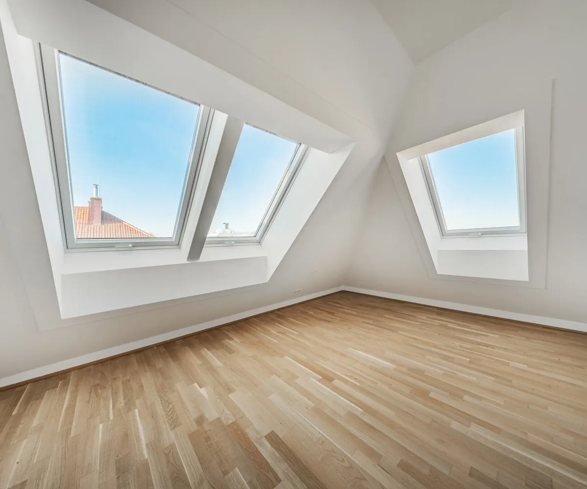 Großflächige Dachfenster erhellen die Räume mit viel natürlichem Licht.