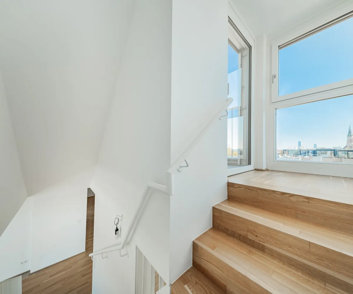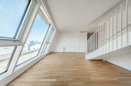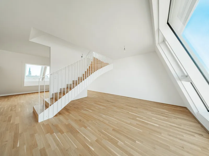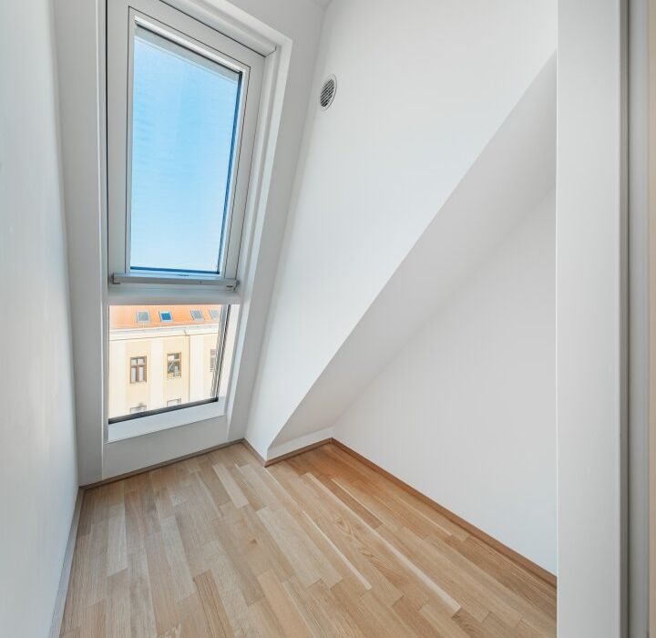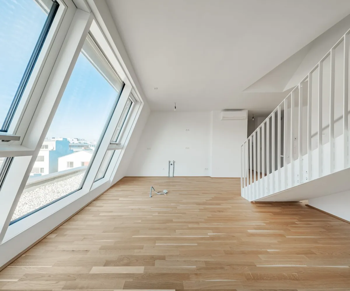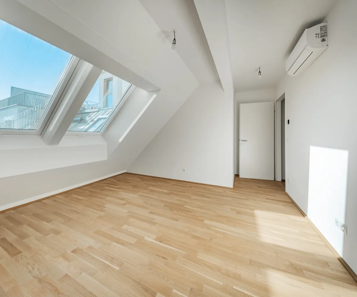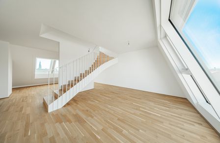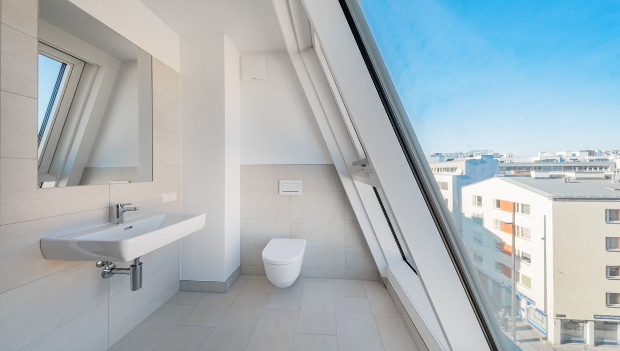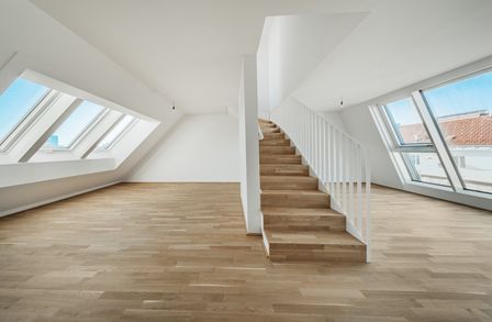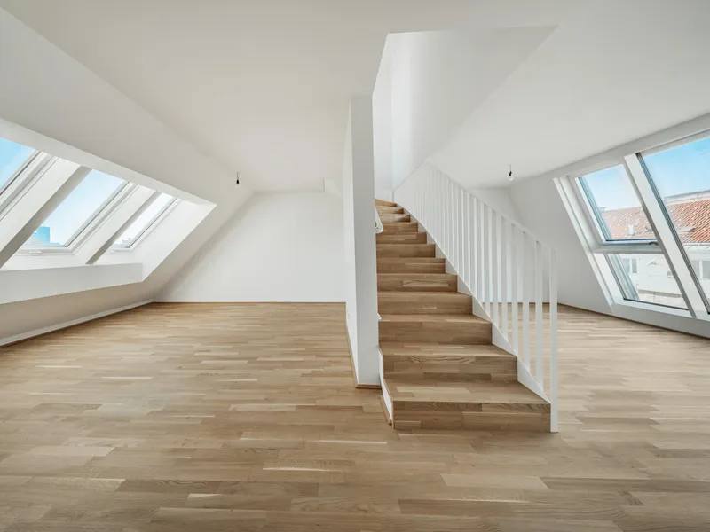 Großflächige Dachfenster erhellen die Räume mit viel natürlichem Licht.