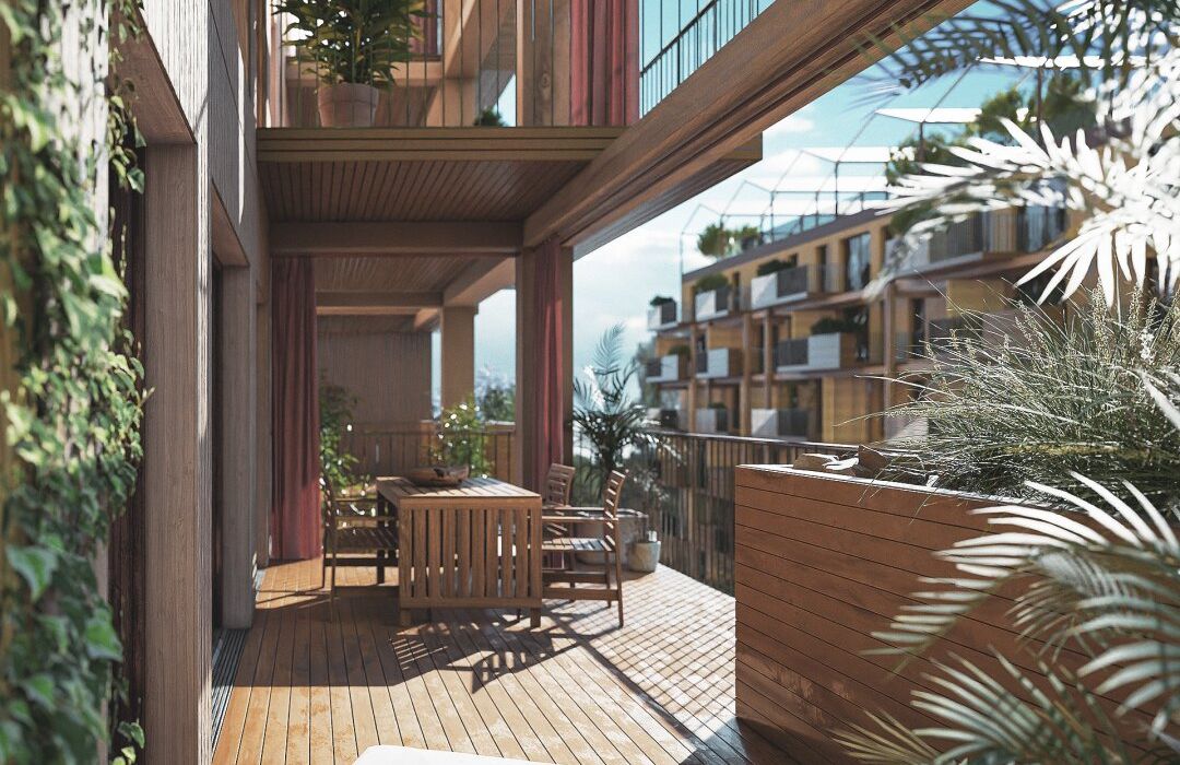 Zusätzlich zu öffentlichen Einrichtungen beherbergt die Sockelzone auch gemeinschaftlich nutzbare Räume. Jede Etage der schlanken Baukörper in Holzhybridfertigung verfügt außerdem über einen gemeinschaftlich nutzbaren Multifunktionsraum sowie über einen separat anmietbaren Coworking-Space.