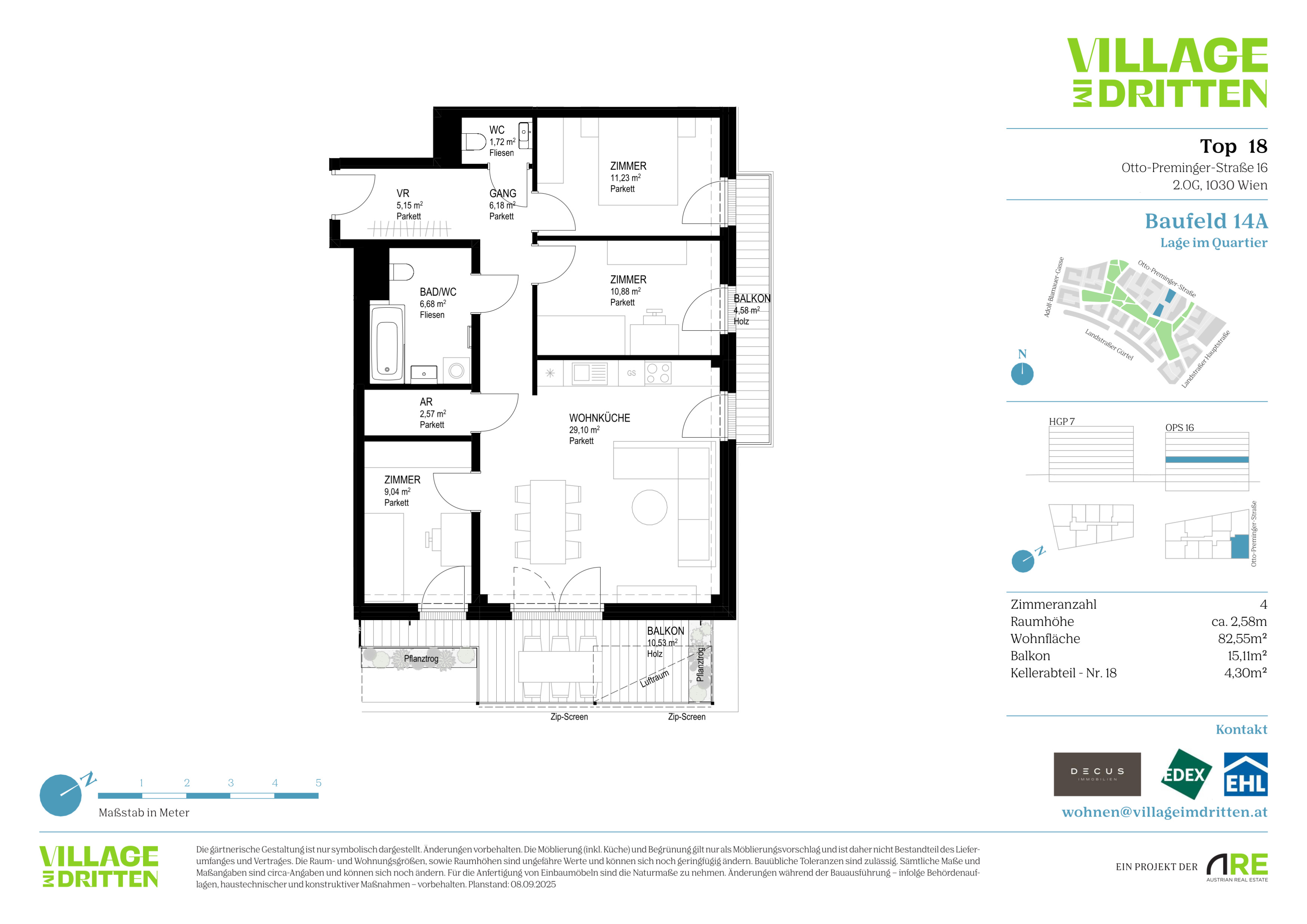 Im dritten Wiener Gemeindebezirk entsteht mit dem VILLAGE IM DRITTEN ein neues Stück Stadt – eines der größten Stadtentwicklungsgebiete Wiens. Auf über elf Hektar entwickelt die ARE Austrian Real Estate gemeinsam mit der Stadt Wien und dem wohnfonds_wien ein lebendiges, nahezu autofreies Quartier mit rund 2.000 W ohnungen, Büro- und Gewerbeflächen, Kinderbetreuung, Bildungseinrichtungen und Nahversorgung. Das grüne Herz bildet der über 2 Hektar große Bert-Brecht-Park –eine Oase für Erholung, Begegnung und Spiel. Alle Däche r , die nicht begehbar sind, werden begrünt. Sharing- Angebote, Einkaufsmöglichkeiten und Gastronomie liegen direkt vor der Haustüre. Nachhaltigkeit, kurze W ege und hohe Lebensqualität sind die Leitlinien dieses neuen Stadtviertels.