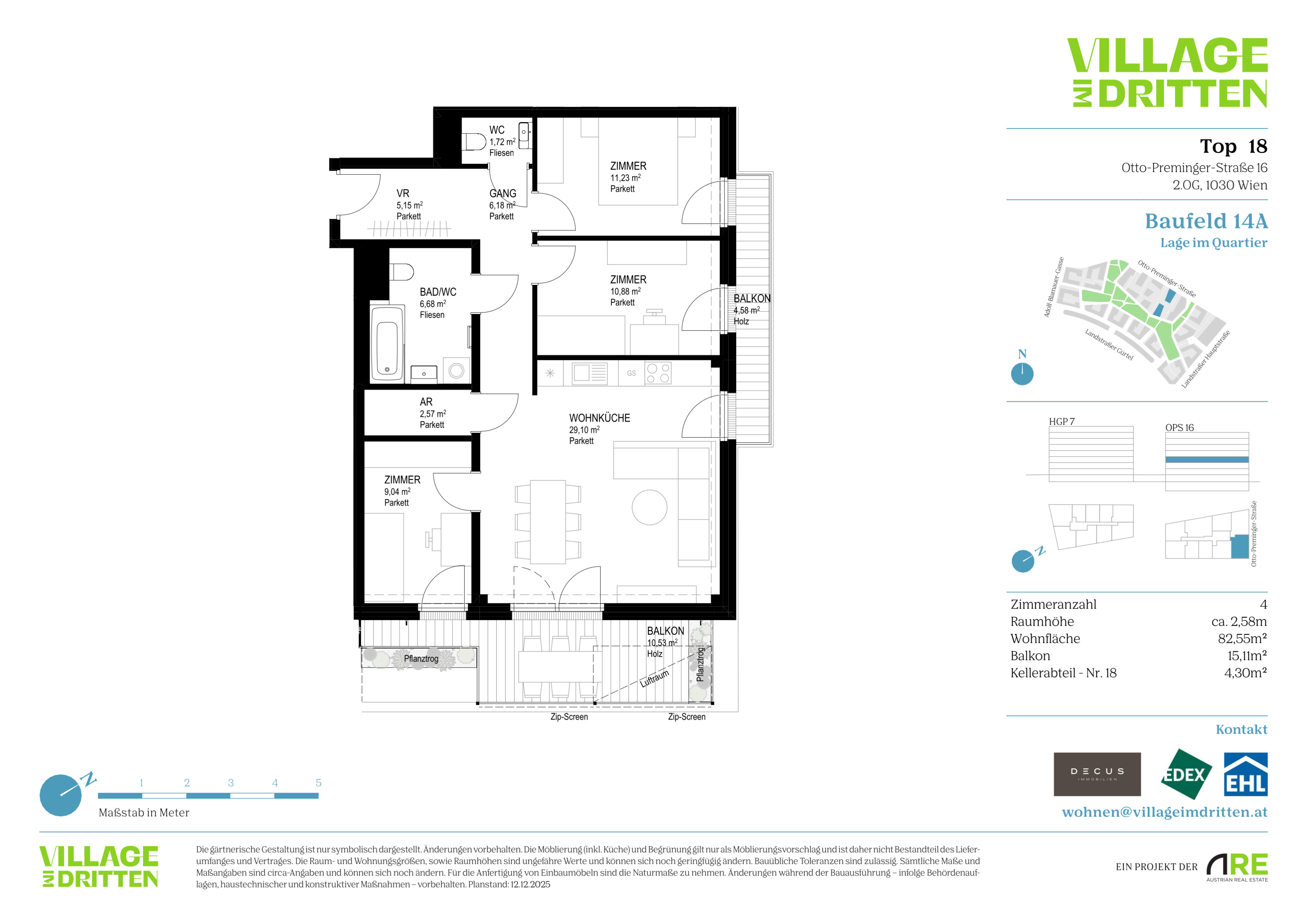 Im dritten Wiener Gemeindebezirk entsteht mit dem VILLAGE IM DRITTEN ein neues Stück Stadt – eines der größten Stadtentwicklungsgebiete Wiens. Auf über elf Hektar entwickelt die ARE Austrian Real Estate gemeinsam mit der Stadt Wien und dem wohnfonds_wien ein lebendiges, nahezu autofreies Quartier mit rund 2.000 W ohnungen, Büro- und Gewerbeflächen, Kinderbetreuung, Bildungseinrichtungen und Nahversorgung. Das grüne Herz bildet der über 2 Hektar große Bert-Brecht-Park –eine Oase für Erholung, Begegnung und Spiel. Alle Däche r , die nicht begehbar sind, werden begrünt. Sharing- Angebote, Einkaufsmöglichkeiten und Gastronomie liegen direkt vor der Haustüre. Nachhaltigkeit, kurze W ege und hohe Lebensqualität sind die Leitlinien dieses neuen Stadtviertels.