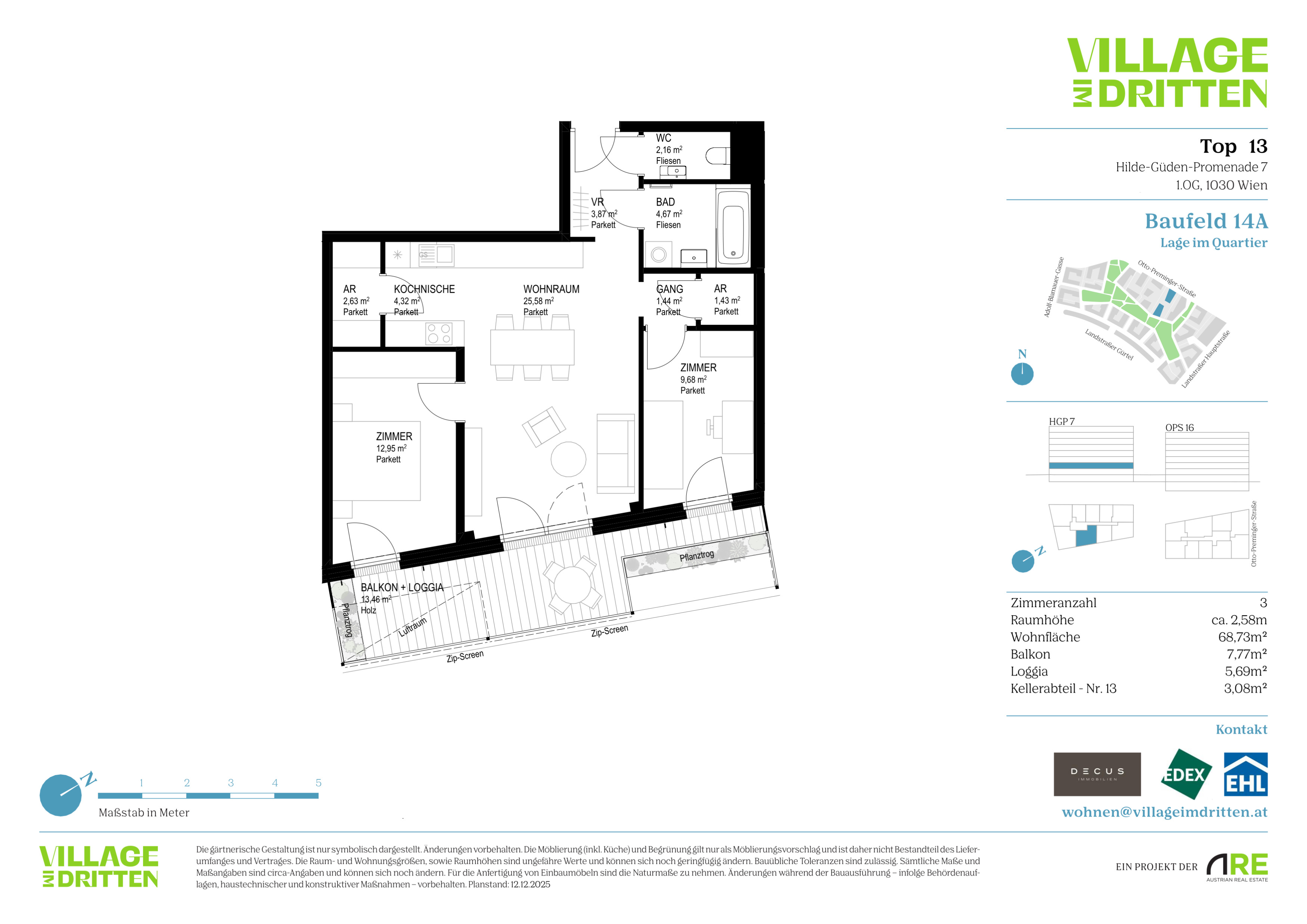 Im dritten Wiener Gemeindebezirk entsteht mit dem VILLAGE IM DRITTEN ein neues Stück Stadt – eines der größten Stadtentwicklungsgebiete Wiens. Auf über elf Hektar entwickelt die ARE Austrian Real Estate gemeinsam mit der Stadt Wien und dem wohnfonds_wien ein lebendiges, nahezu autofreies Quartier mit rund 2.000 W ohnungen, Büro- und Gewerbeflächen, Kinderbetreuung, Bildungseinrichtungen und Nahversorgung. Das grüne Herz bildet der über 2 Hektar große Bert-Brecht-Park –eine Oase für Erholung, Begegnung und Spiel. Alle Däche r , die nicht begehbar sind, werden begrünt. Sharing- Angebote, Einkaufsmöglichkeiten und Gastronomie liegen direkt vor der Haustüre. Nachhaltigkeit, kurze W ege und hohe Lebensqualität sind die Leitlinien dieses neuen Stadtviertels.