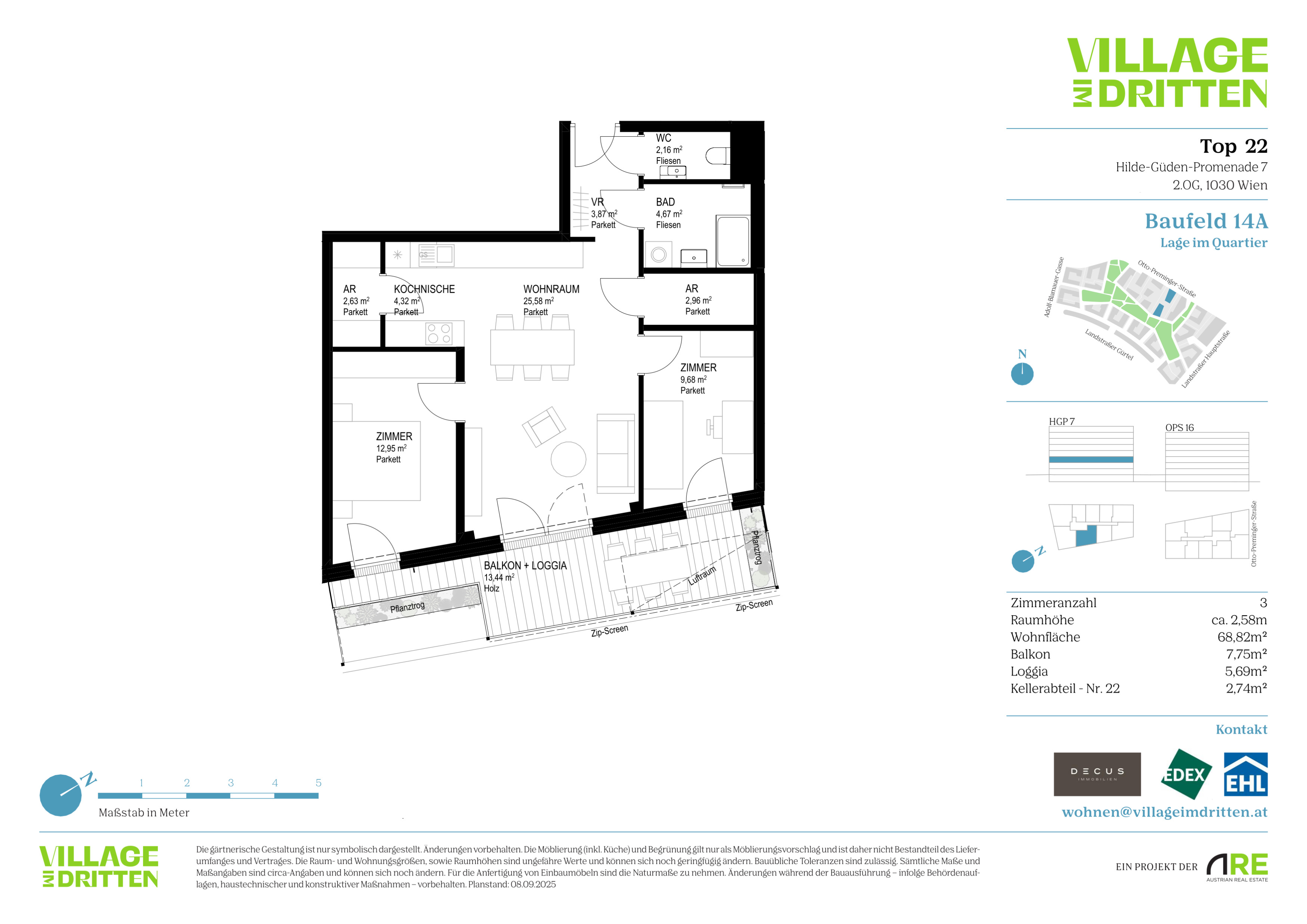 Im dritten Wiener Gemeindebezirk entsteht mit dem VILLAGE IM DRITTEN ein neues Stück Stadt – eines der größten Stadtentwicklungsgebiete Wiens. Auf über elf Hektar entwickelt die ARE Austrian Real Estate gemeinsam mit der Stadt Wien und dem wohnfonds_wien ein lebendiges, nahezu autofreies Quartier mit rund 2.000 W ohnungen, Büro- und Gewerbeflächen, Kinderbetreuung, Bildungseinrichtungen und Nahversorgung. Das grüne Herz bildet der über 2 Hektar große Bert-Brecht-Park –eine Oase für Erholung, Begegnung und Spiel. Alle Däche r , die nicht begehbar sind, werden begrünt. Sharing- Angebote, Einkaufsmöglichkeiten und Gastronomie liegen direkt vor der Haustüre. Nachhaltigkeit, kurze W ege und hohe Lebensqualität sind die Leitlinien dieses neuen Stadtviertels.