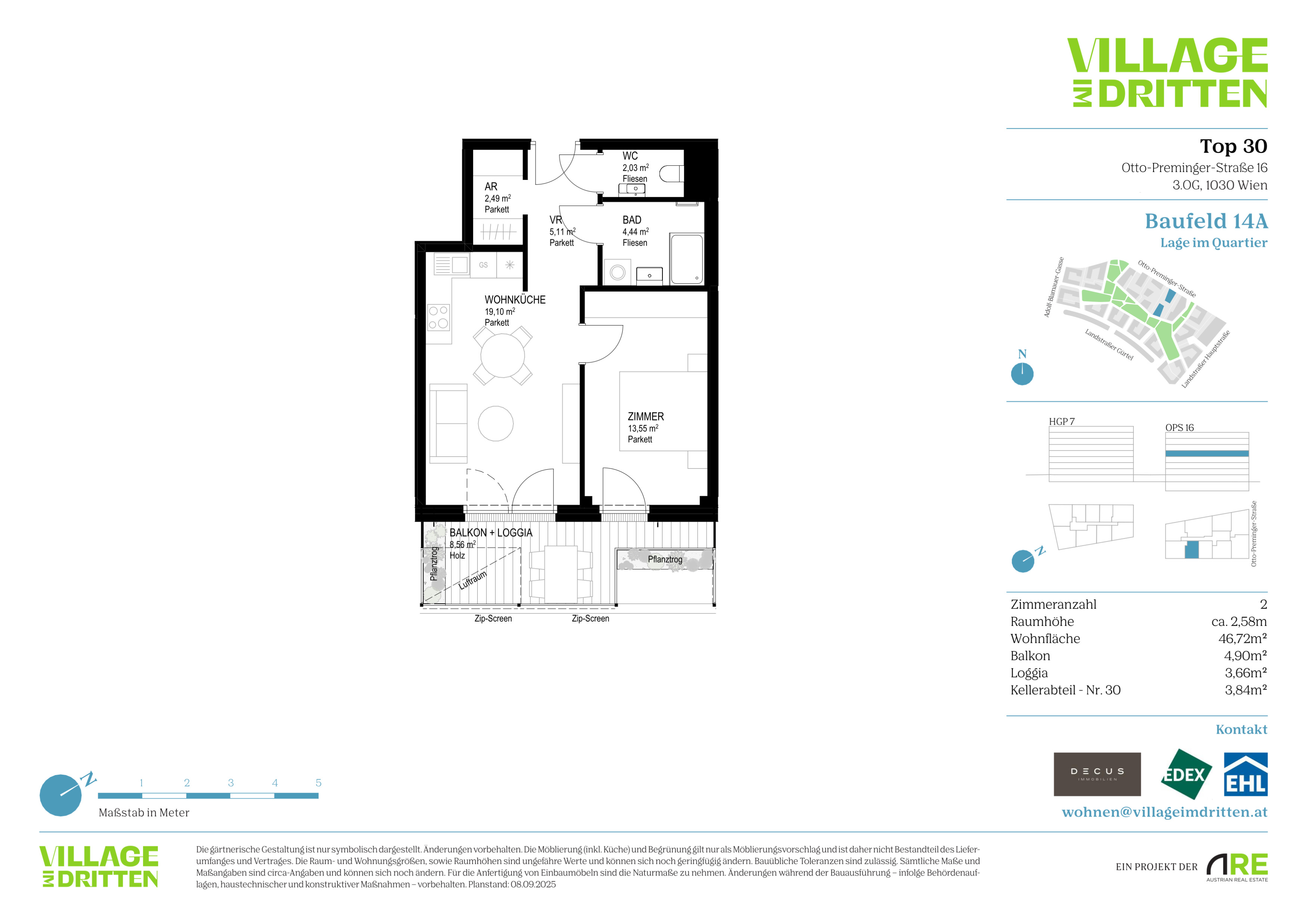 Im dritten Wiener Gemeindebezirk entsteht mit dem VILLAGE IM DRITTEN ein neues Stück Stadt – eines der größten Stadtentwicklungsgebiete Wiens. Auf über elf Hektar entwickelt die ARE Austrian Real Estate gemeinsam mit der Stadt Wien und dem wohnfonds_wien ein lebendiges, nahezu autofreies Quartier mit rund 2.000 W ohnungen, Büro- und Gewerbeflächen, Kinderbetreuung, Bildungseinrichtungen und Nahversorgung. Das grüne Herz bildet der über 2 Hektar große Bert-Brecht-Park –eine Oase für Erholung, Begegnung und Spiel. Alle Däche r , die nicht begehbar sind, werden begrünt. Sharing- Angebote, Einkaufsmöglichkeiten und Gastronomie liegen direkt vor der Haustüre. Nachhaltigkeit, kurze W ege und hohe Lebensqualität sind die Leitlinien dieses neuen Stadtviertels.