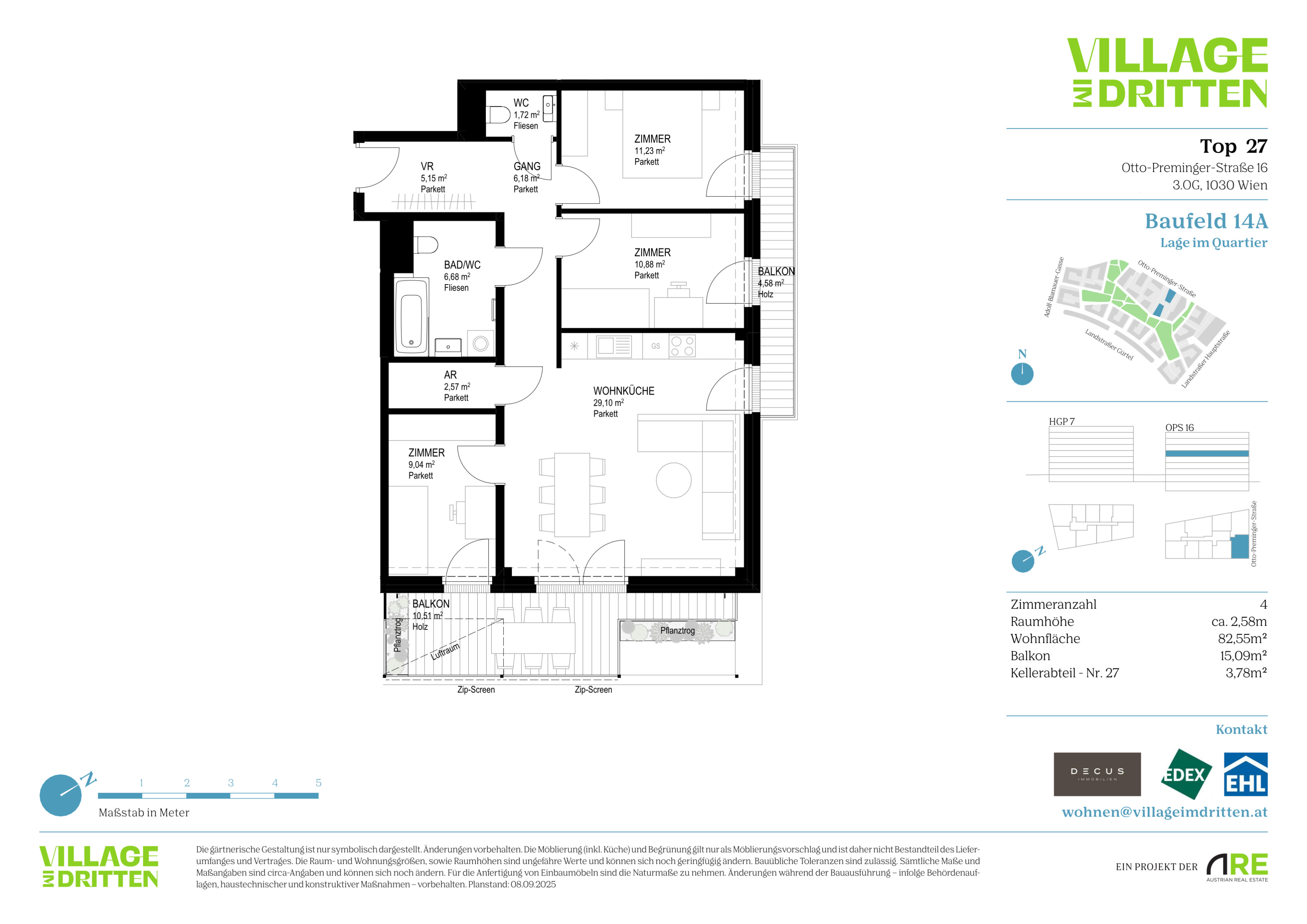 Im dritten Wiener Gemeindebezirk entsteht mit dem VILLAGE IM DRITTEN ein neues Stück Stadt – eines der größten Stadtentwicklungsgebiete Wiens. Auf über elf Hektar entwickelt die ARE Austrian Real Estate gemeinsam mit der Stadt Wien und dem wohnfonds_wien ein lebendiges, nahezu autofreies Quartier mit rund 2.000 W ohnungen, Büro- und Gewerbeflächen, Kinderbetreuung, Bildungseinrichtungen und Nahversorgung. Das grüne Herz bildet der über 2 Hektar große Bert-Brecht-Park –eine Oase für Erholung, Begegnung und Spiel. Alle Däche r , die nicht begehbar sind, werden begrünt. Sharing- Angebote, Einkaufsmöglichkeiten und Gastronomie liegen direkt vor der Haustüre. Nachhaltigkeit, kurze W ege und hohe Lebensqualität sind die Leitlinien dieses neuen Stadtviertels.