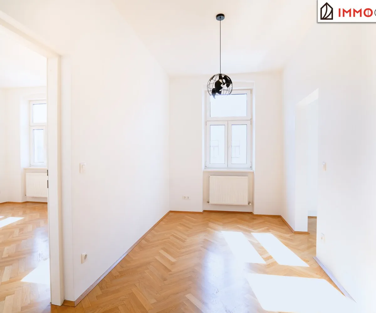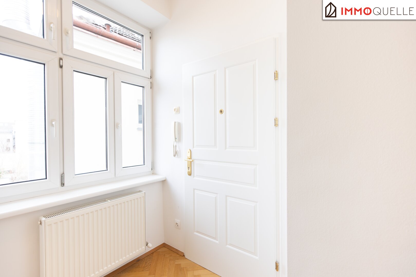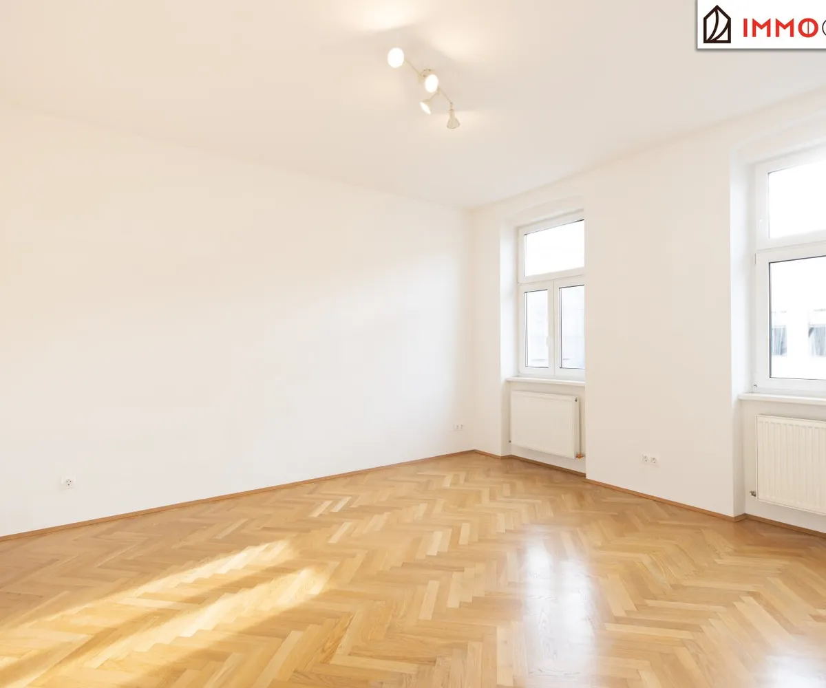 Schon beim Betreten der Wohnung spürt man die Verbindung von Stil und Substanz: Ein klassischer Fischgrätparkett, hohe Decken, großzügige Fenster und ein gepflegtes Raumgefühl, das von Anfang an einlädt.