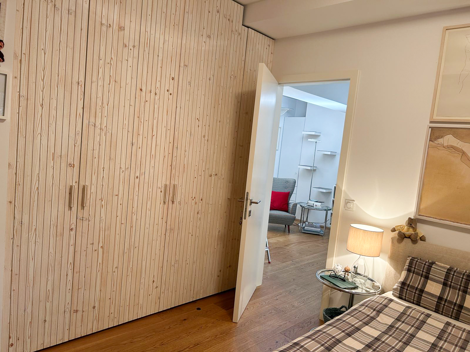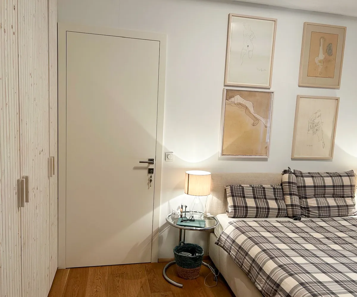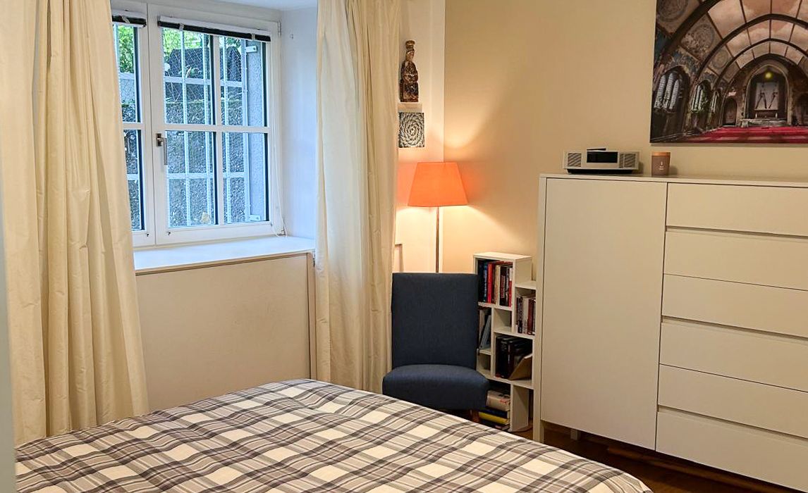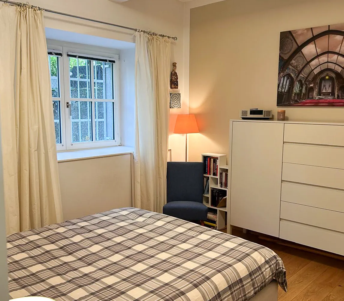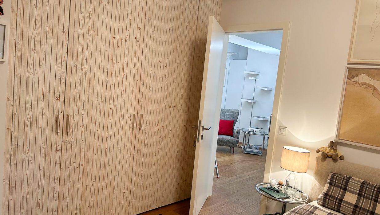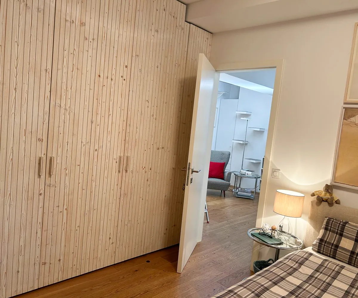 Das ruhig gelegene Schlafzimmer bietet ausreichend Platz, einen vom Tischler gefertigten Einbauschrank und lässt sich vielseitig möblieren.