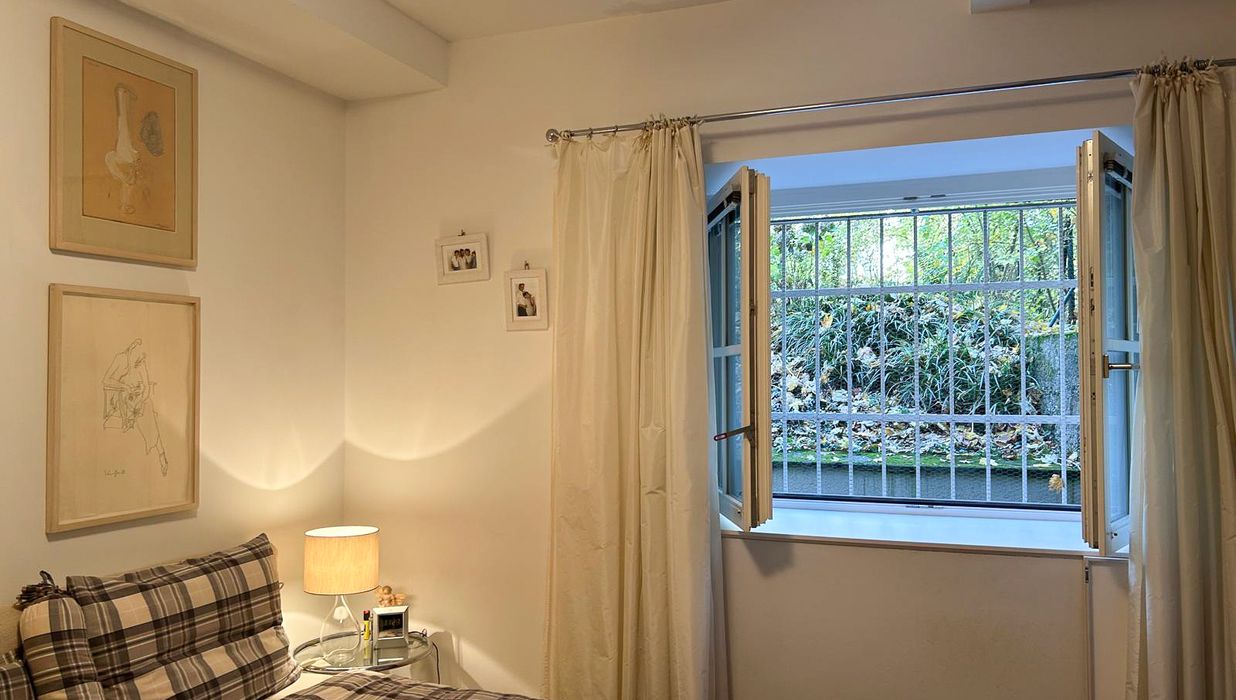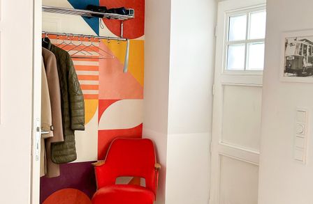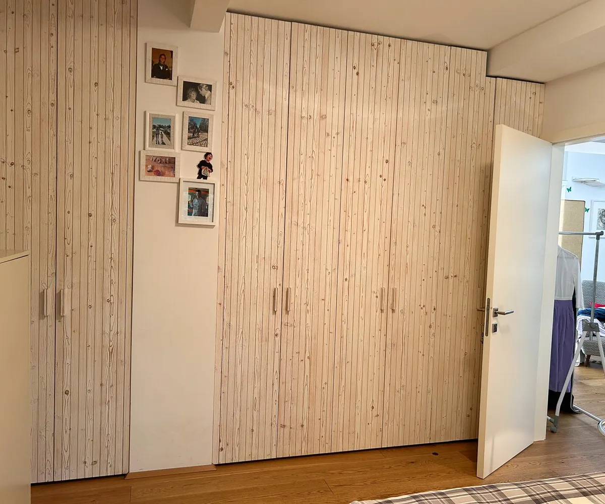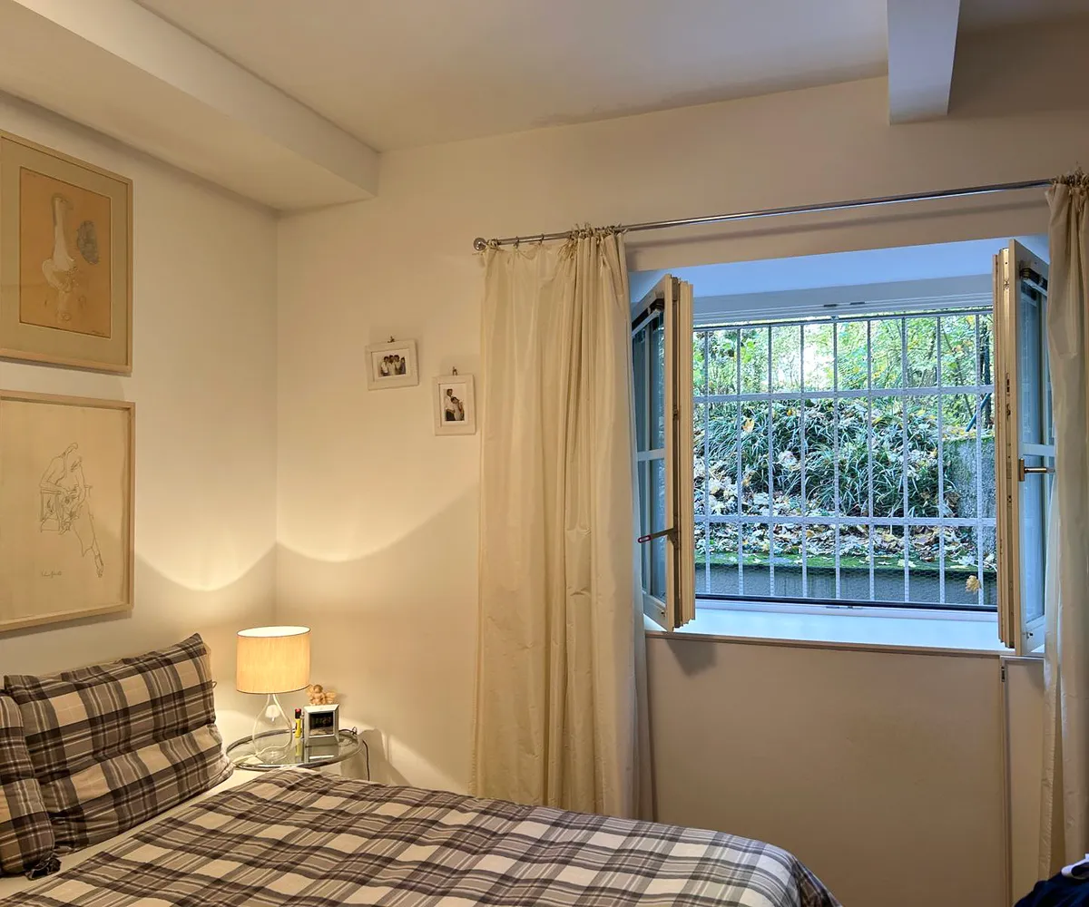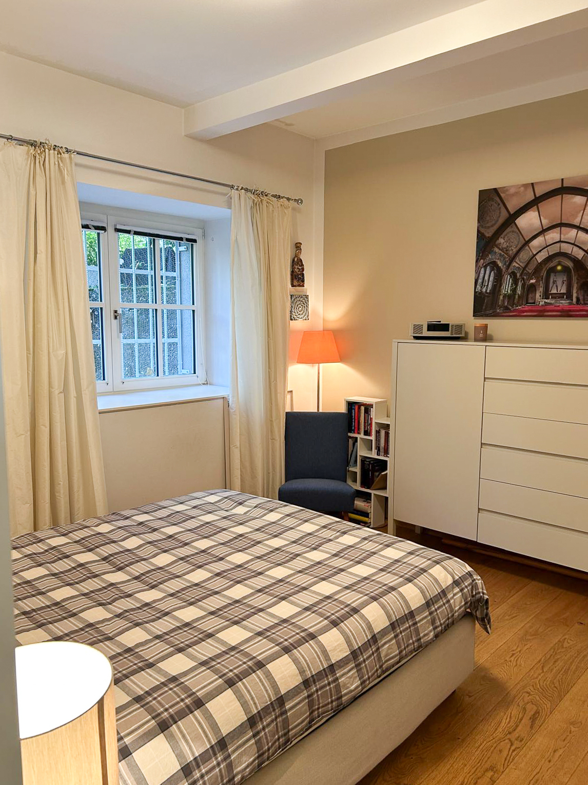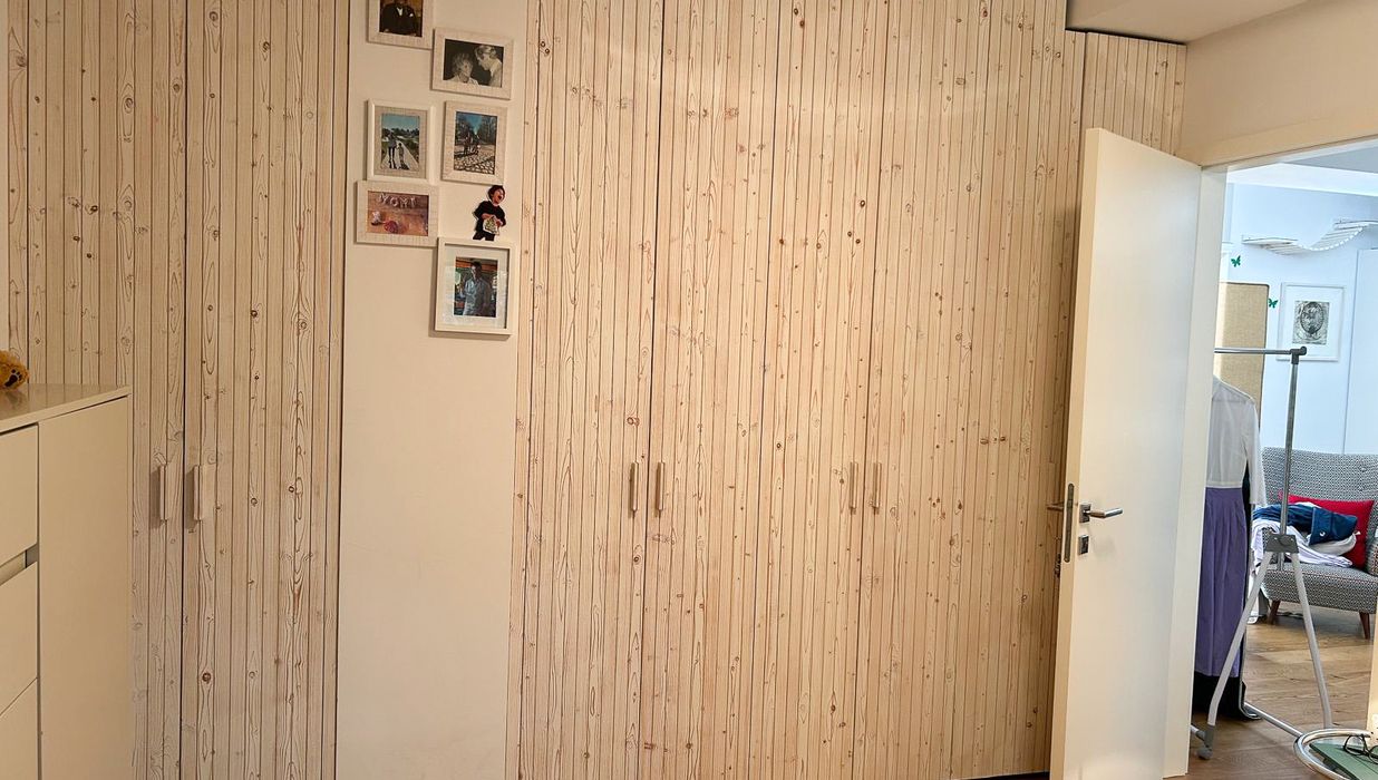 Das ruhig gelegene Schlafzimmer bietet ausreichend Platz, einen vom Tischler gefertigten Einbauschrank und lässt sich vielseitig möblieren.