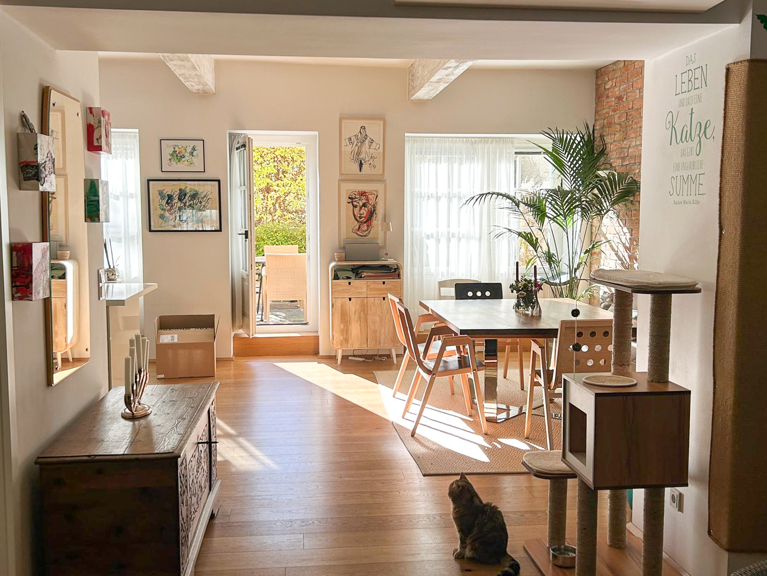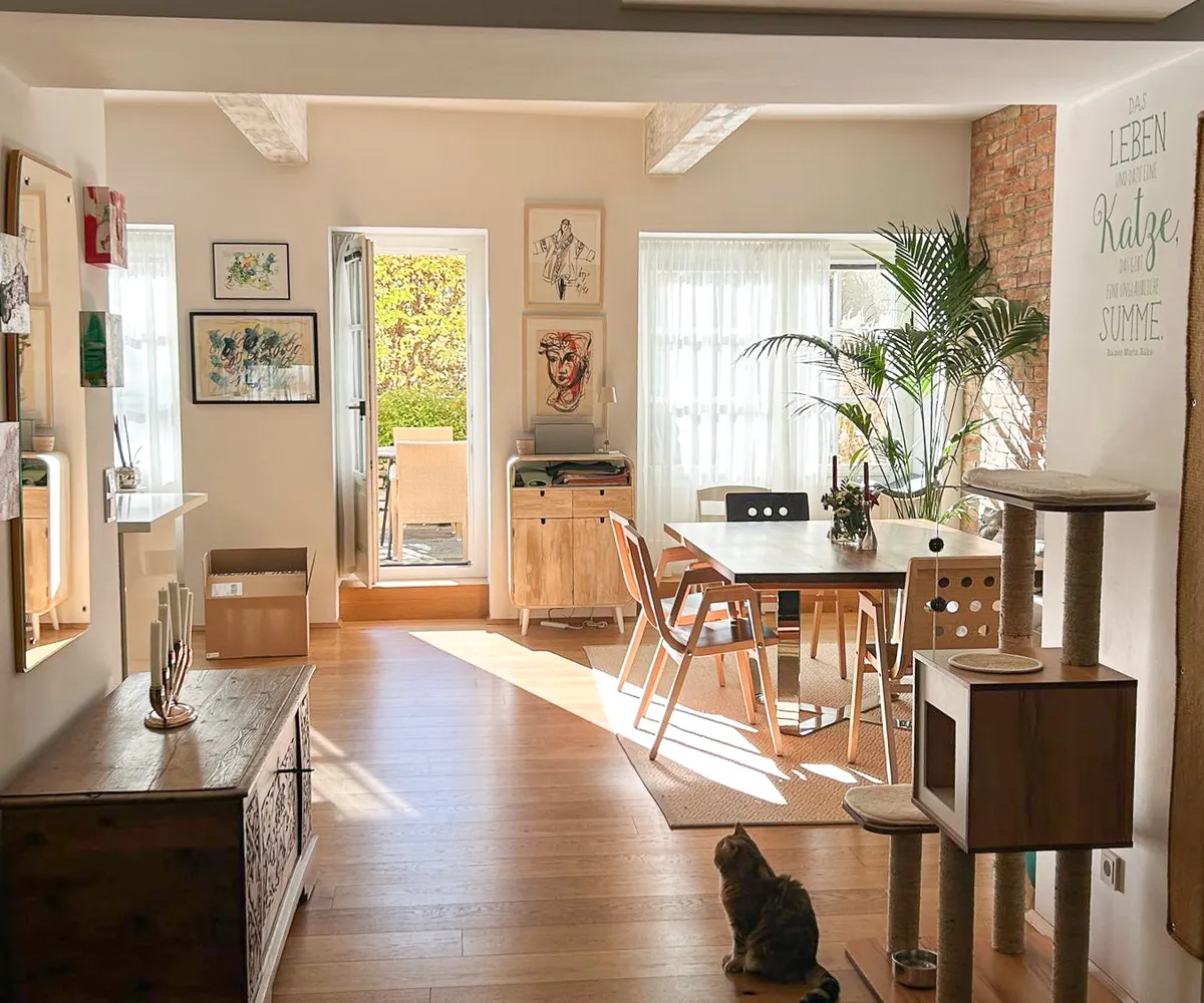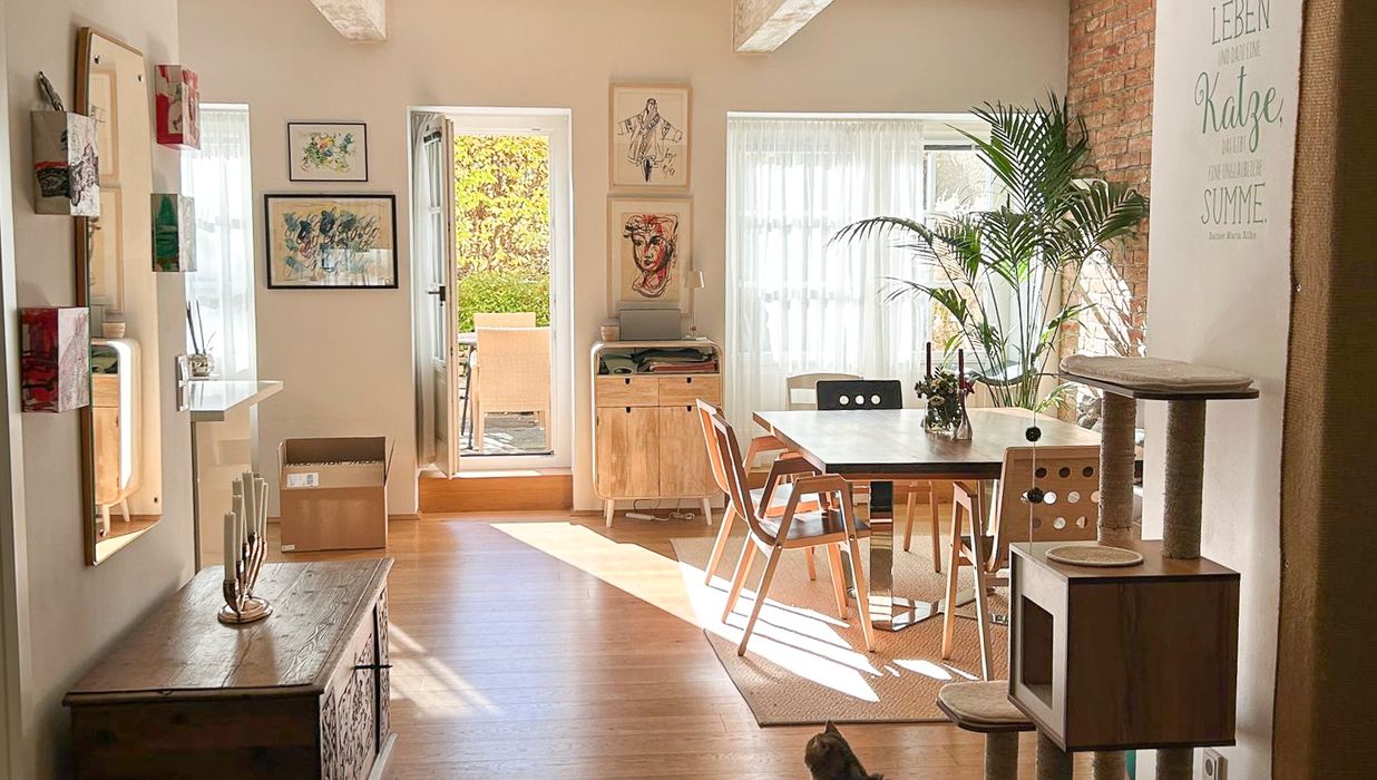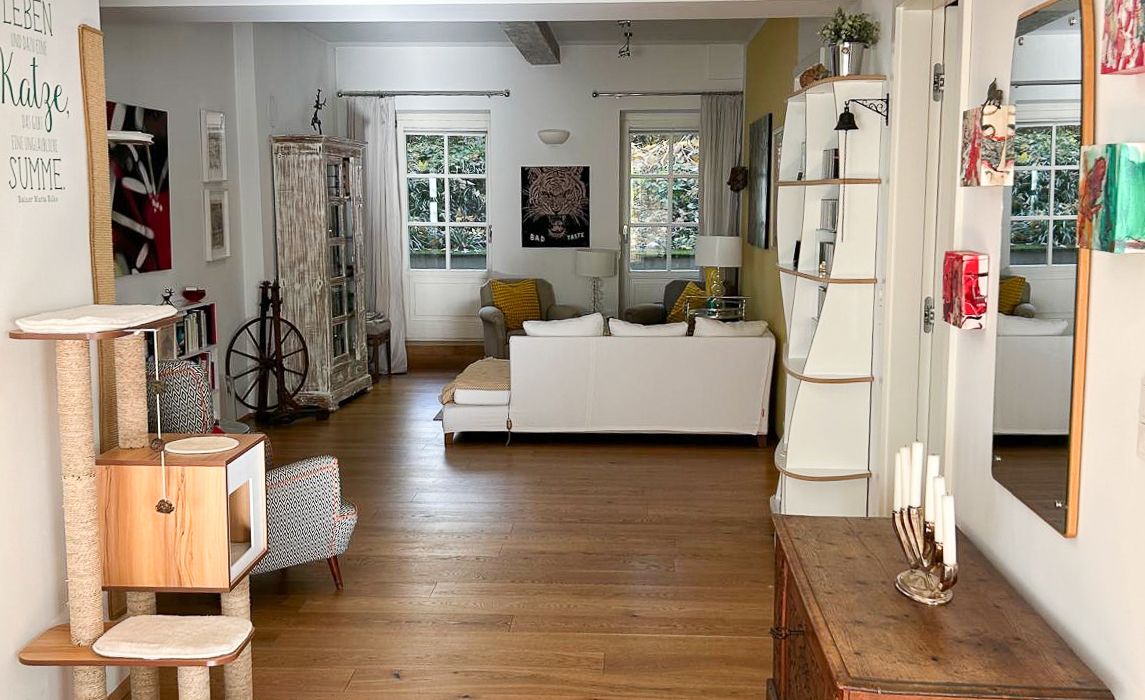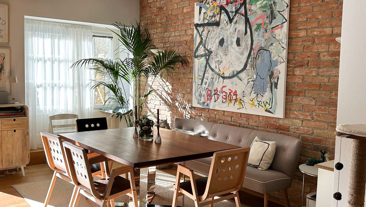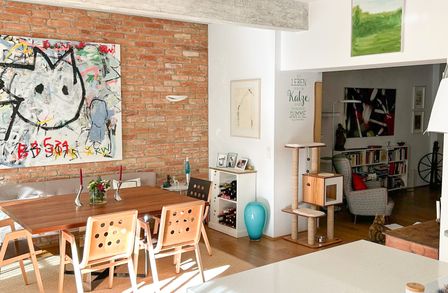 Vom einladenden Vorraum öffnet sich der Blick in den loftartig gestalteten Wohn-/Essbereich mit integrierter Marken-Einbauküche. Eine charakteristische Ziegelwand verleiht diesem Raum einen warmen, atmosphärischen Akzent.
