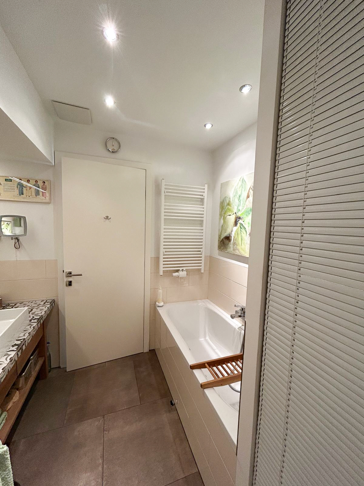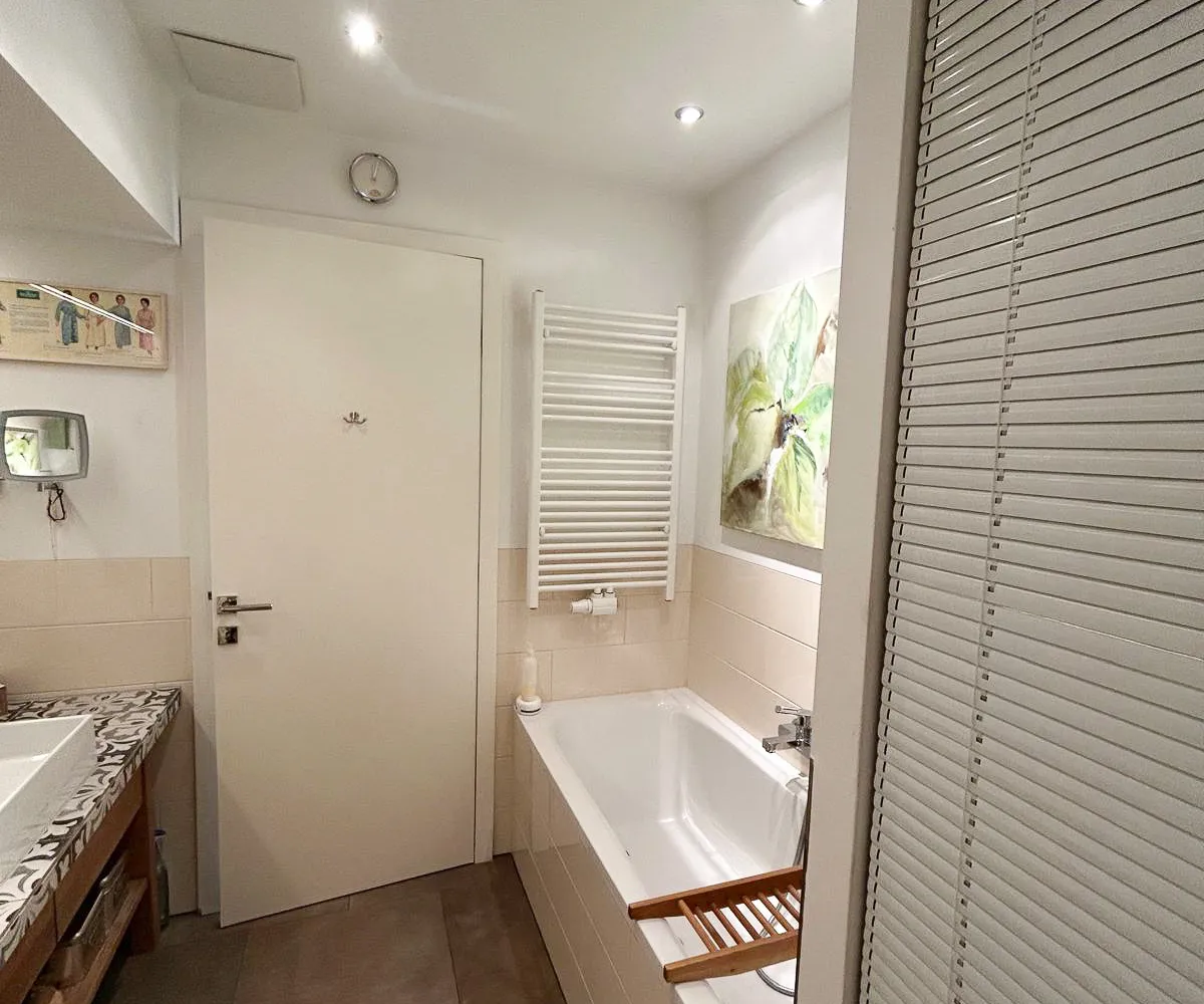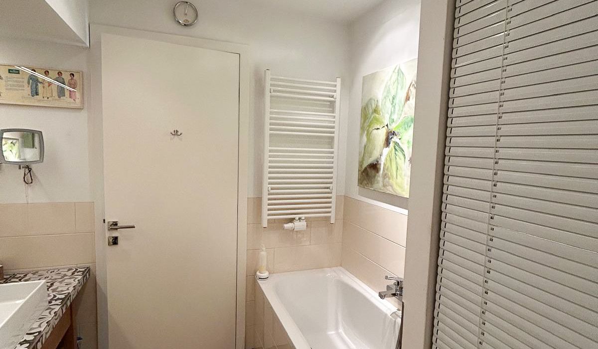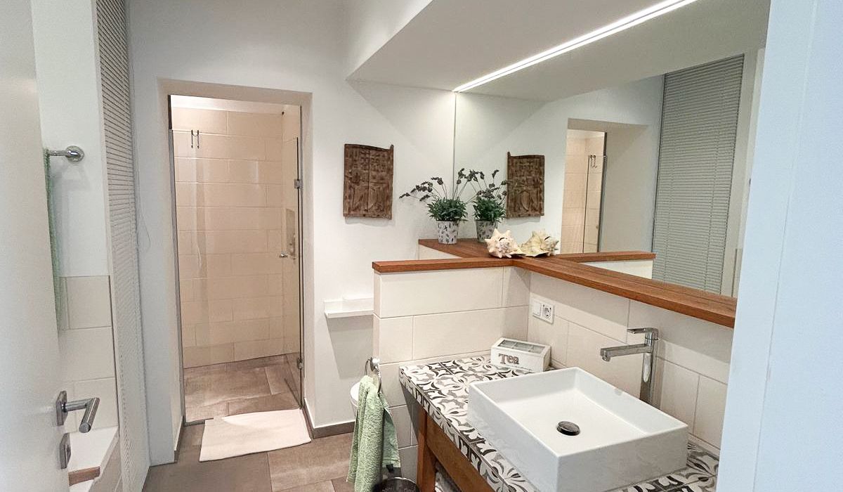Das elegante Badezimmer verfügt über Badewanne, großzügig begehbare Regendusche, Waschtisch, Toilette, Handtuchtrockner sowie Waschmaschinenanschluss.