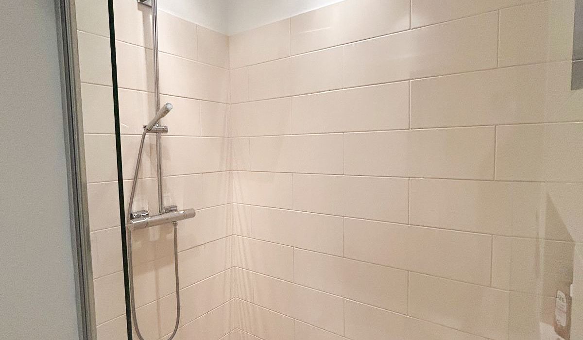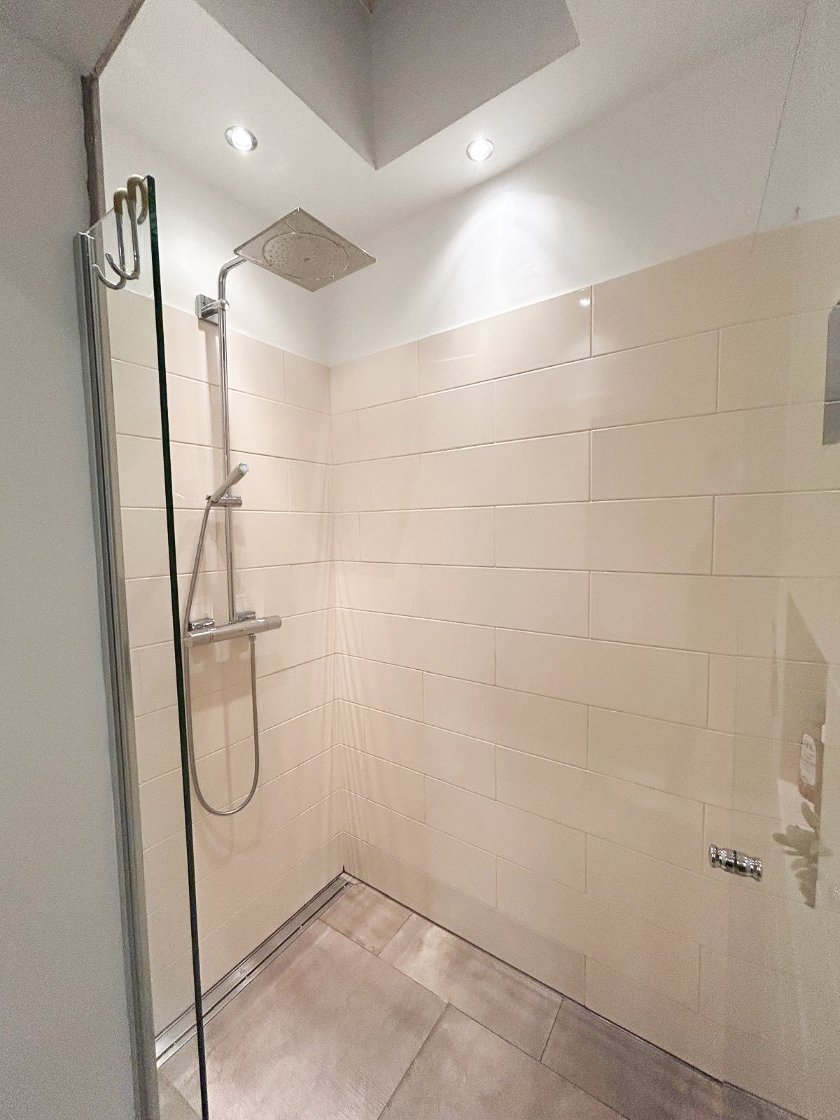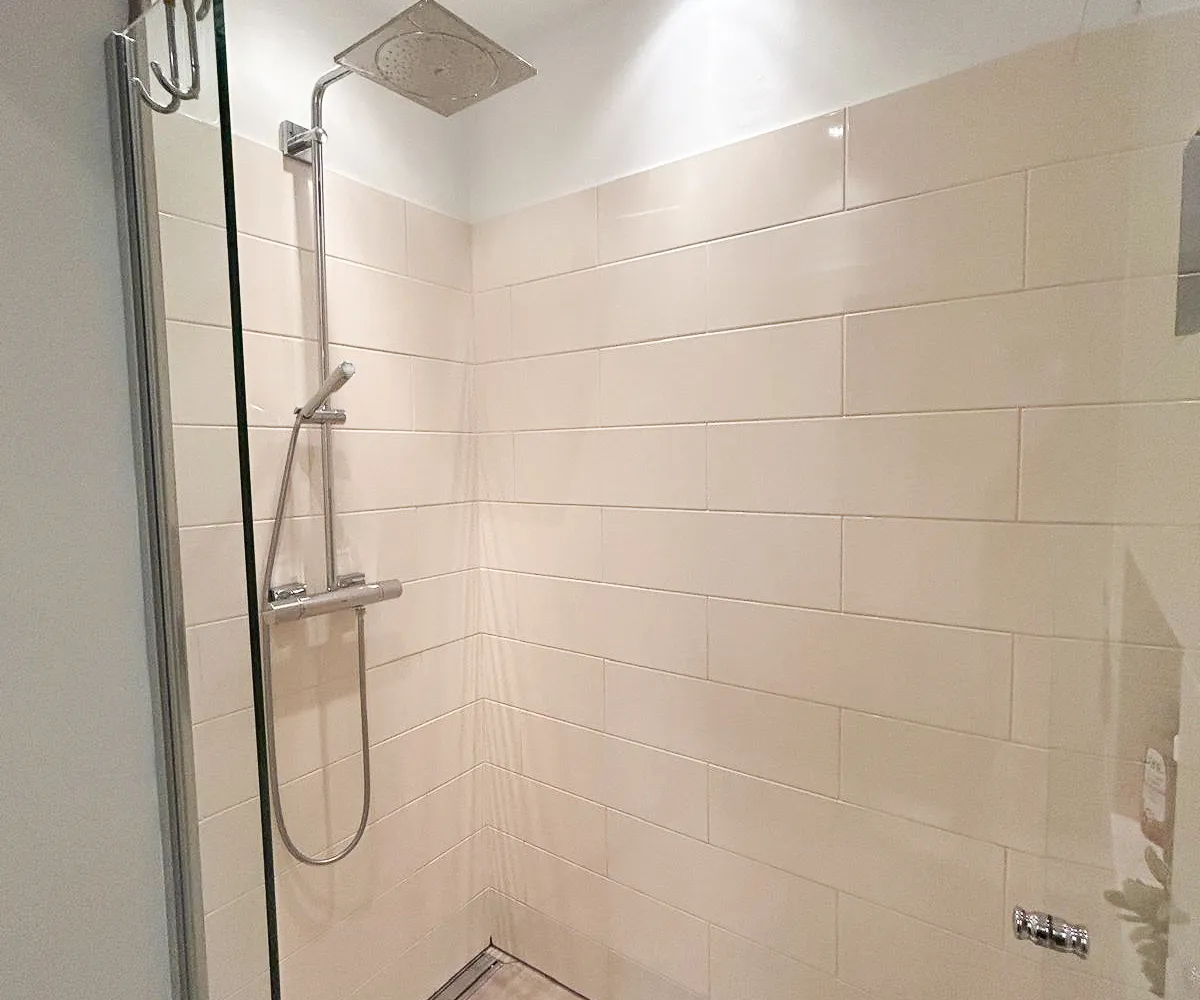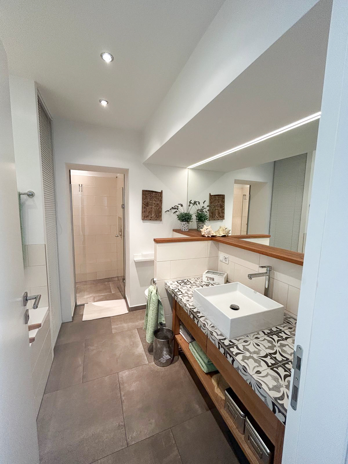 Das elegante Badezimmer verfügt über Badewanne, großzügig begehbare Regendusche, Waschtisch, Toilette, Handtuchtrockner sowie Waschmaschinenanschluss.