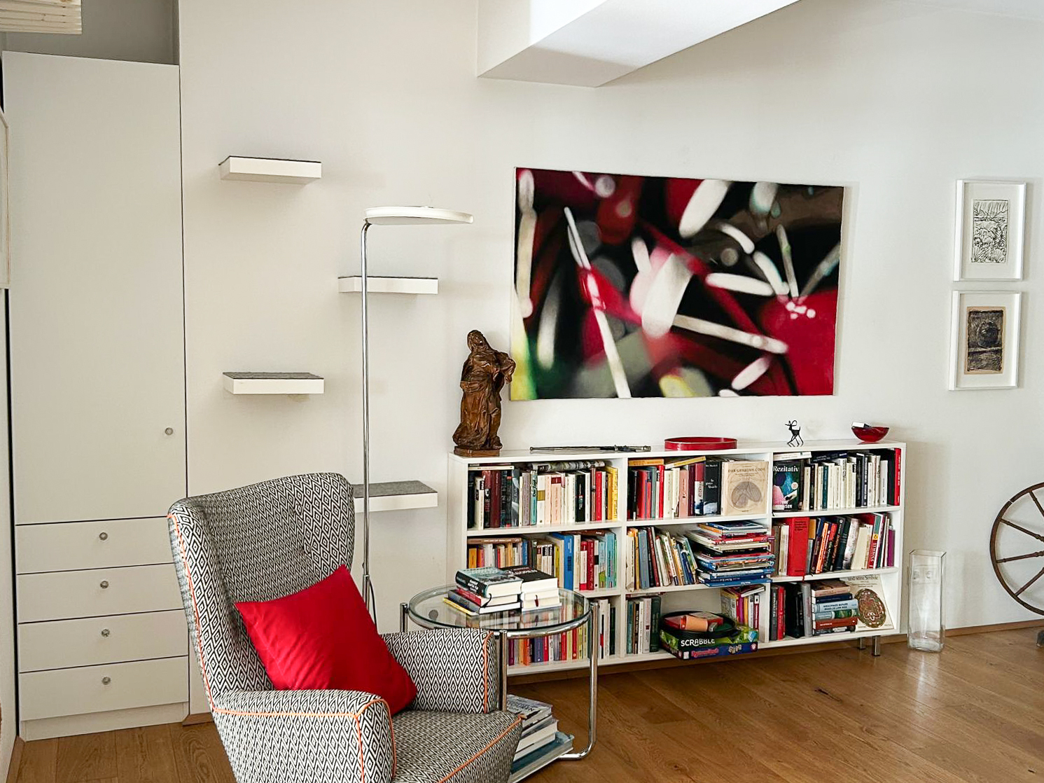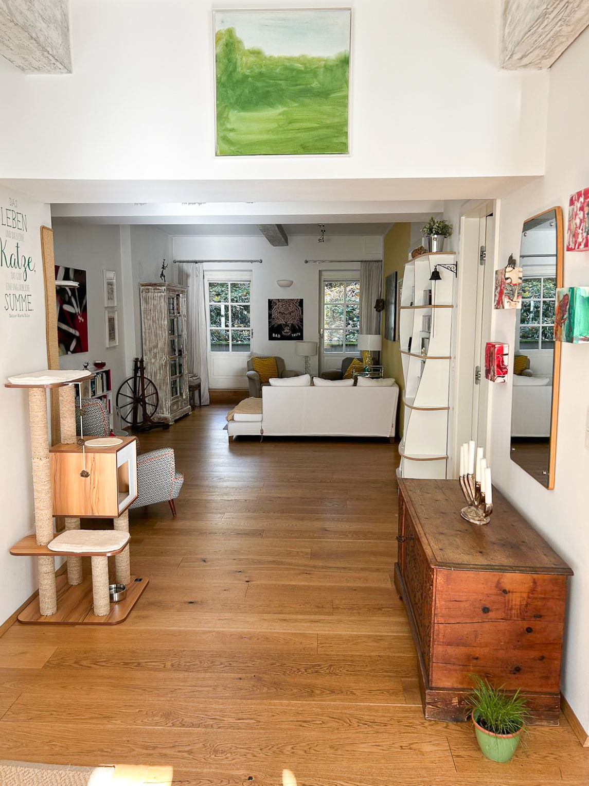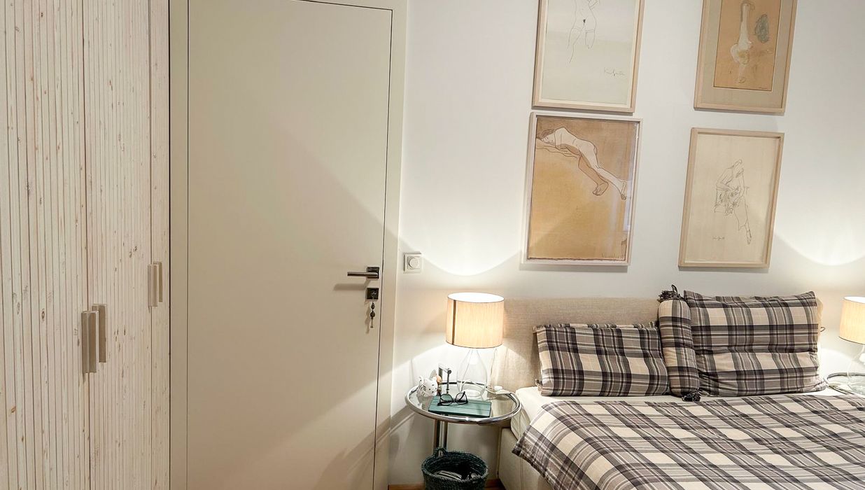 In Wohn- und Schlafraum wurde ein hochwertiger Eichen-Dielenparkett verlegt, der der Wohnung eine zeitlose Eleganz verleiht. Dimmbar ausgeführte Lichtpunkte an Wand und Decke ermöglichen flexible Beleuchtungssituationen für unterschiedliche Tages- und Wohnmomente.
