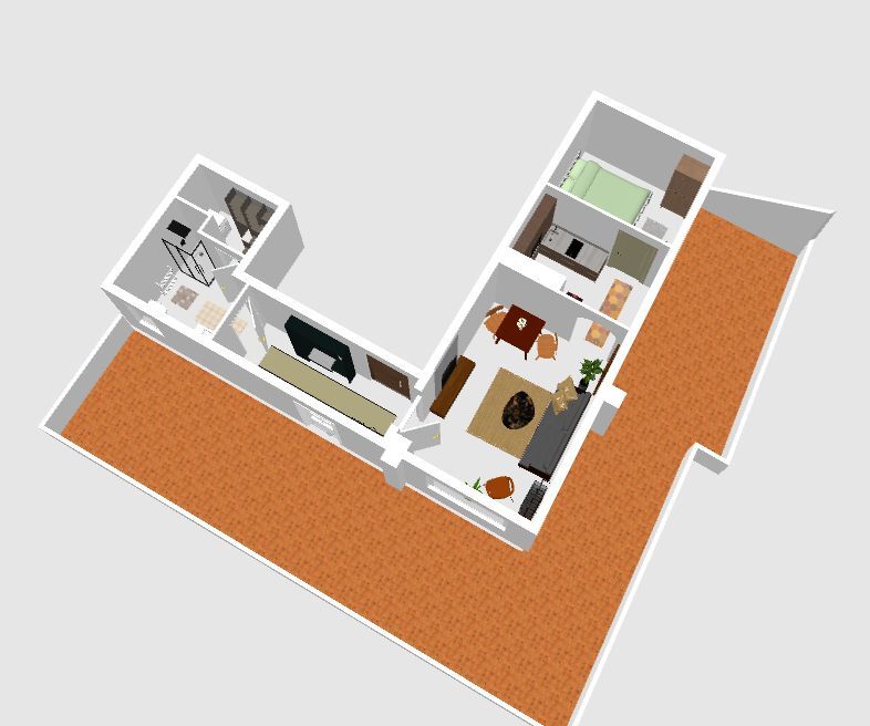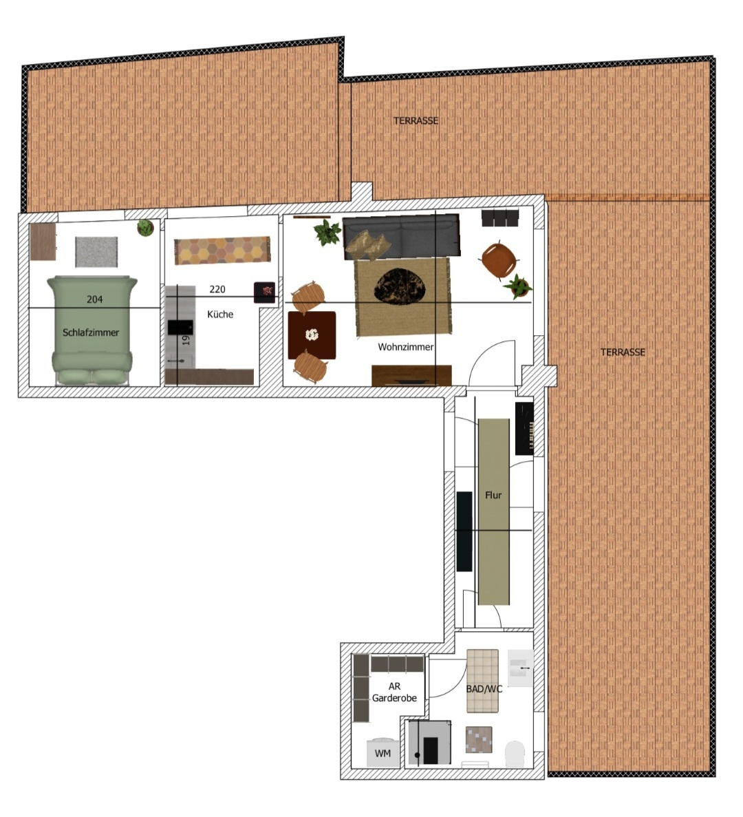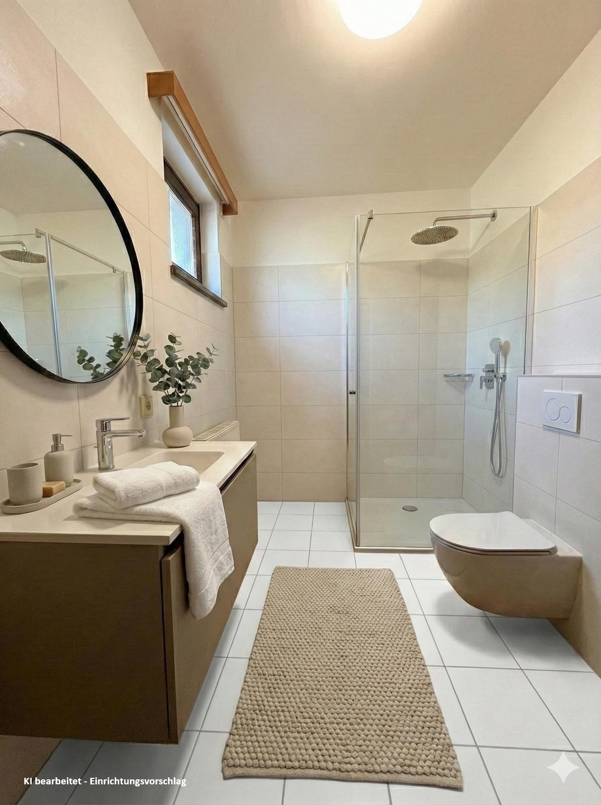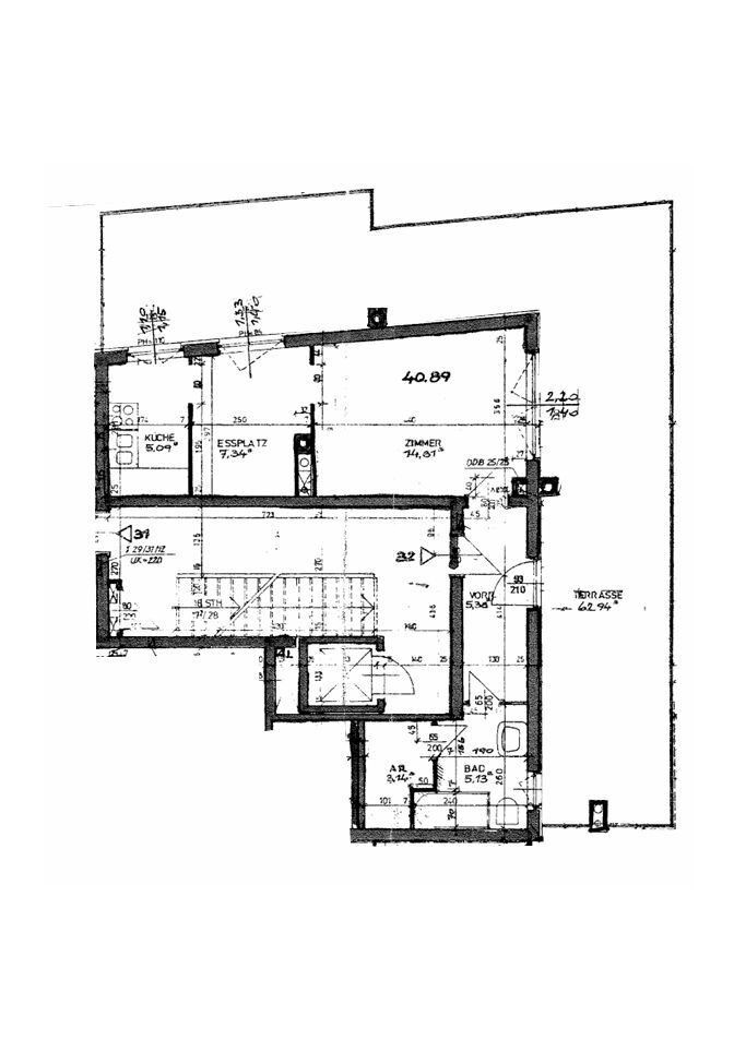 Aktuelle Raumaufteilung: Vorraum mit Ausgang auf die Terrasse, Bad (mit Badewanne, WC, Waschbecken, Heizkörper und Fenster) mit anschließendem Abstellraum, Zimmer, Essplatz, und Küche. Ebenso gehört ein Kellerabteil mit 2,47m² zur Wohnung.