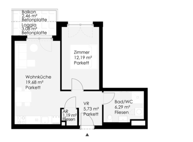 Die Wohnung befindet sich im 6. Obergeschoss und verfügt über eine großzügige Wohnküche mit vollausgestatteter Einbauküche, ein Schlafzimmer, ein Badezimmer mit Dusche und Waschmaschinenanschluss, , ein separates WC, sowie einen Abstellraum und einen Vorraum.