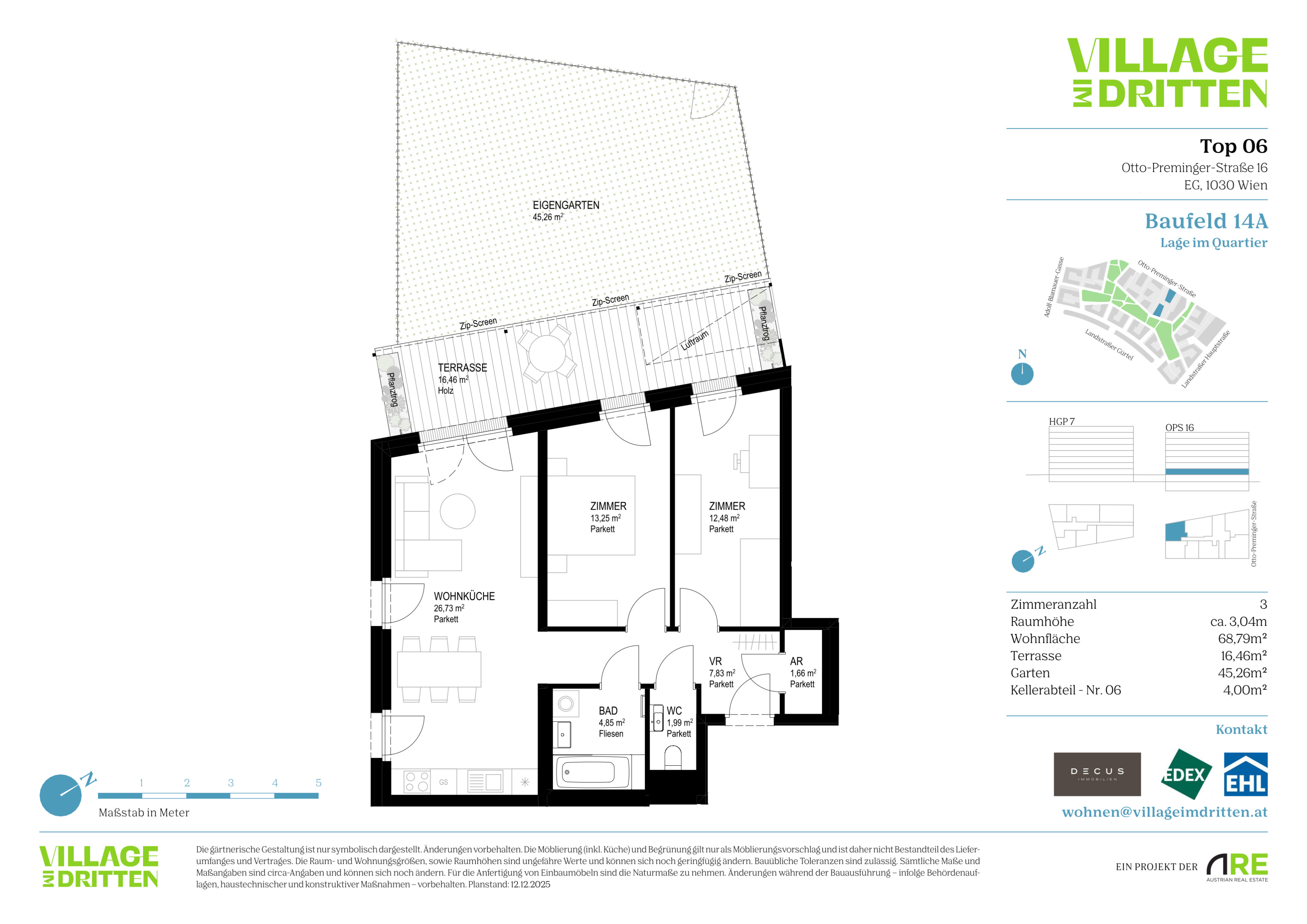 Im dritten Wiener Gemeindebezirk entsteht mit dem VILLAGE IM DRITTEN ein neues Stück Stadt – eines der größten Stadtentwicklungsgebiete Wiens. Auf über elf Hektar entwickelt die ARE Austrian Real Estate gemeinsam mit der Stadt Wien und dem wohnfonds_wien ein lebendiges, nahezu autofreies Quartier mit rund 2.000 W ohnungen, Büro- und Gewerbeflächen, Kinderbetreuung, Bildungseinrichtungen und Nahversorgung. Das grüne Herz bildet der über 2 Hektar große Bert-Brecht-Park –eine Oase für Erholung, Begegnung und Spiel. Alle Däche r , die nicht begehbar sind, werden begrünt. Sharing- Angebote, Einkaufsmöglichkeiten und Gastronomie liegen direkt vor der Haustüre. Nachhaltigkeit, kurze W ege und hohe Lebensqualität sind die Leitlinien dieses neuen Stadtviertels.