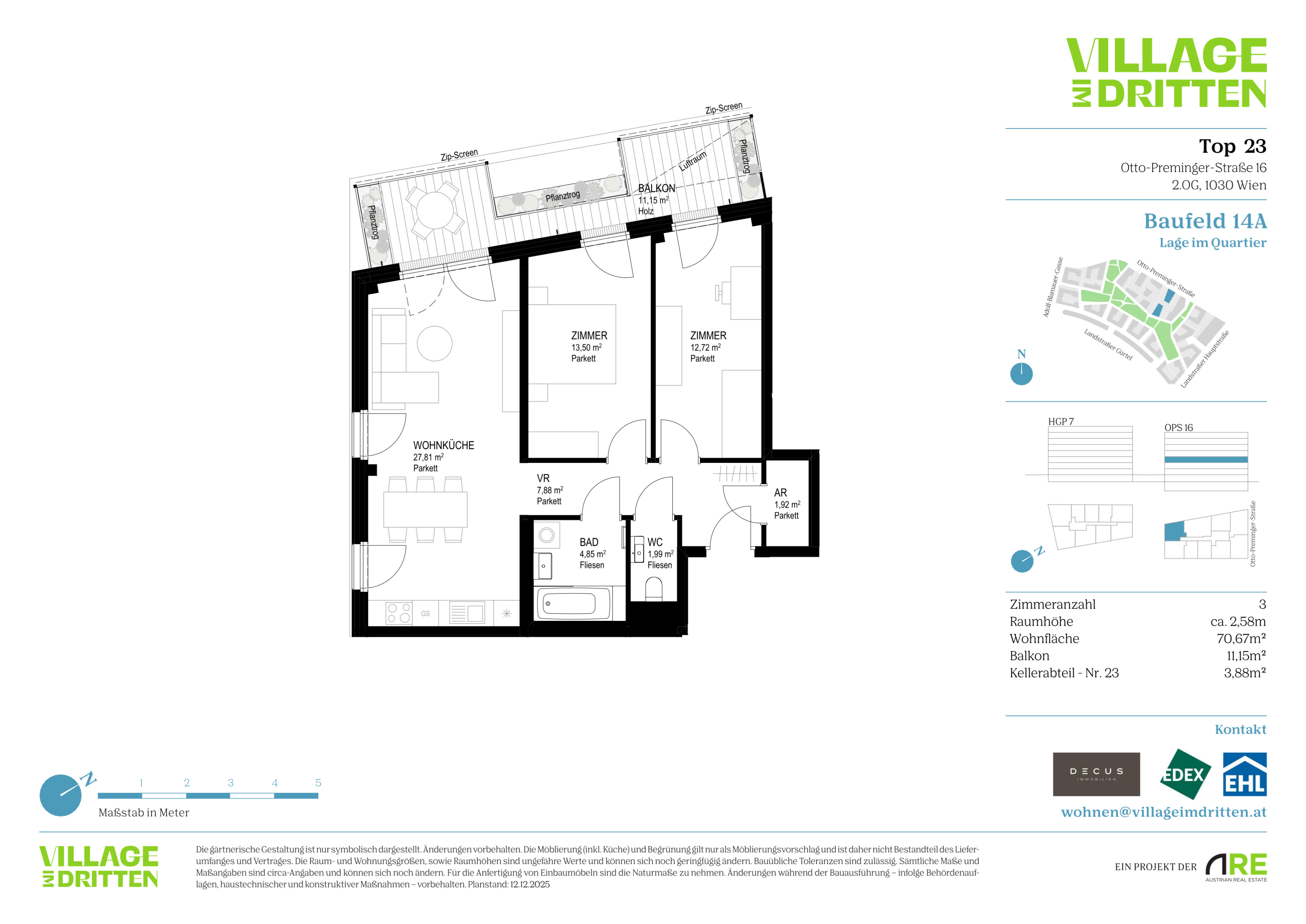 Im dritten Wiener Gemeindebezirk entsteht mit dem VILLAGE IM DRITTEN ein neues Stück Stadt – eines der größten Stadtentwicklungsgebiete Wiens. Auf über elf Hektar entwickelt die ARE Austrian Real Estate gemeinsam mit der Stadt Wien und dem wohnfonds_wien ein lebendiges, nahezu autofreies Quartier mit rund 2.000 W ohnungen, Büro- und Gewerbeflächen, Kinderbetreuung, Bildungseinrichtungen und Nahversorgung. Das grüne Herz bildet der über 2 Hektar große Bert-Brecht-Park –eine Oase für Erholung, Begegnung und Spiel. Alle Däche r , die nicht begehbar sind, werden begrünt. Sharing- Angebote, Einkaufsmöglichkeiten und Gastronomie liegen direkt vor der Haustüre. Nachhaltigkeit, kurze W ege und hohe Lebensqualität sind die Leitlinien dieses neuen Stadtviertels.