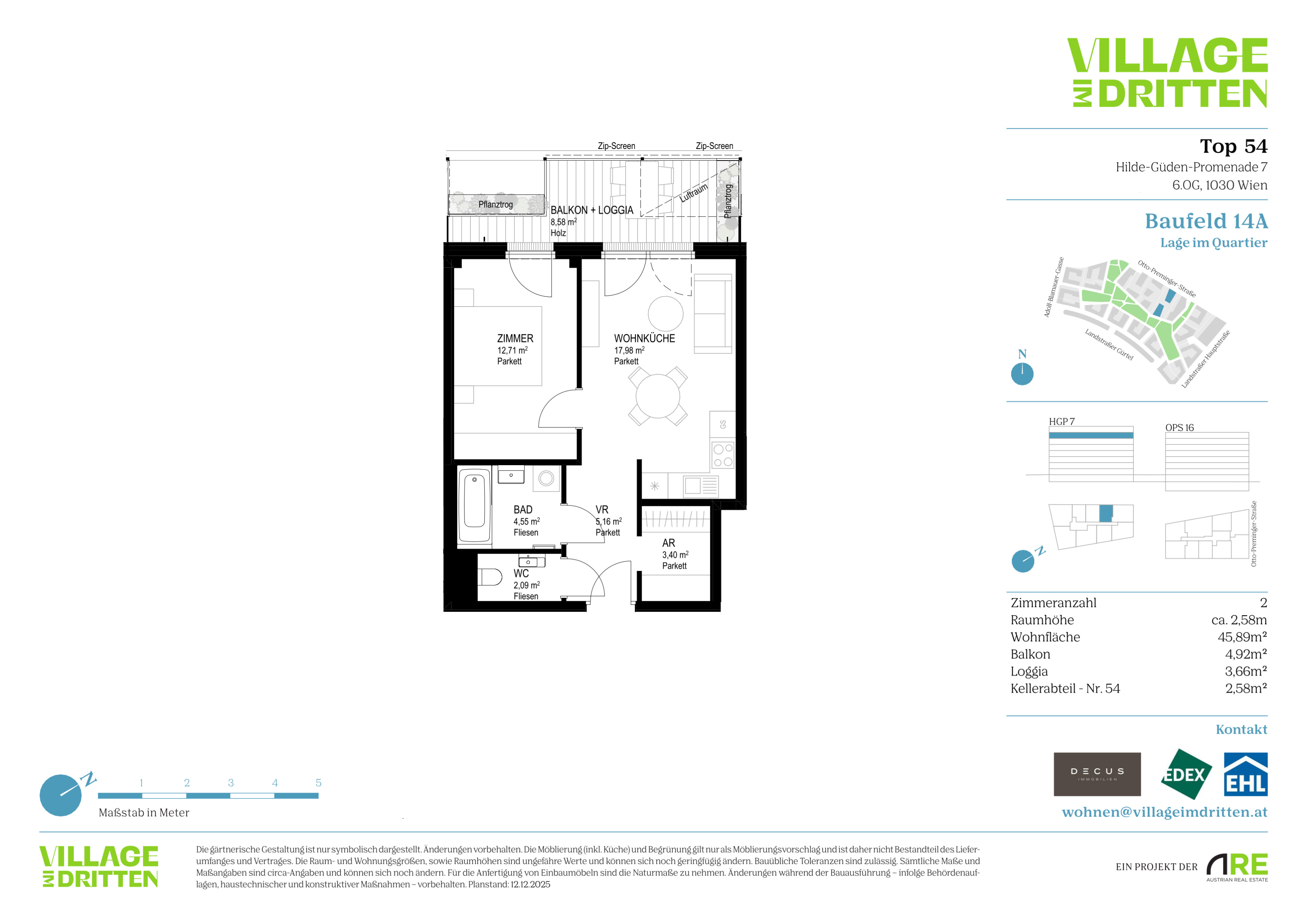 Im dritten Wiener Gemeindebezirk entsteht mit dem VILLAGE IM DRITTEN ein neues Stück Stadt – eines der größten Stadtentwicklungsgebiete Wiens. Auf über elf Hektar entwickelt die ARE Austrian Real Estate gemeinsam mit der Stadt Wien und dem wohnfonds_wien ein lebendiges, nahezu autofreies Quartier mit rund 2.000 W ohnungen, Büro- und Gewerbeflächen, Kinderbetreuung, Bildungseinrichtungen und Nahversorgung. Das grüne Herz bildet der über 2 Hektar große Bert-Brecht-Park –eine Oase für Erholung, Begegnung und Spiel. Alle Däche r , die nicht begehbar sind, werden begrünt. Sharing- Angebote, Einkaufsmöglichkeiten und Gastronomie liegen direkt vor der Haustüre. Nachhaltigkeit, kurze W ege und hohe Lebensqualität sind die Leitlinien dieses neuen Stadtviertels.