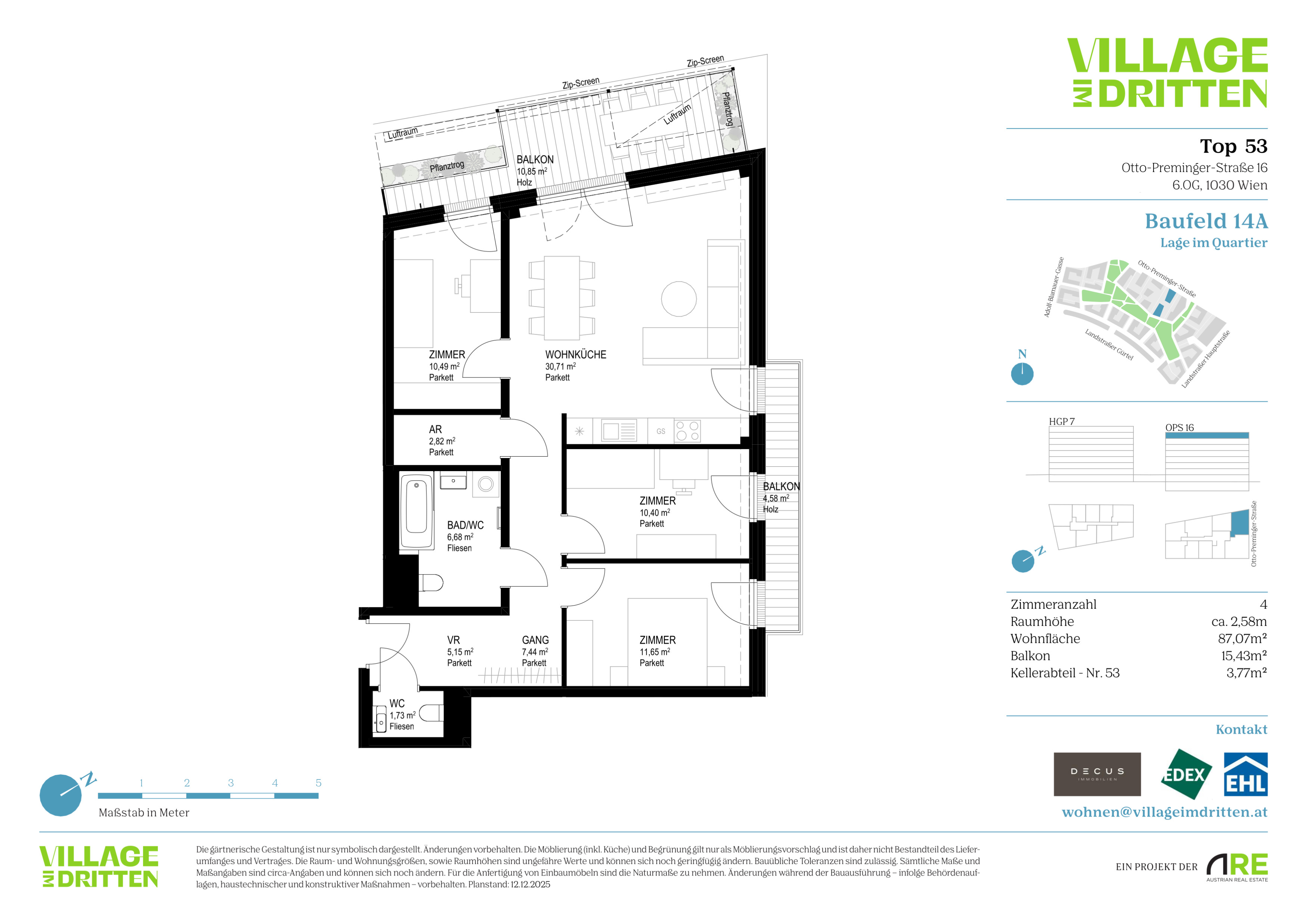 Im dritten Wiener Gemeindebezirk entsteht mit dem VILLAGE IM DRITTEN ein neues Stück Stadt – eines der größten Stadtentwicklungsgebiete Wiens. Auf über elf Hektar entwickelt die ARE Austrian Real Estate gemeinsam mit der Stadt Wien und dem wohnfonds_wien ein lebendiges, nahezu autofreies Quartier mit rund 2.000 W ohnungen, Büro- und Gewerbeflächen, Kinderbetreuung, Bildungseinrichtungen und Nahversorgung. Das grüne Herz bildet der über 2 Hektar große Bert-Brecht-Park –eine Oase für Erholung, Begegnung und Spiel. Alle Däche r , die nicht begehbar sind, werden begrünt. Sharing- Angebote, Einkaufsmöglichkeiten und Gastronomie liegen direkt vor der Haustüre. Nachhaltigkeit, kurze W ege und hohe Lebensqualität sind die Leitlinien dieses neuen Stadtviertels.