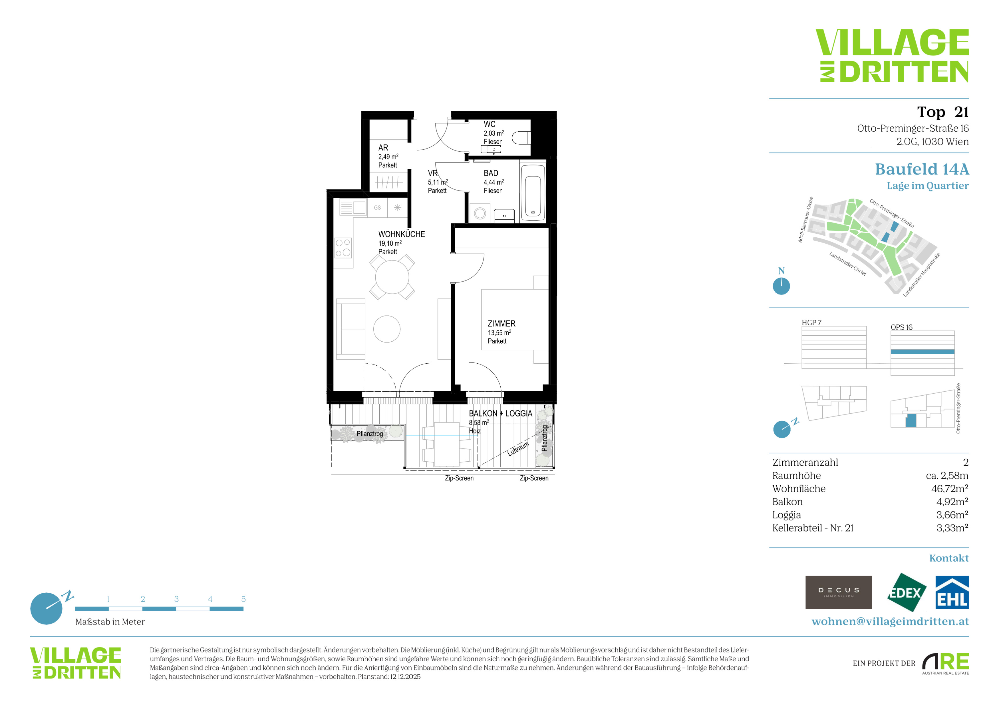 Im dritten Wiener Gemeindebezirk entsteht mit dem VILLAGE IM DRITTEN ein neues Stück Stadt – eines der größten Stadtentwicklungsgebiete Wiens. Auf über elf Hektar entwickelt die ARE Austrian Real Estate gemeinsam mit der Stadt Wien und dem wohnfonds_wien ein lebendiges, nahezu autofreies Quartier mit rund 2.000 W ohnungen, Büro- und Gewerbeflächen, Kinderbetreuung, Bildungseinrichtungen und Nahversorgung. Das grüne Herz bildet der über 2 Hektar große Bert-Brecht-Park –eine Oase für Erholung, Begegnung und Spiel. Alle Däche r , die nicht begehbar sind, werden begrünt. Sharing- Angebote, Einkaufsmöglichkeiten und Gastronomie liegen direkt vor der Haustüre. Nachhaltigkeit, kurze W ege und hohe Lebensqualität sind die Leitlinien dieses neuen Stadtviertels.