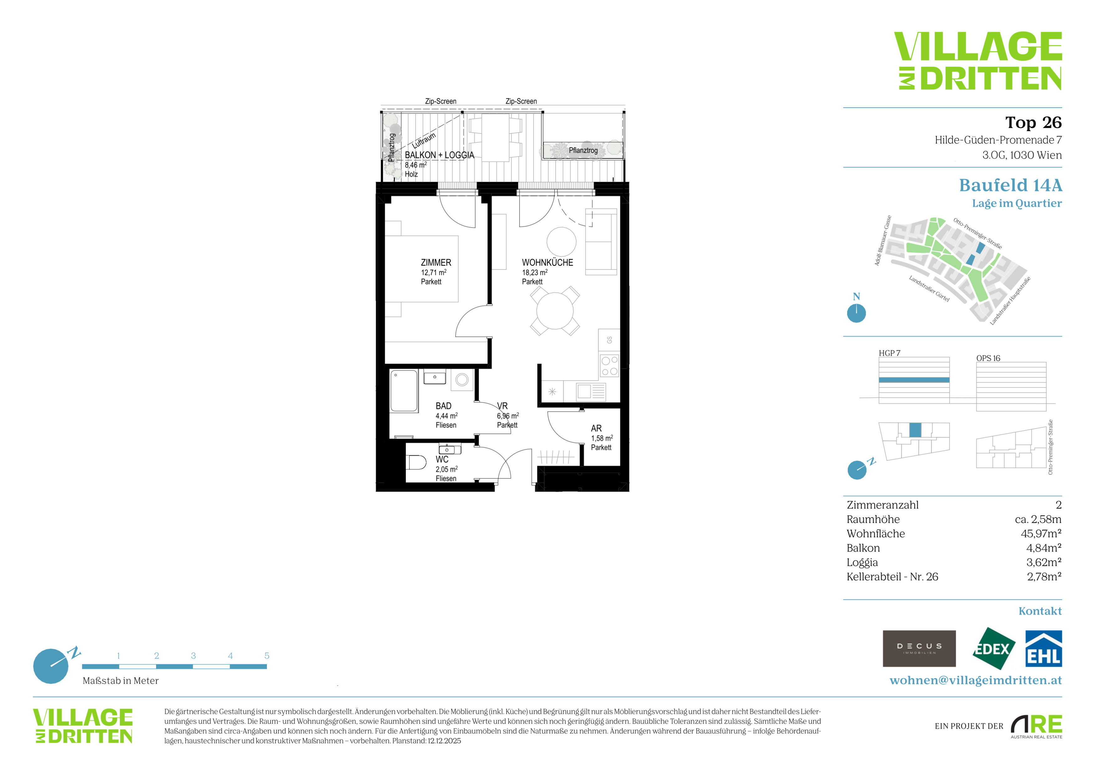 Im dritten Wiener Gemeindebezirk entsteht mit dem VILLAGE IM DRITTEN ein neues Stück Stadt – eines der größten Stadtentwicklungsgebiete Wiens. Auf über elf Hektar entwickelt die ARE Austrian Real Estate gemeinsam mit der Stadt Wien und dem wohnfonds_wien ein lebendiges, nahezu autofreies Quartier mit rund 2.000 W ohnungen, Büro- und Gewerbeflächen, Kinderbetreuung, Bildungseinrichtungen und Nahversorgung. Das grüne Herz bildet der über 2 Hektar große Bert-Brecht-Park –eine Oase für Erholung, Begegnung und Spiel. Alle Däche r , die nicht begehbar sind, werden begrünt. Sharing- Angebote, Einkaufsmöglichkeiten und Gastronomie liegen direkt vor der Haustüre. Nachhaltigkeit, kurze W ege und hohe Lebensqualität sind die Leitlinien dieses neuen Stadtviertels.