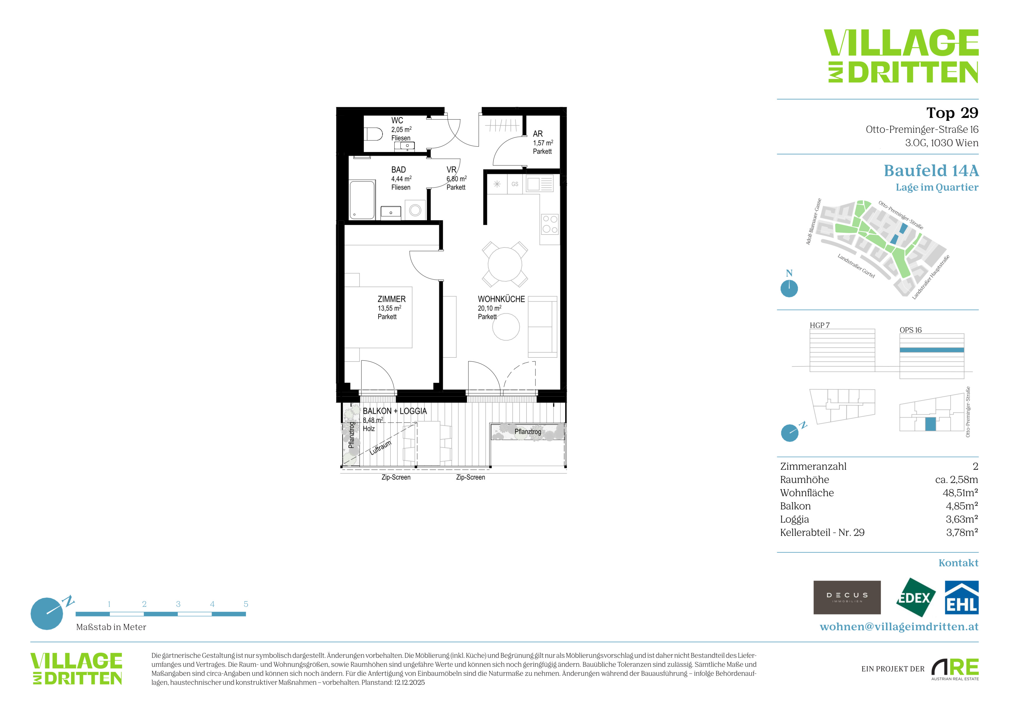 Im dritten Wiener Gemeindebezirk entsteht mit dem VILLAGE IM DRITTEN ein neues Stück Stadt – eines der größten Stadtentwicklungsgebiete Wiens. Auf über elf Hektar entwickelt die ARE Austrian Real Estate gemeinsam mit der Stadt Wien und dem wohnfonds_wien ein lebendiges, nahezu autofreies Quartier mit rund 2.000 W ohnungen, Büro- und Gewerbeflächen, Kinderbetreuung, Bildungseinrichtungen und Nahversorgung. Das grüne Herz bildet der über 2 Hektar große Bert-Brecht-Park –eine Oase für Erholung, Begegnung und Spiel. Alle Däche r , die nicht begehbar sind, werden begrünt. Sharing- Angebote, Einkaufsmöglichkeiten und Gastronomie liegen direkt vor der Haustüre. Nachhaltigkeit, kurze W ege und hohe Lebensqualität sind die Leitlinien dieses neuen Stadtviertels.