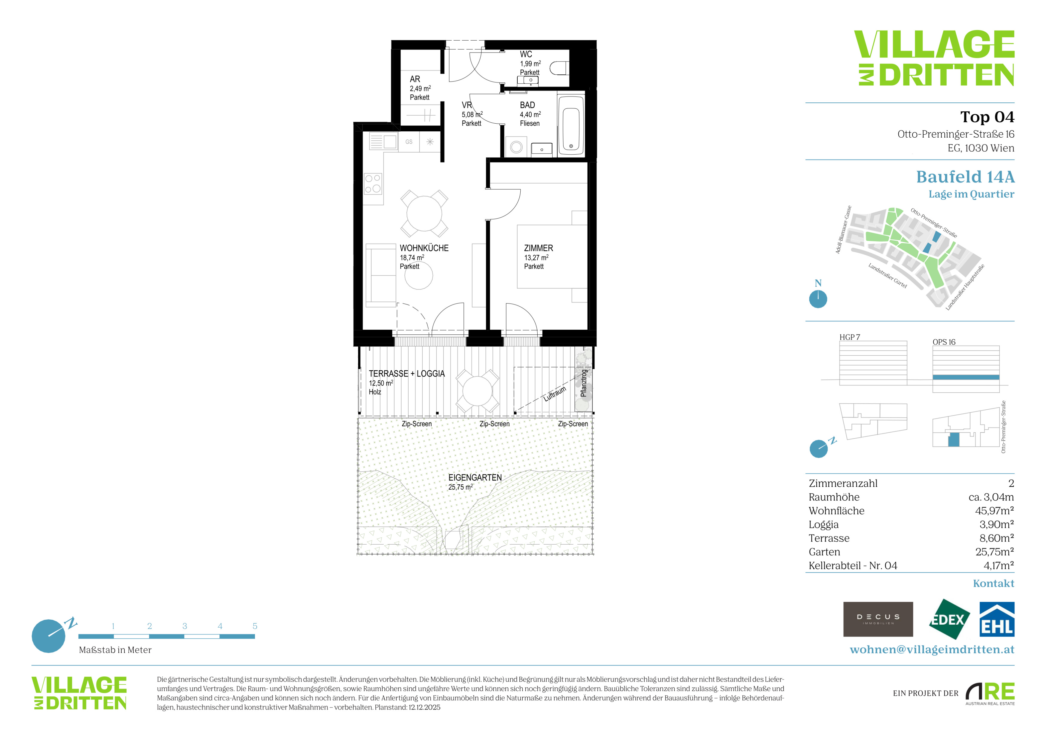 Im dritten Wiener Gemeindebezirk entsteht mit dem VILLAGE IM DRITTEN ein neues Stück Stadt – eines der größten Stadtentwicklungsgebiete Wiens. Auf über elf Hektar entwickelt die ARE Austrian Real Estate gemeinsam mit der Stadt Wien und dem wohnfonds_wien ein lebendiges, nahezu autofreies Quartier mit rund 2.000 W ohnungen, Büro- und Gewerbeflächen, Kinderbetreuung, Bildungseinrichtungen und Nahversorgung. Das grüne Herz bildet der über 2 Hektar große Bert-Brecht-Park –eine Oase für Erholung, Begegnung und Spiel. Alle Däche r , die nicht begehbar sind, werden begrünt. Sharing- Angebote, Einkaufsmöglichkeiten und Gastronomie liegen direkt vor der Haustüre. Nachhaltigkeit, kurze W ege und hohe Lebensqualität sind die Leitlinien dieses neuen Stadtviertels.