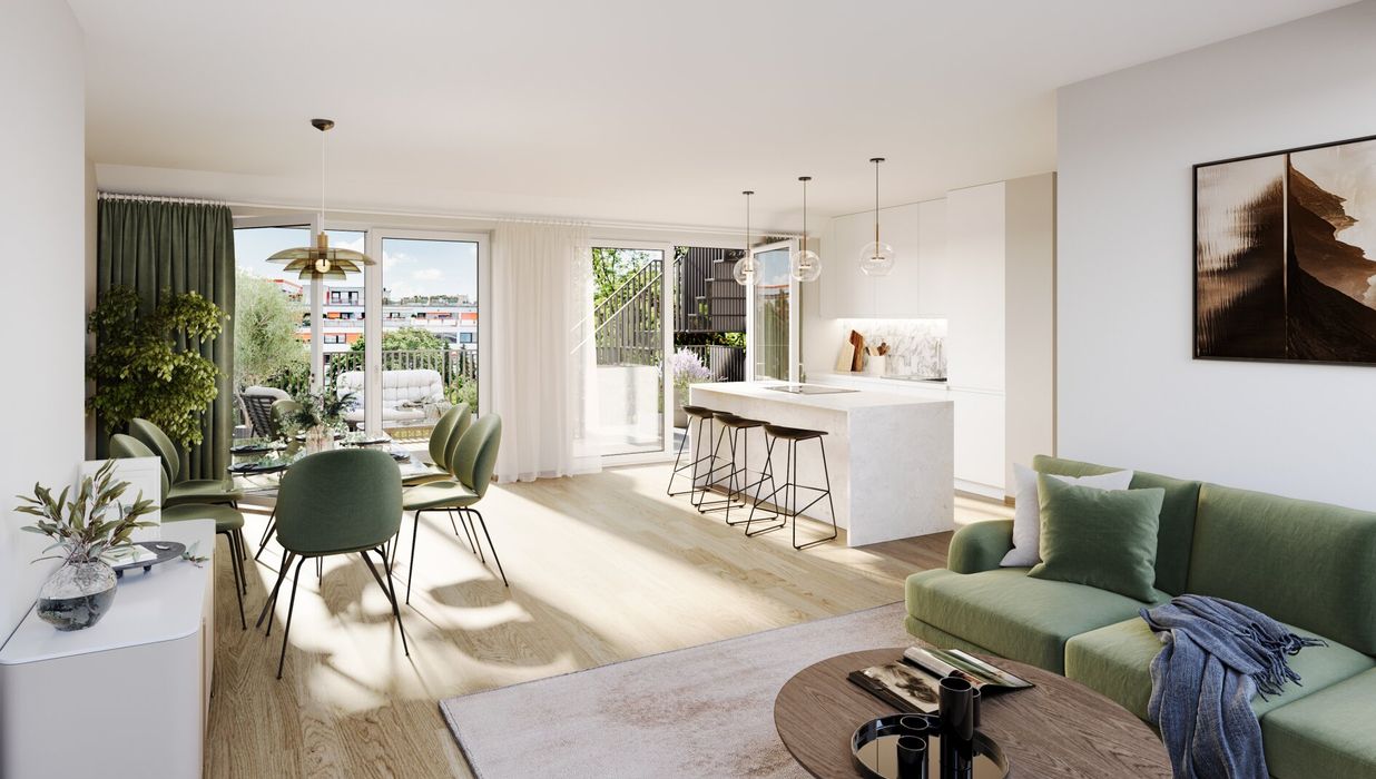 Die Gemeinschaftsplätze mit Bänken und Tischen laden zum entspannten Ver-weilen ein und bieten einen naturnahen Treffpunkt für alle Generationen. Ein einladender Kinderspielbereich bietet unbeschwerte Stunden und glückliche Kindermomente – direkt in der Wohnanlage, sodass die Kinder sorgenfrei und sicher spielen können. Bei der Planung wurde besonderer Wert auf nachhaltige Materialien gelegt.