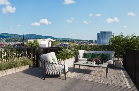 Großzügige private Freiflächen wie Eigengärten, Balkone, Terrassen, Loggien sowie beeindruckende Dachterrassen mit Panoramablick schaffen ein einzigartiges Wohngefühl.