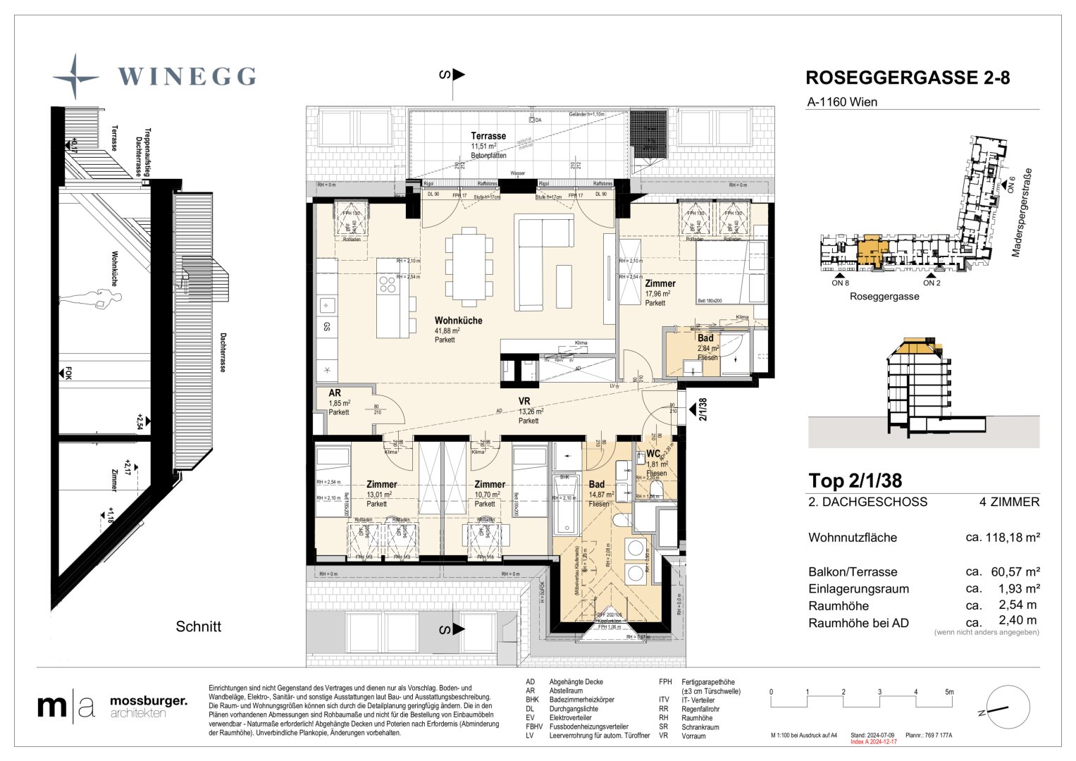 In der Roseggergasse 2–8, nahe des Wilhelminenbergs in 1160 Wien, entstehen insgesamt 124 exklusive Eigentumswohnungen. Die Wohnflächen variieren zwischen 39 und 245 m² und bieten zwischen 2 und 6 Zimmern. Darüber hin-aus bereichern private Freibereiche wie Eigengärten, Balkone, Terrassen, Loggien und spektakuläre Dachterrassen mit Blick auf die umliegenden Wiener Berge das Wohnerlebnis.