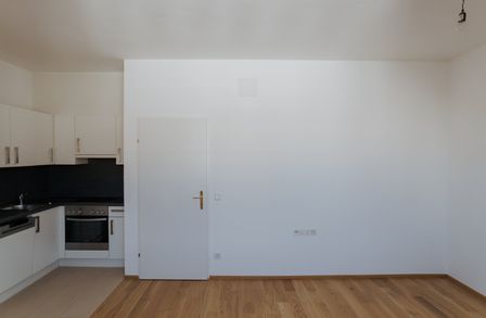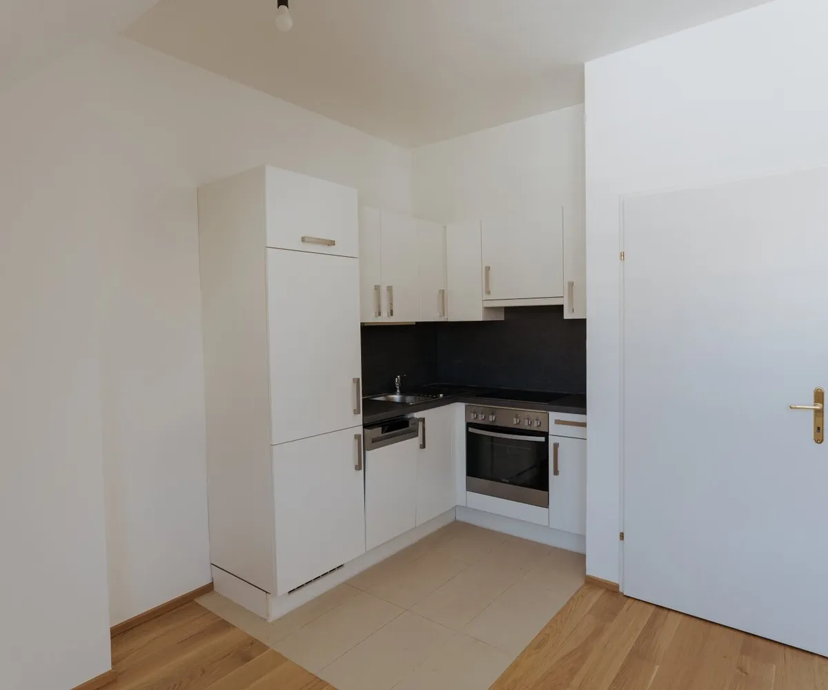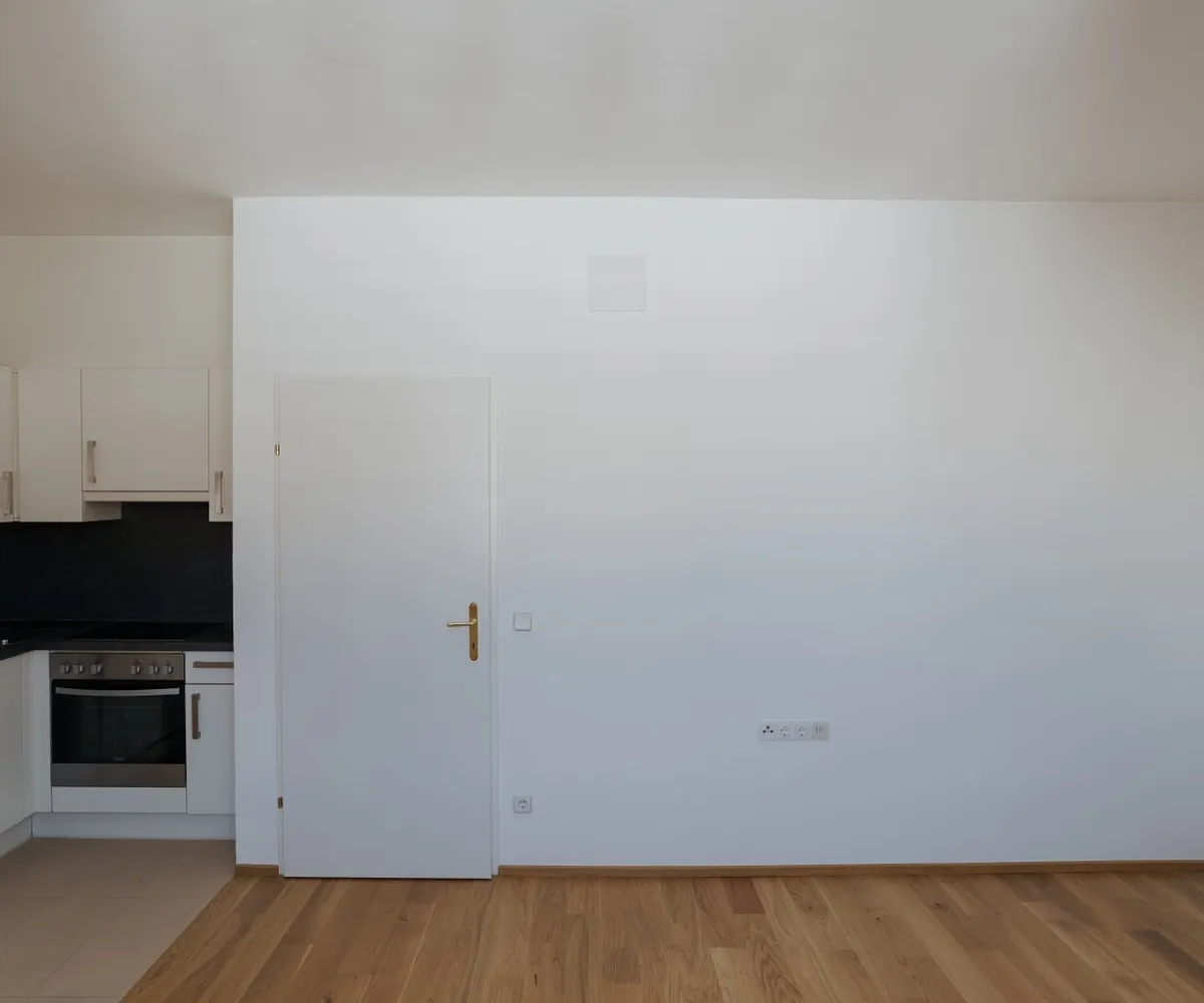 Der offene Wohnbereich mit integrierter Wohnküche ist das Herzstück der Wohnung. Der Parkettboden verleiht dem Raum eine warme Atmosphäre, während große Fenster für viel Tageslicht sorgen.