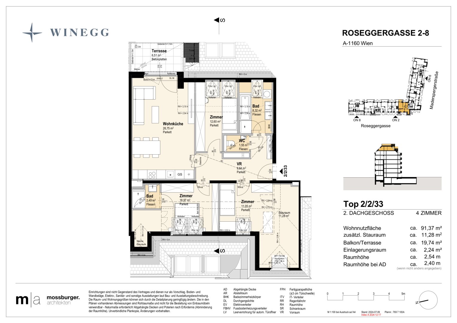 In der Roseggergasse 2–8, nahe des Wilhelminenbergs in 1160 Wien, entstehen insgesamt 124 exklusive Eigentumswohnungen. Die Wohnflächen variieren zwischen 39 und 245 m² und bieten zwischen 2 und 6 Zimmern. Darüber hin-aus bereichern private Freibereiche wie Eigengärten, Balkone, Terrassen, Loggien und spektakuläre Dachterrassen mit Blick auf die umliegenden Wiener Berge das Wohnerlebnis.