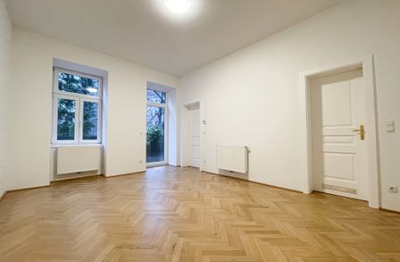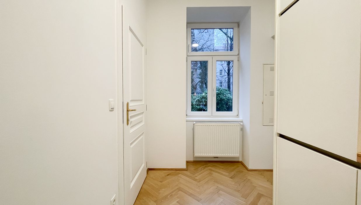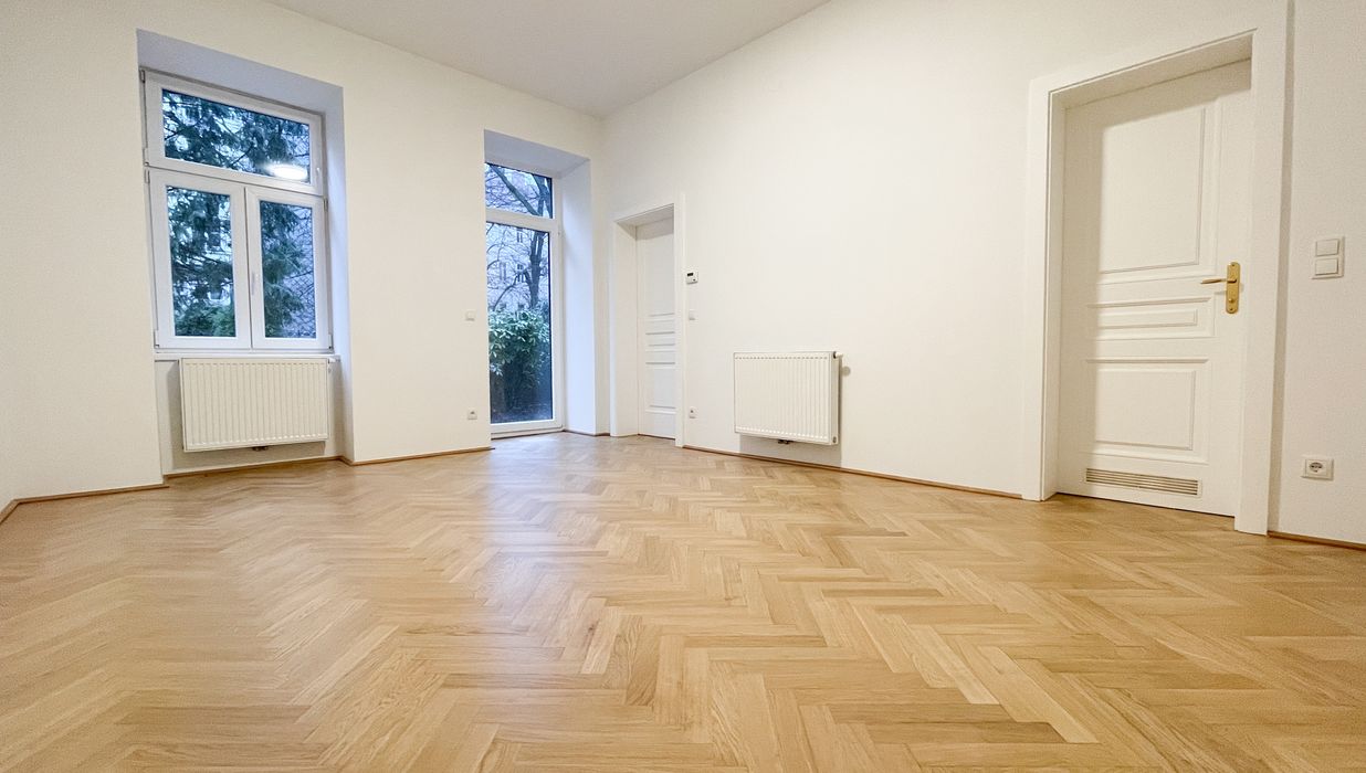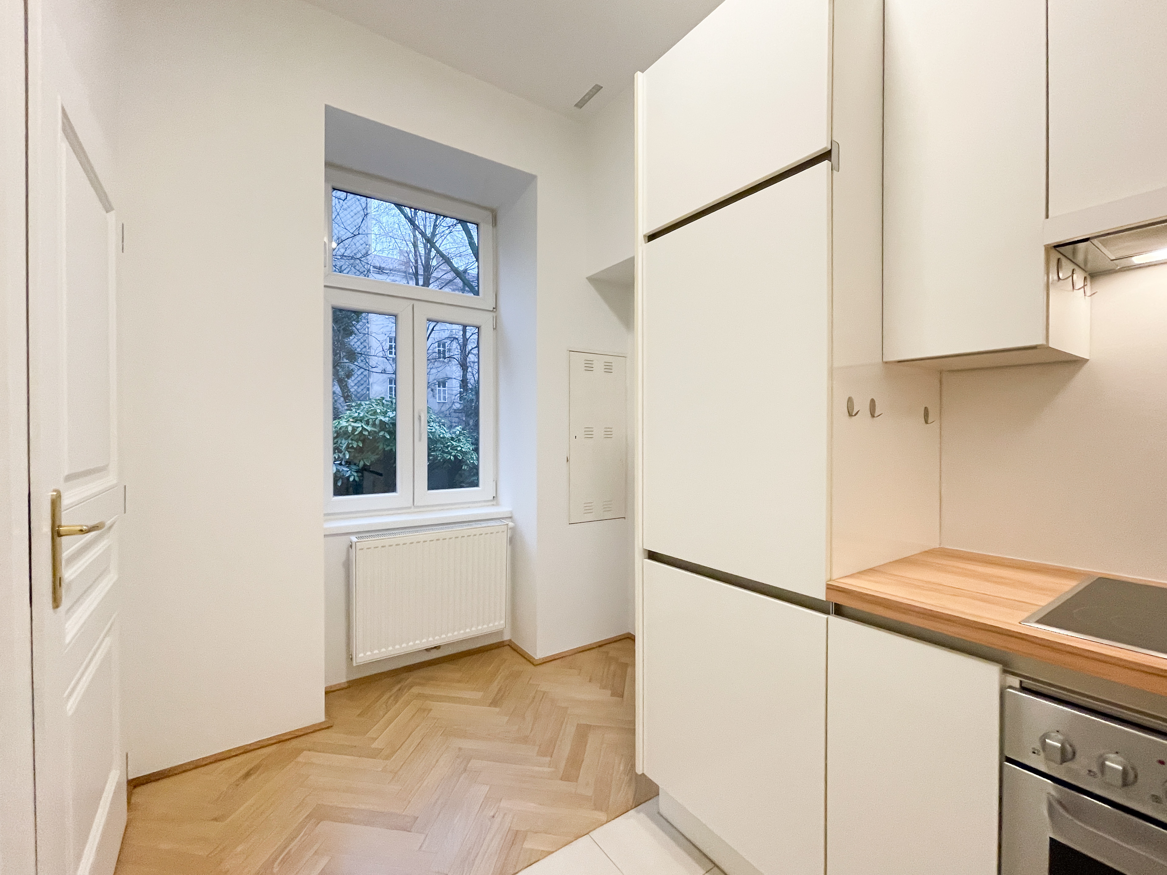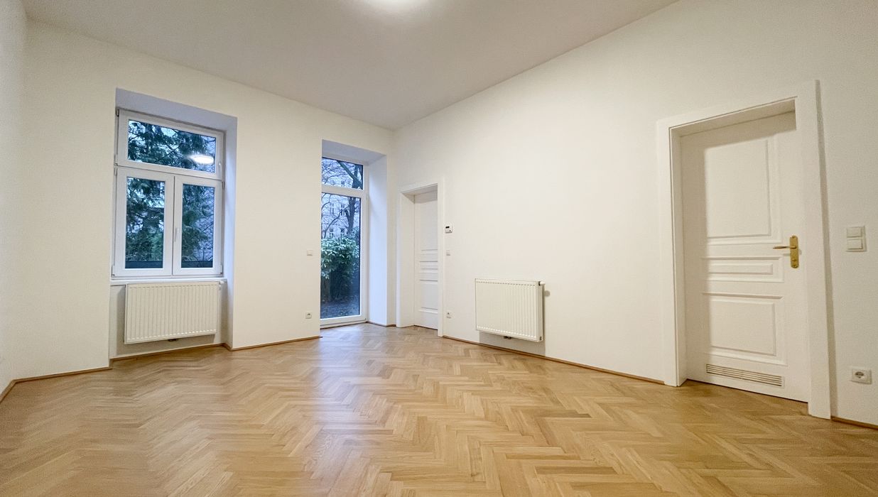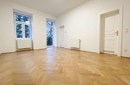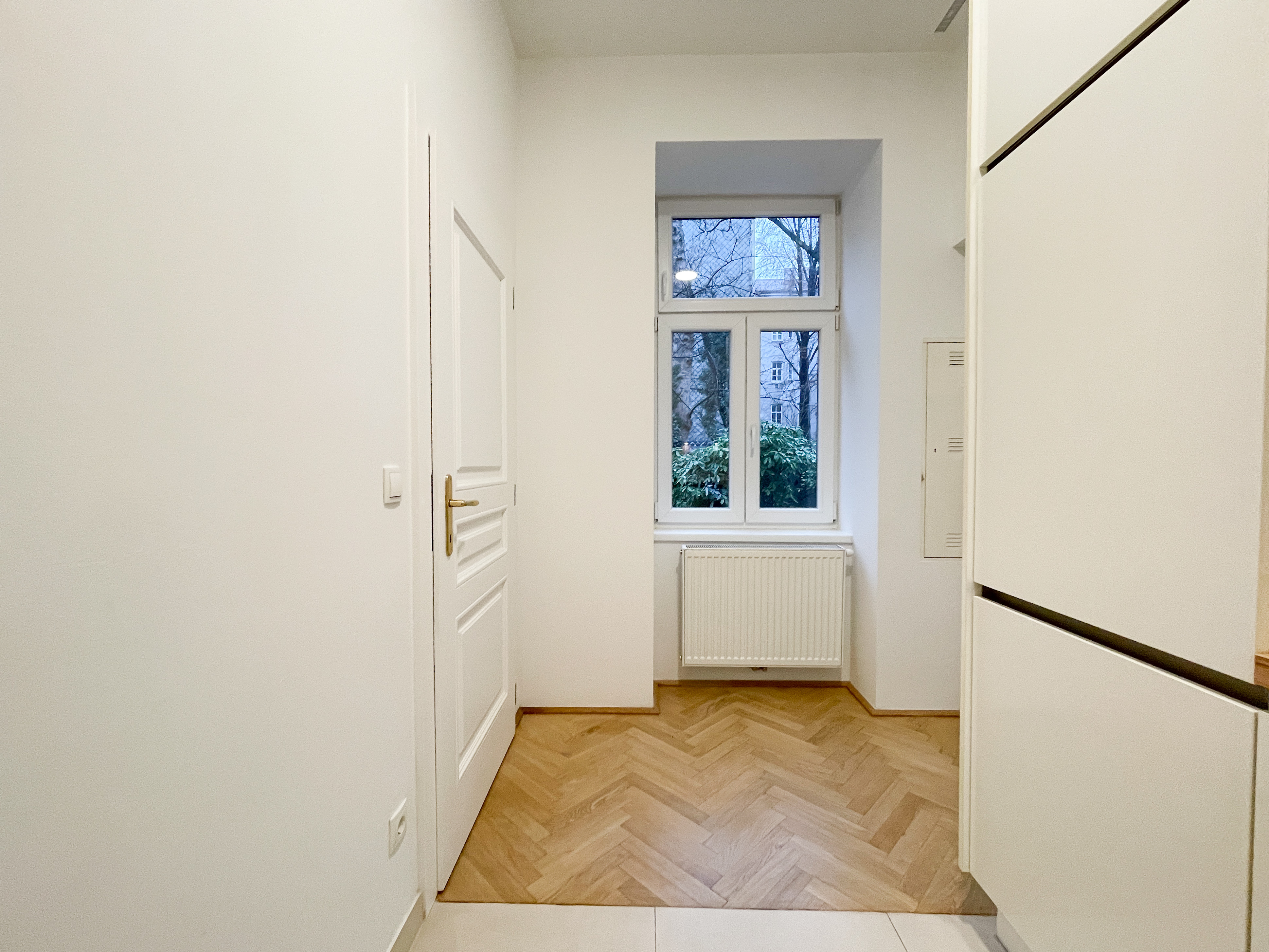 Die Wohnung liegt in einem gepflegten Altbau mit Lift, Post-Empfangsboxen sowie Fahrrad- und Kinderwagenabstellraum. Der Fischgrätparkettboden wurde frisch geschliffen und geölt und unterstreicht den klassischen Altbau-Charme.