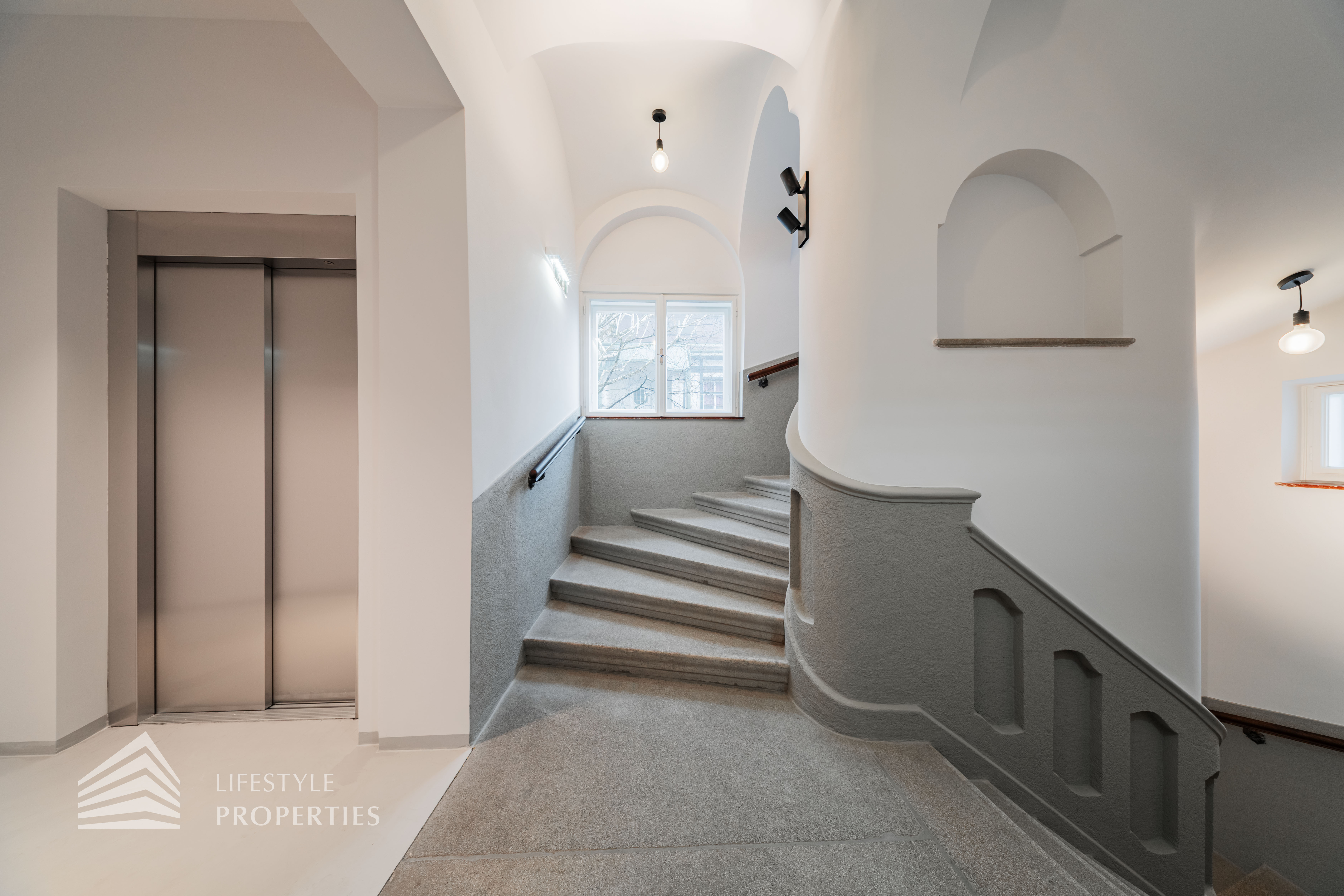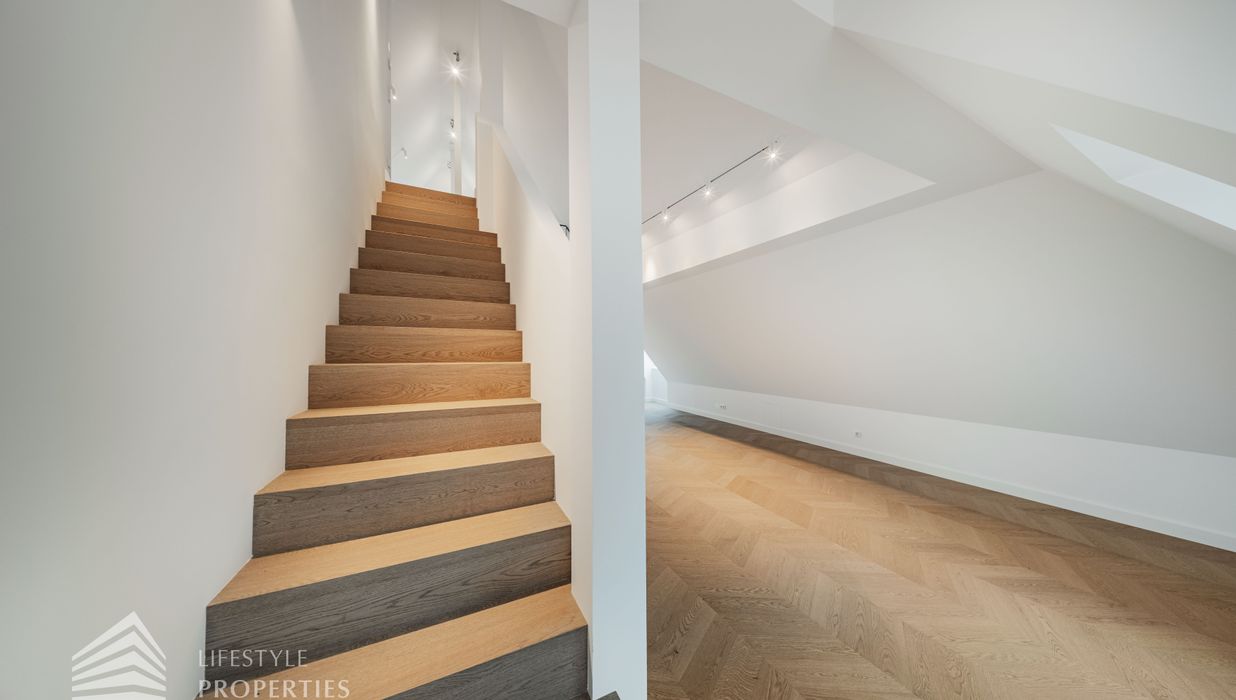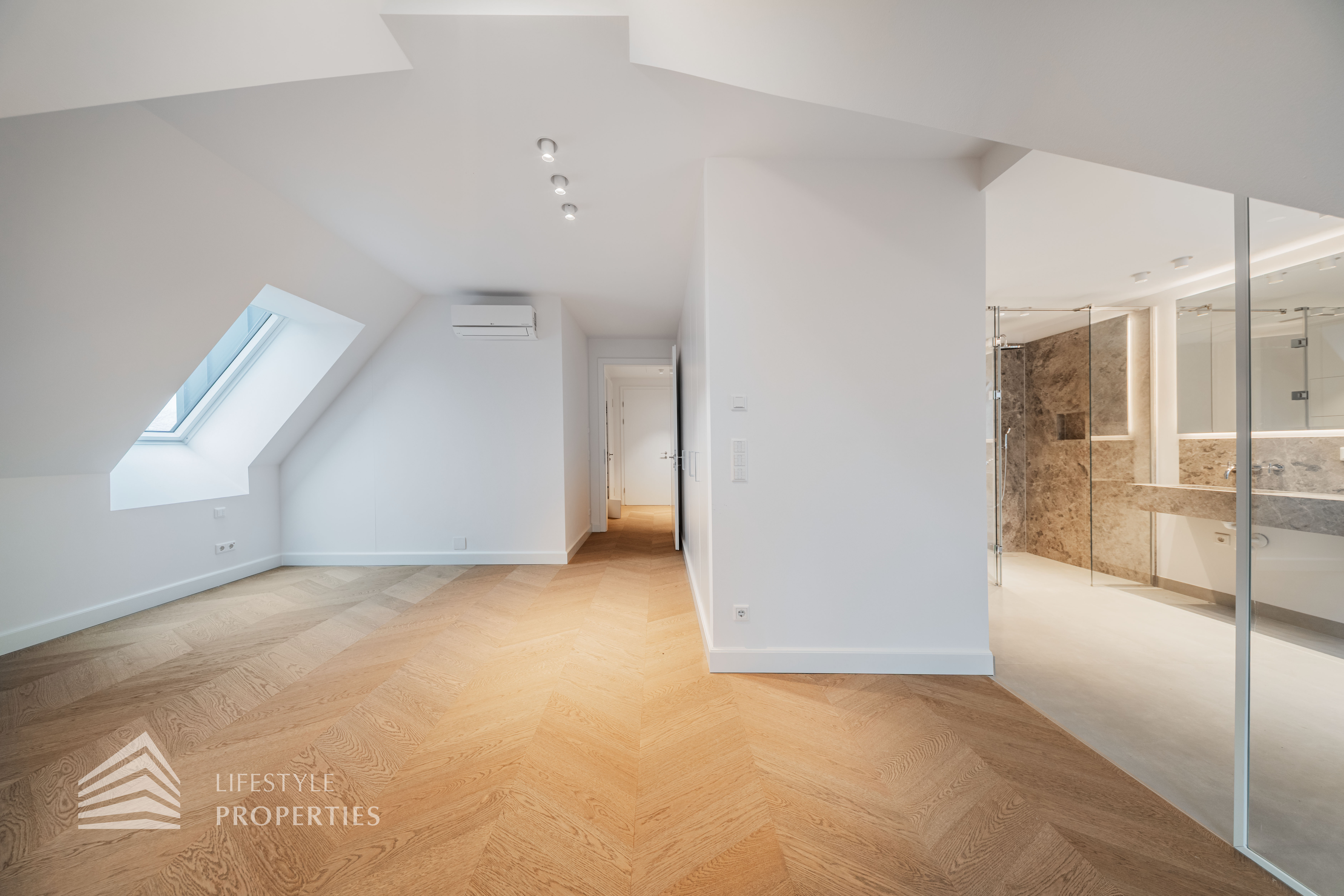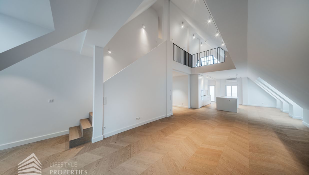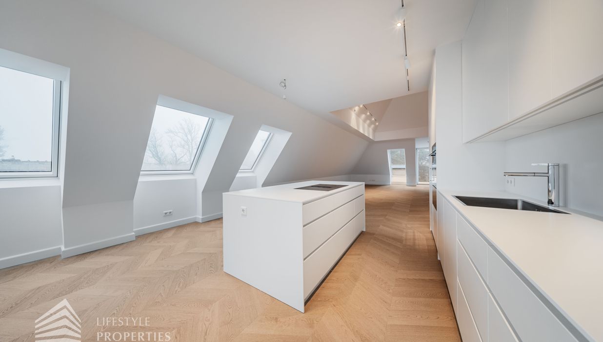 Diese außergewöhnliche Maisonette-Dachgeschosswohnung befindet sich in einer prachtvollen Jahrhundertwendevilla und bietet auf rund 238 m² Wohnfläche inklusive Galerie ein beeindruckendes Zusammenspiel aus Großzügigkeit, Licht und architektonischer Eleganz. Bereits beim Betreten des unteren Wohnbereichs eröffnet sich ein einladendes Entrée, von dem aus man direkt in den weitläufigen ca. 75m² grossen Wohnbereich mit offener Küche gelangt, der als kommunikatives Zentrum der Wohnung fungiert und durch seine Offenheit und Raumhöhe ein besonders hochwertiges Wohngefühl vermittelt. Von hier aus erschließt sich auch der Balkon mit rund 11 m², der den Wohnraum ins Freie erweitert und einen angenehmen privaten Rückzugsort bietet. Ergänzend befindet sich auf dieser Ebene ein separates Gäste-WC, das den Wohnkomfort im Alltag sowie bei Besuch zusätzlich erhöht.