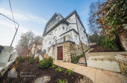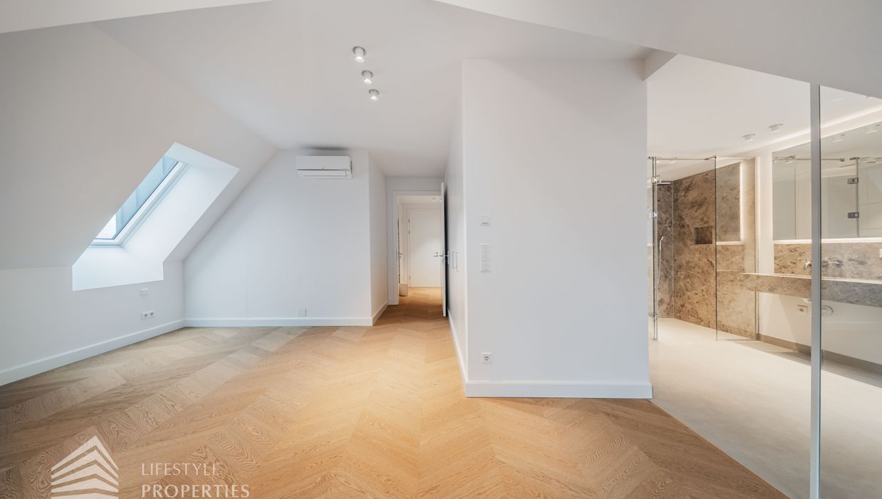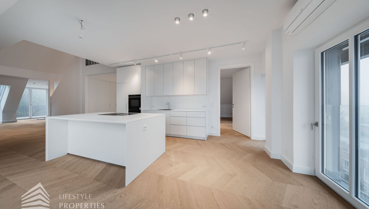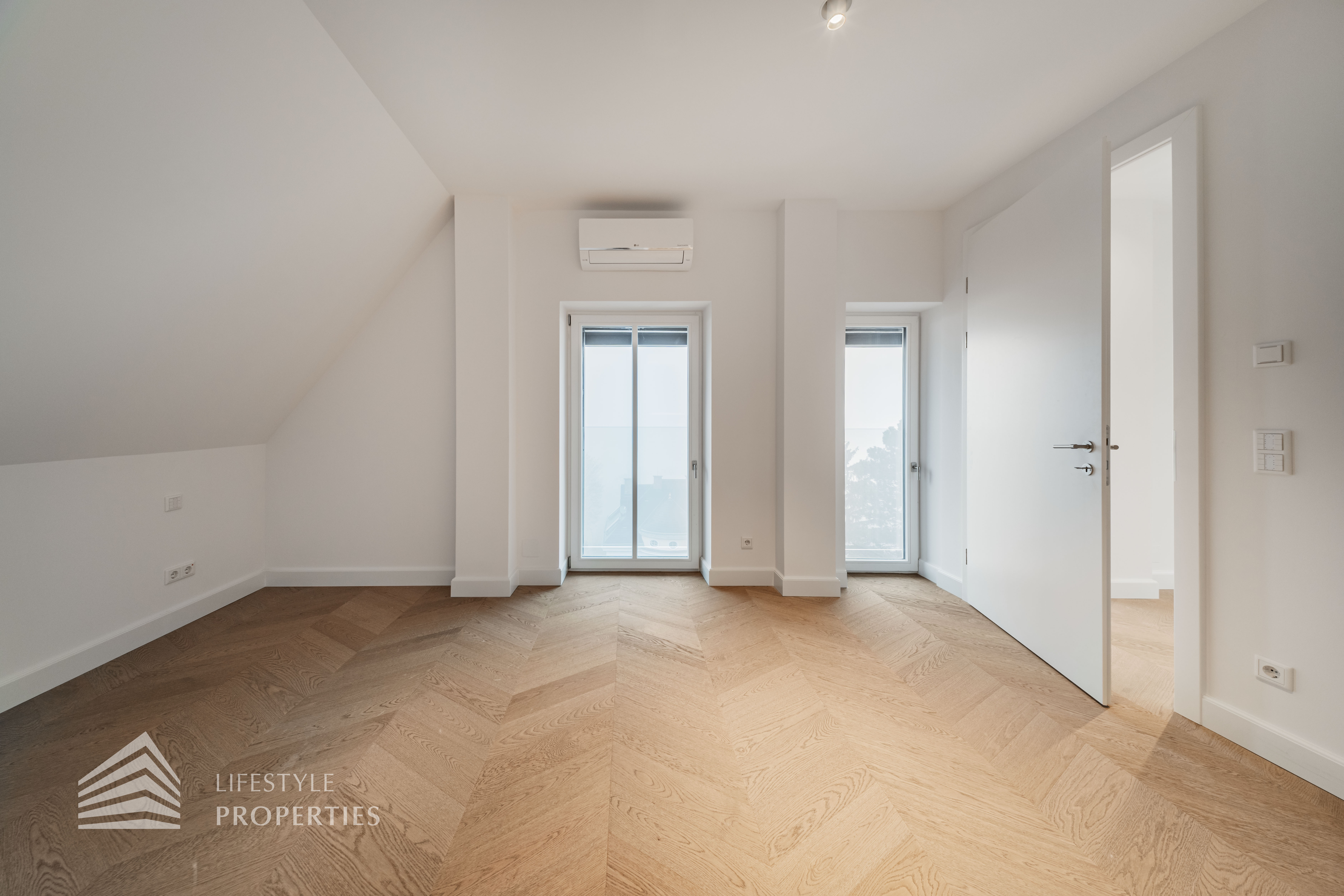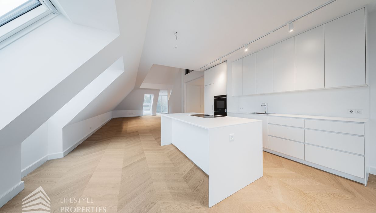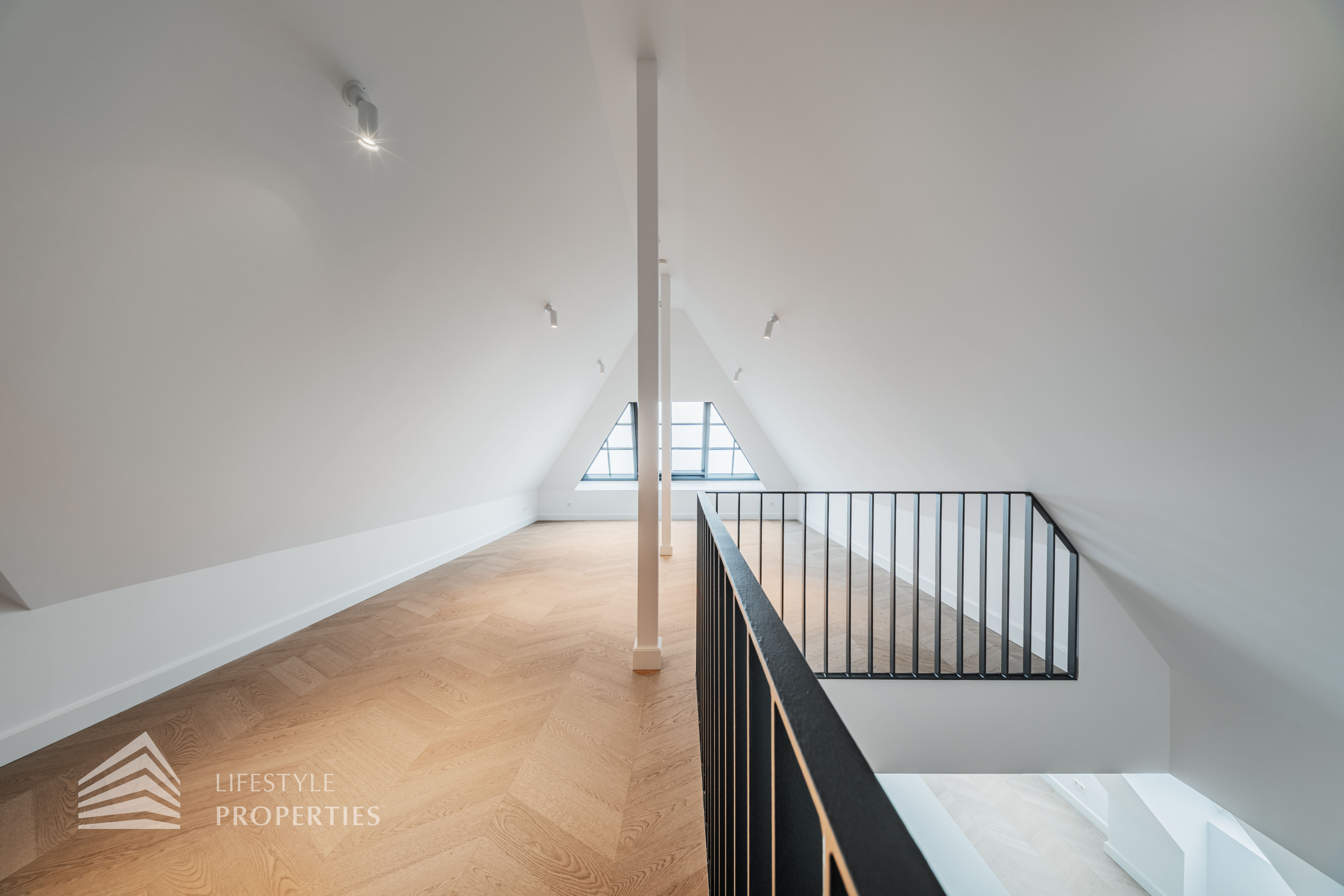 Diese außergewöhnliche Maisonette-Dachgeschosswohnung befindet sich in einer prachtvollen Jahrhundertwendevilla und bietet auf rund 238 m² Wohnfläche inklusive Galerie ein beeindruckendes Zusammenspiel aus Großzügigkeit, Licht und architektonischer Eleganz. Bereits beim Betreten des unteren Wohnbereichs eröffnet sich ein einladendes Entrée, von dem aus man direkt in den weitläufigen ca. 75m² grossen Wohnbereich mit offener Küche gelangt, der als kommunikatives Zentrum der Wohnung fungiert und durch seine Offenheit und Raumhöhe ein besonders hochwertiges Wohngefühl vermittelt. Von hier aus erschließt sich auch der Balkon mit rund 11 m², der den Wohnraum ins Freie erweitert und einen angenehmen privaten Rückzugsort bietet. Ergänzend befindet sich auf dieser Ebene ein separates Gäste-WC, das den Wohnkomfort im Alltag sowie bei Besuch zusätzlich erhöht.
