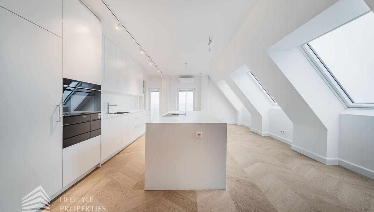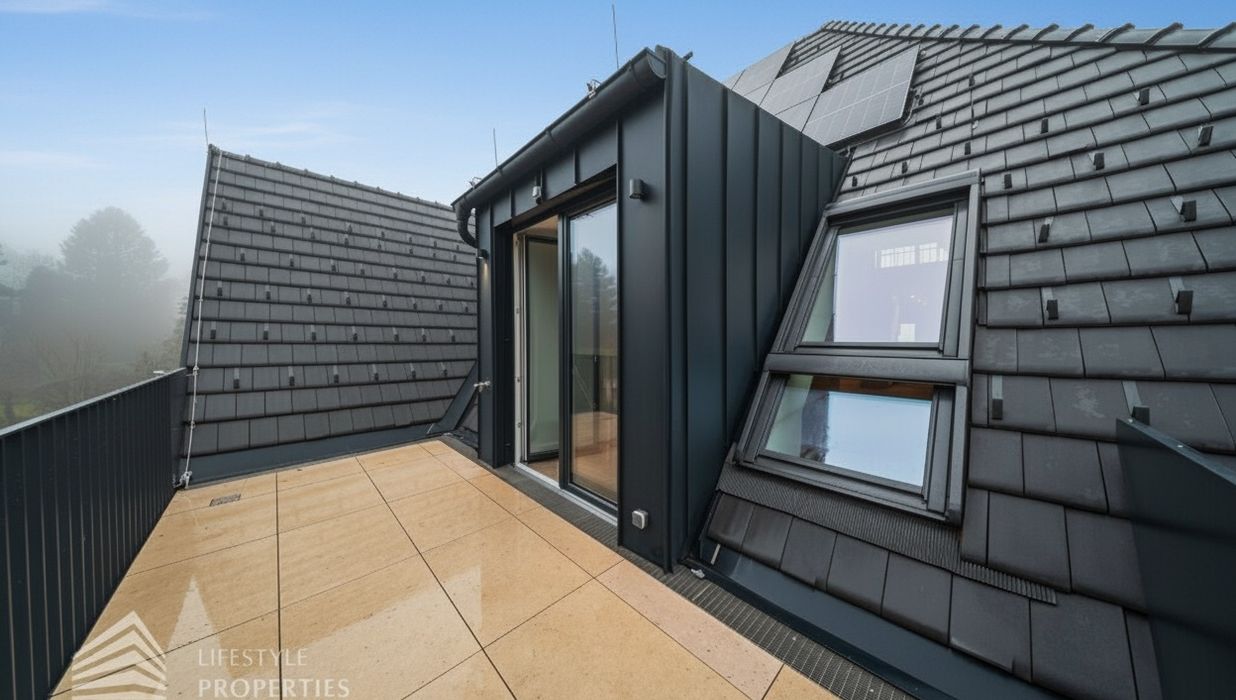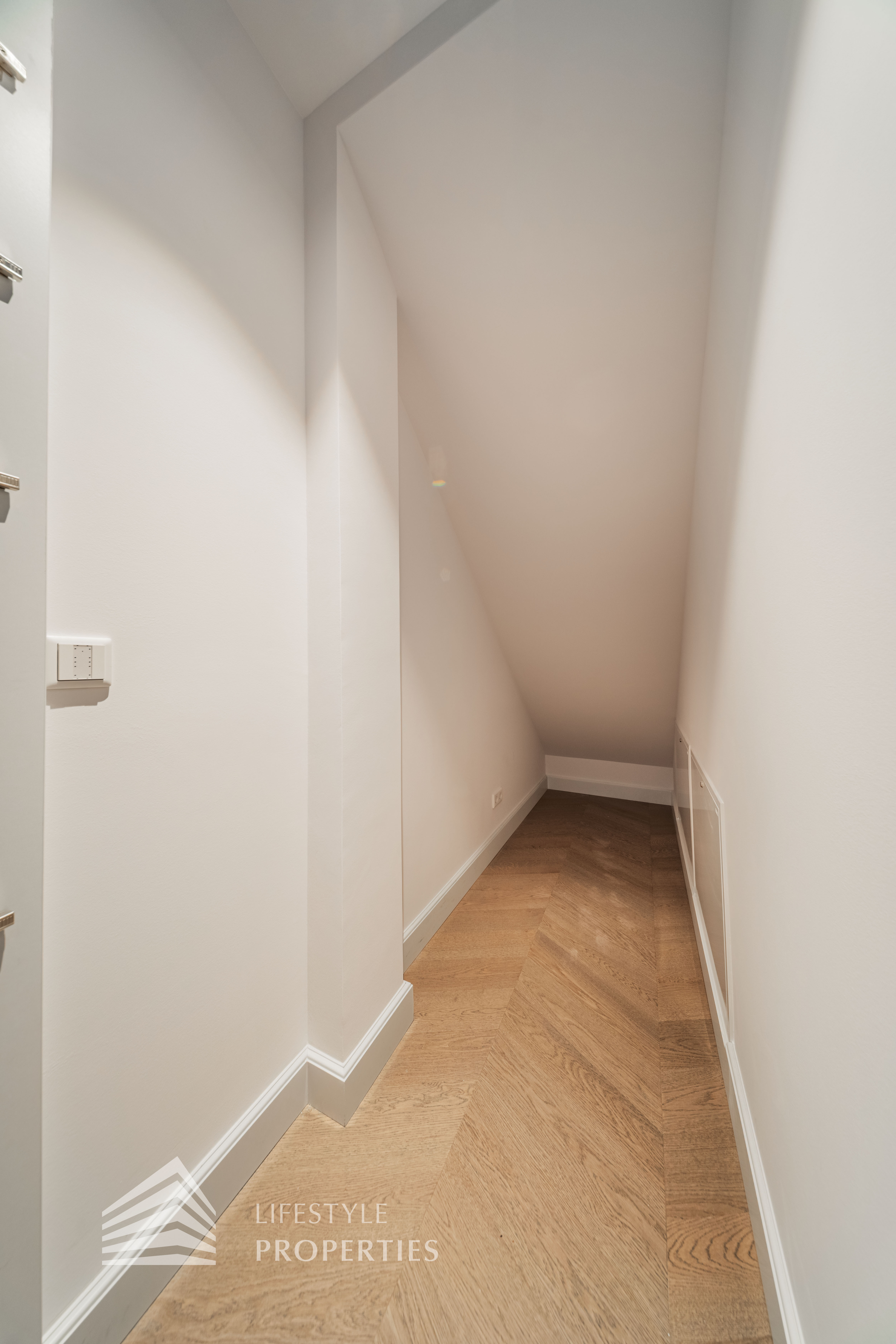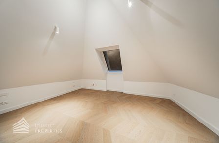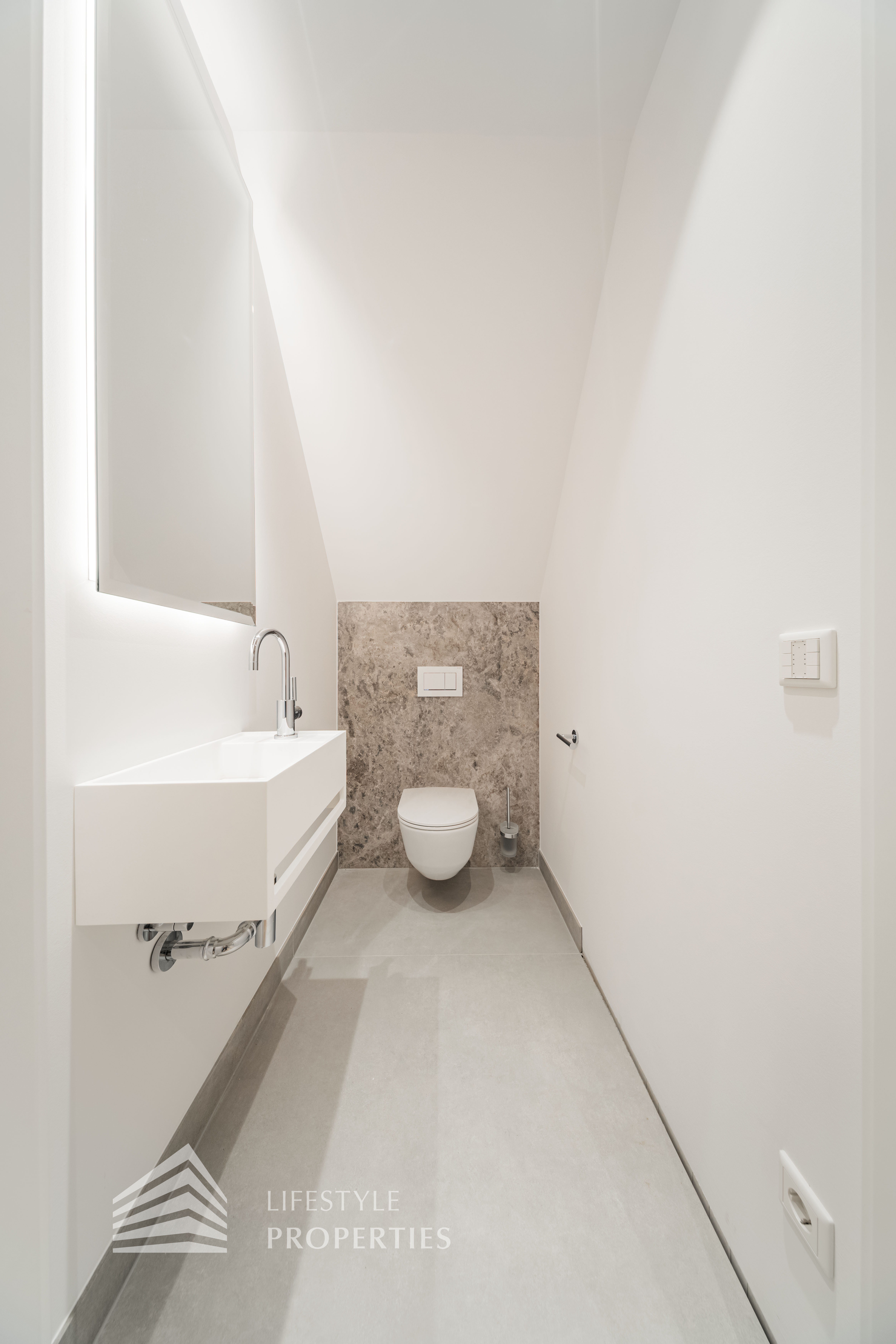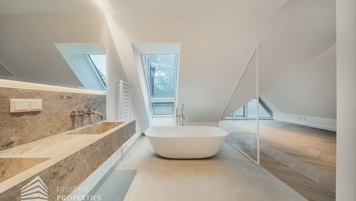 Diese außergewöhnliche Maisonette-Dachgeschosswohnung befindet sich in einer prachtvollen Jahrhundertwendevilla und bietet auf rund 238 m² Wohnfläche inklusive Galerie ein beeindruckendes Zusammenspiel aus Großzügigkeit, Licht und architektonischer Eleganz. Bereits beim Betreten des unteren Wohnbereichs eröffnet sich ein einladendes Entrée, von dem aus man direkt in den weitläufigen ca. 75m² grossen Wohnbereich mit offener Küche gelangt, der als kommunikatives Zentrum der Wohnung fungiert und durch seine Offenheit und Raumhöhe ein besonders hochwertiges Wohngefühl vermittelt. Von hier aus erschließt sich auch der Balkon mit rund 11 m², der den Wohnraum ins Freie erweitert und einen angenehmen privaten Rückzugsort bietet. Ergänzend befindet sich auf dieser Ebene ein separates Gäste-WC, das den Wohnkomfort im Alltag sowie bei Besuch zusätzlich erhöht.