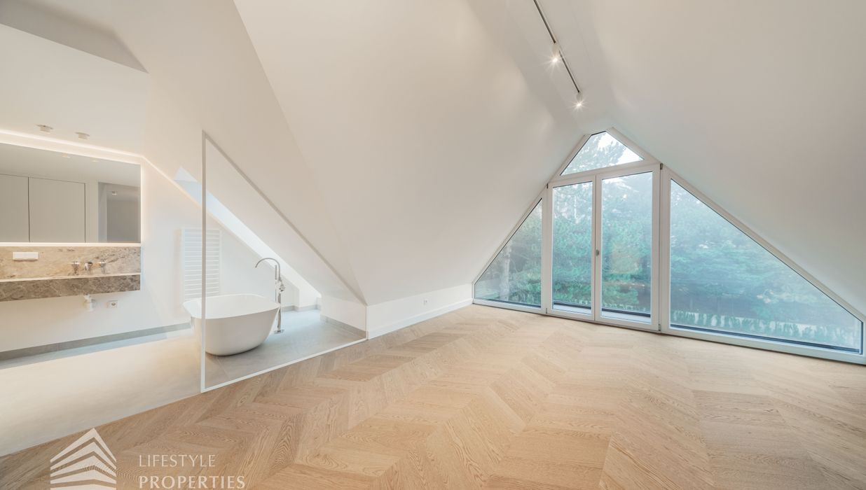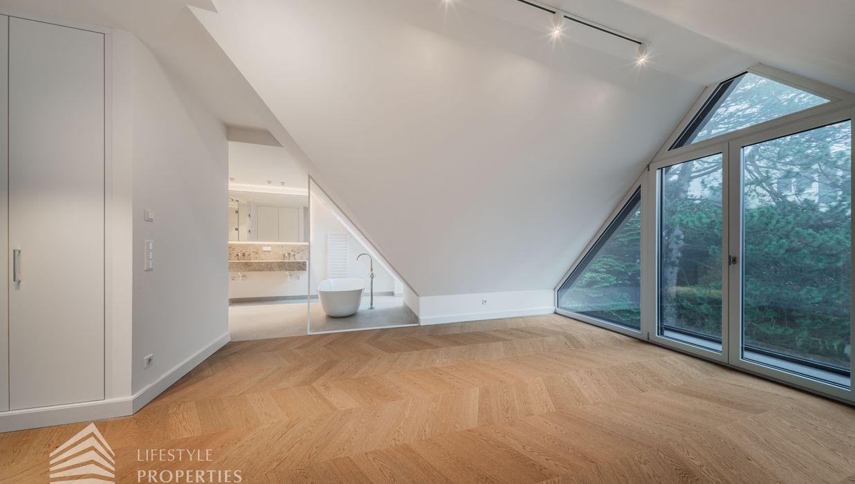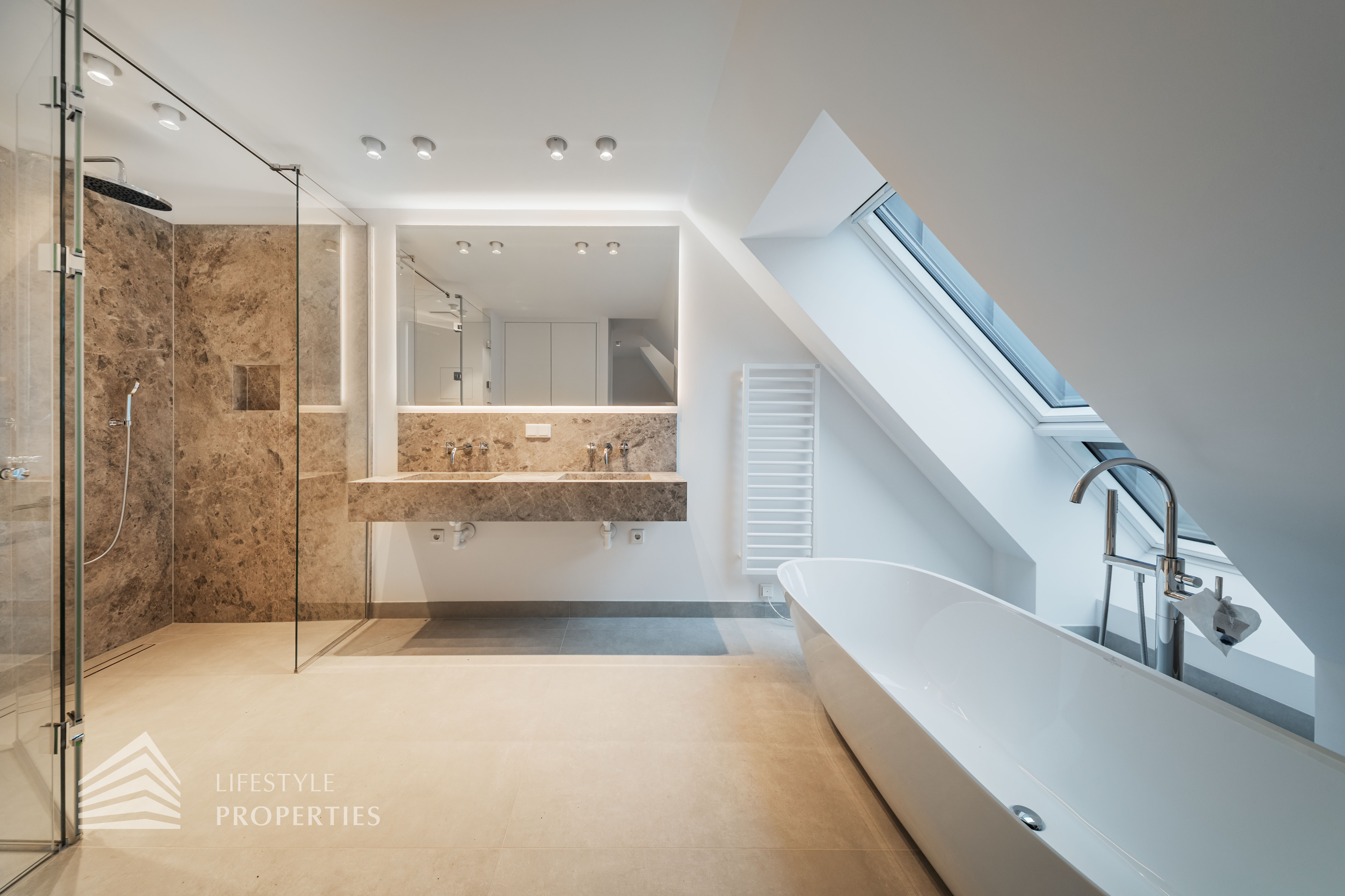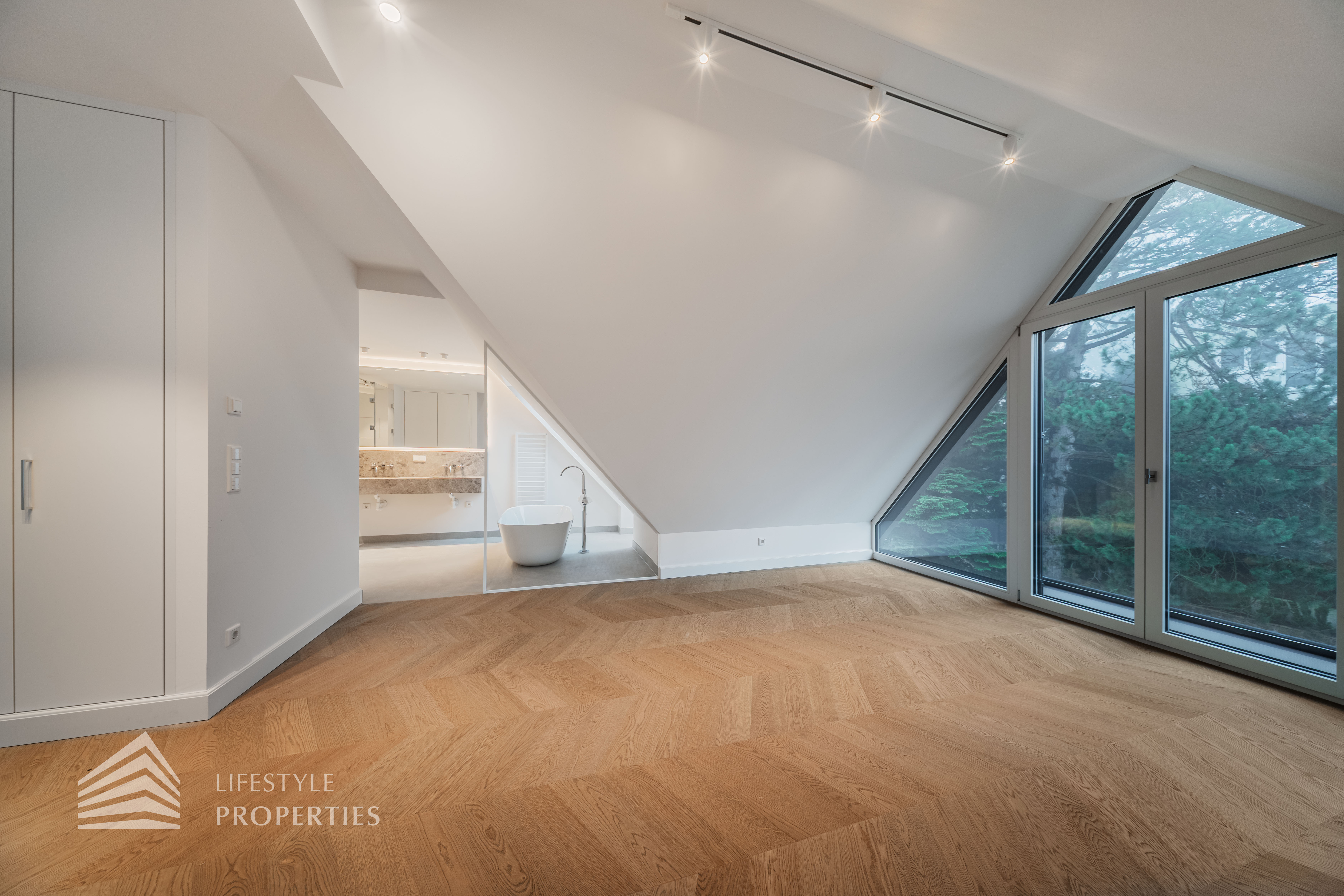 Auf derselben Ebene liegen zwei großzügige Schlafzimmer, die jeweils als eigenständige Rückzugsbereiche mit Badezimmer en suite ausgeführt sind. Ein Schlafzimmer verfügt über eine Fläche von ca. 16 m² und ist mit einem angeschlossenen Badezimmer von rund 7 m² ausgestattet. Das zweite Schlafzimmer präsentiert sich besonders großzügig und umfasst ca. 48 m² inklusive eines großen Badezimmers mit Badewanne, wodurch ein nahezu suite-artiger Wohnbereich entsteht, der höchsten Komfort und Privatsphäre bietet.