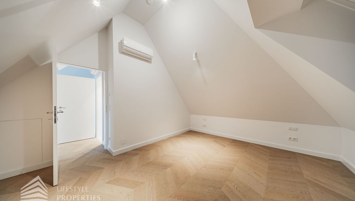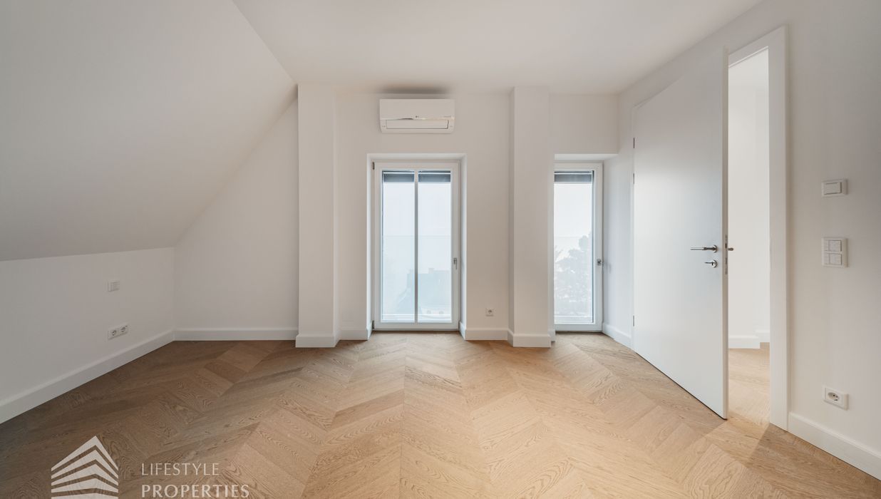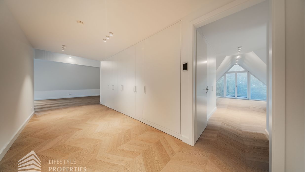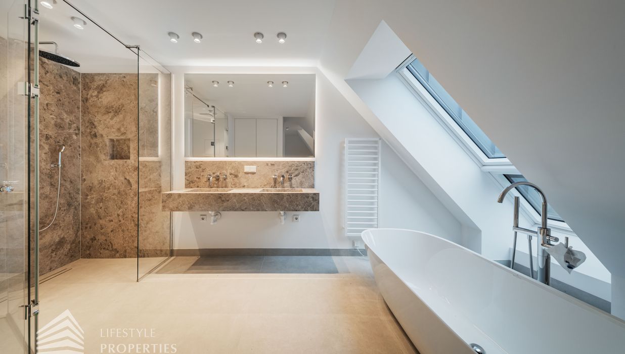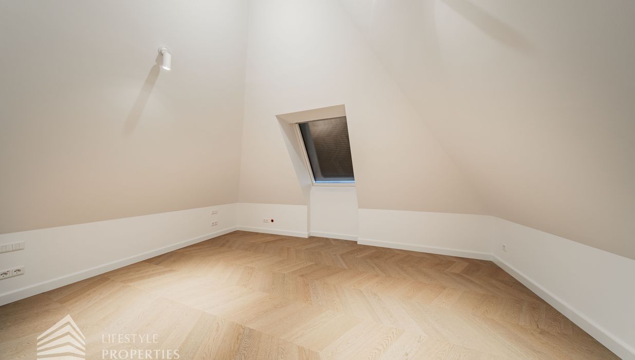 Auf derselben Ebene liegen zwei großzügige Schlafzimmer, die jeweils als eigenständige Rückzugsbereiche mit Badezimmer en suite ausgeführt sind. Ein Schlafzimmer verfügt über eine Fläche von ca. 16 m² und ist mit einem angeschlossenen Badezimmer von rund 7 m² ausgestattet. Das zweite Schlafzimmer präsentiert sich besonders großzügig und umfasst ca. 48 m² inklusive eines großen Badezimmers mit Badewanne, wodurch ein nahezu suite-artiger Wohnbereich entsteht, der höchsten Komfort und Privatsphäre bietet.