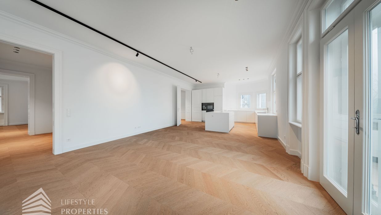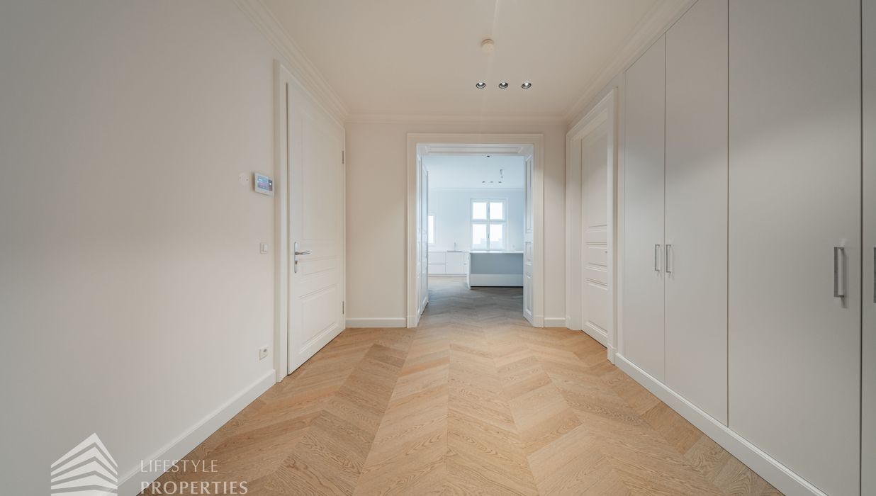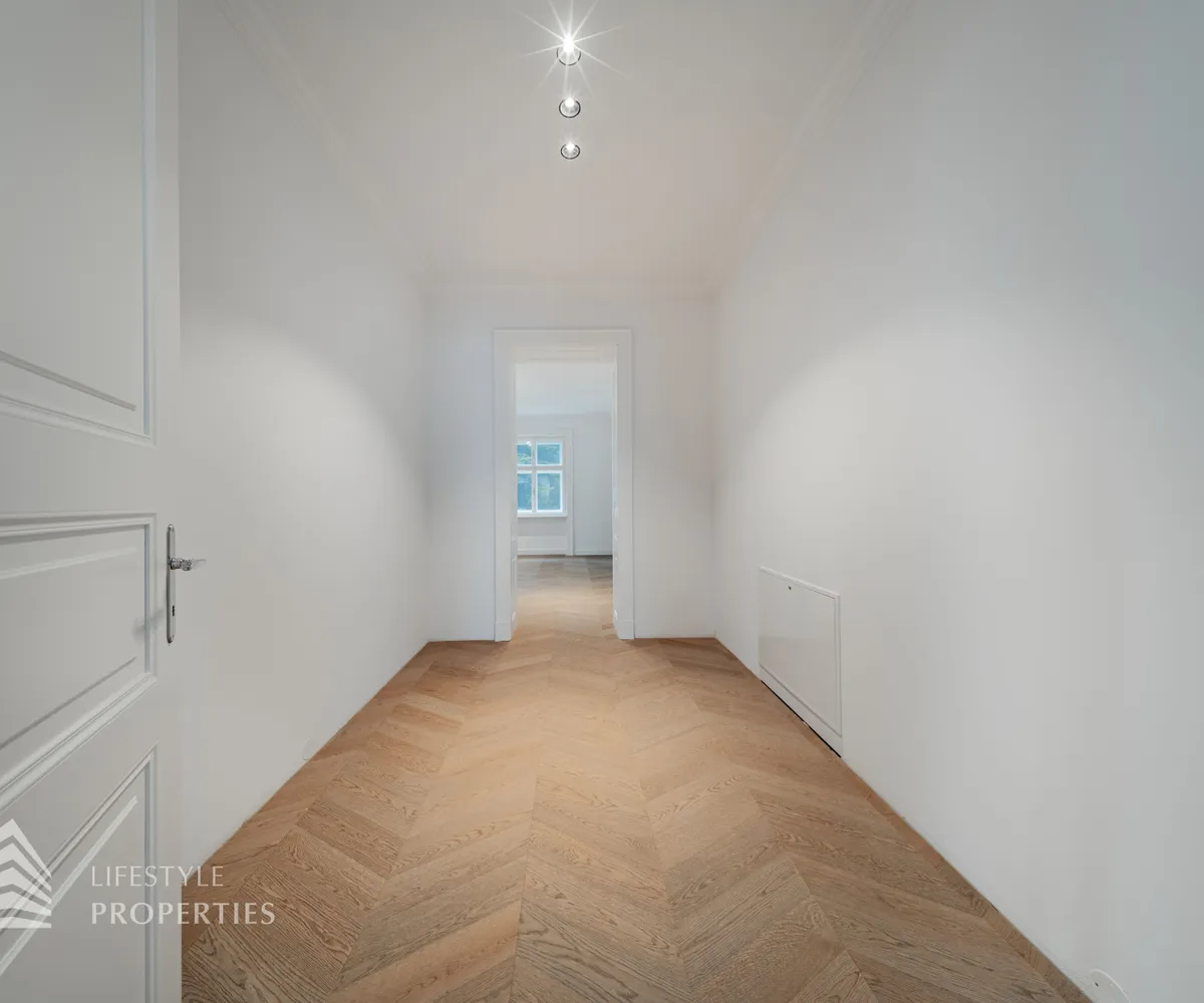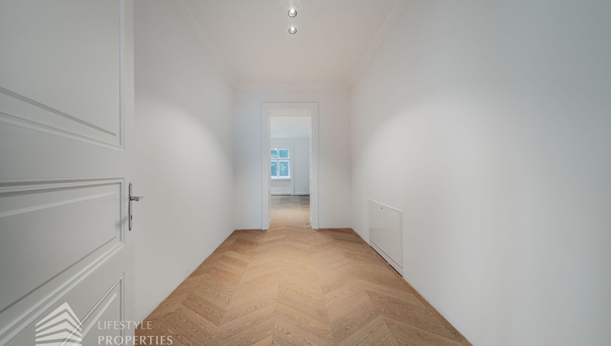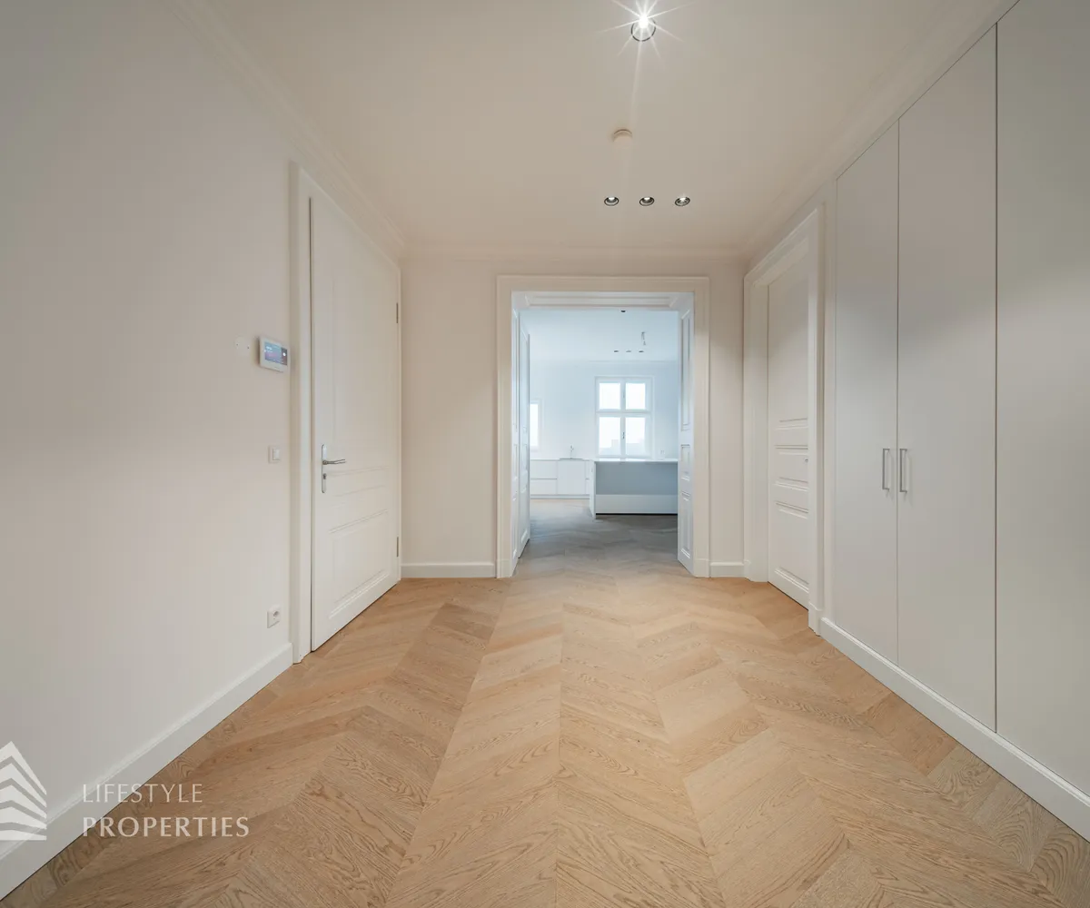 Bereits beim Betreten dieser außergewöhnlichen Altbauresidenz im ersten Obergeschoss offenbart sich ein Wohngefühl auf ca 197m² Wohnfläche und höchstem Niveau. Komfortabel über einen Personenaufzug erreichbar, empfängt ein großzügiges Entrée mit rund 10,5 m², das den Ton für die durchdachte Raumdramaturgie dieser exklusiven Wohnung angibt.