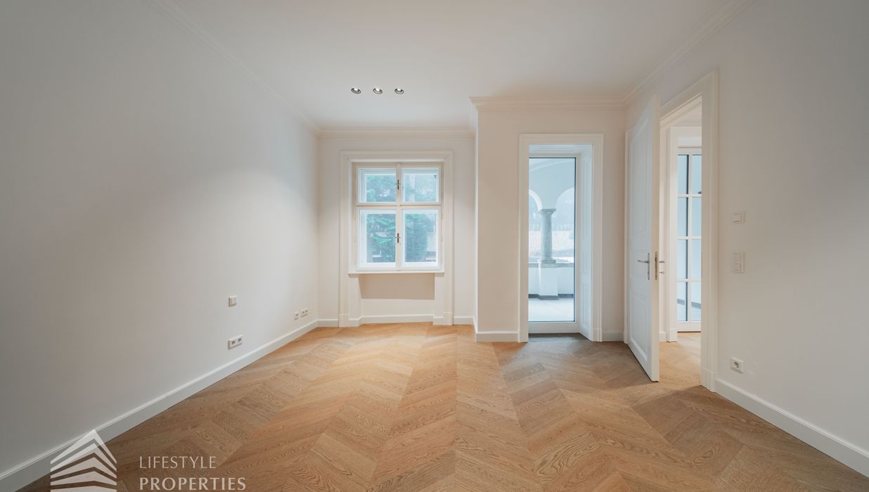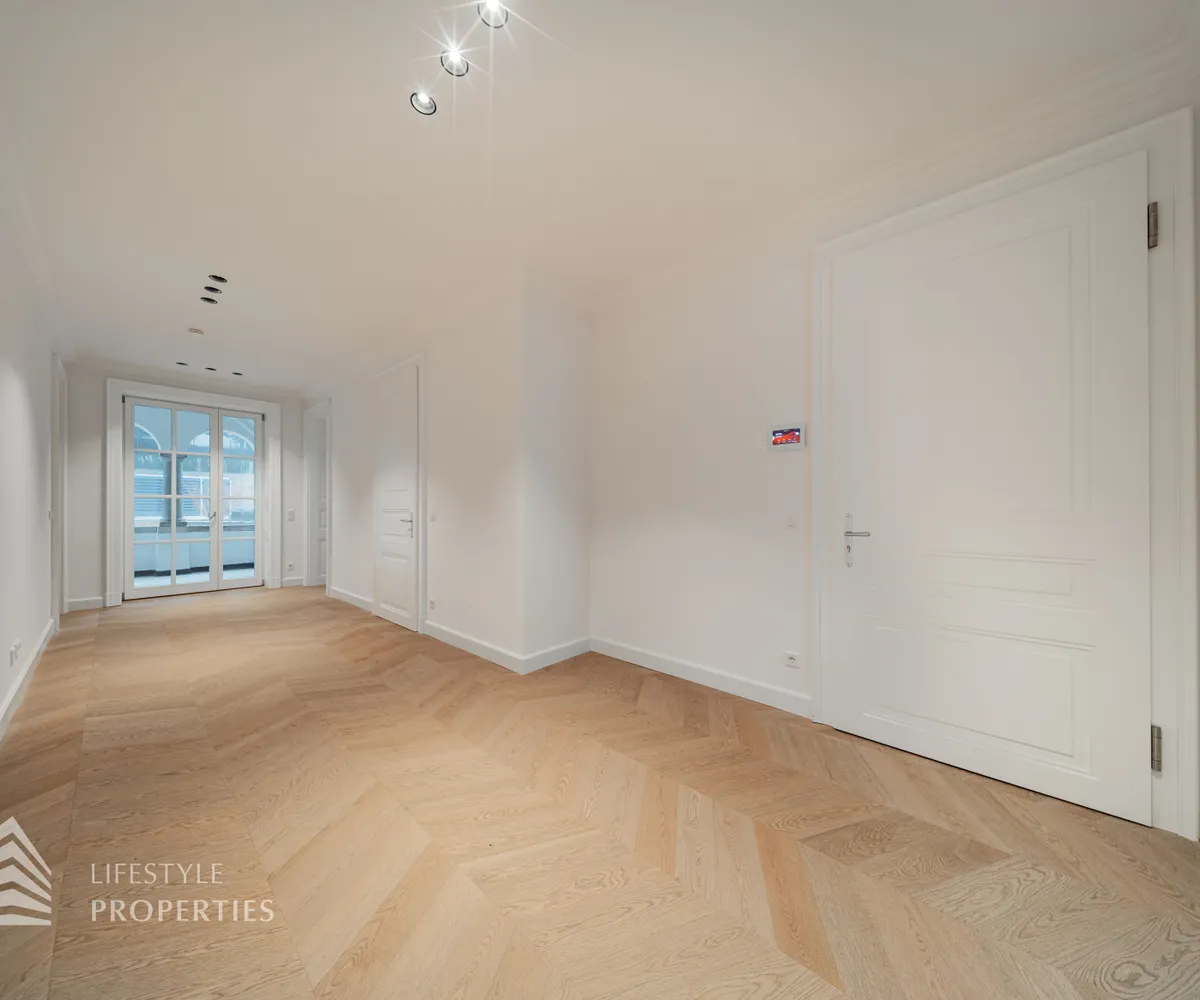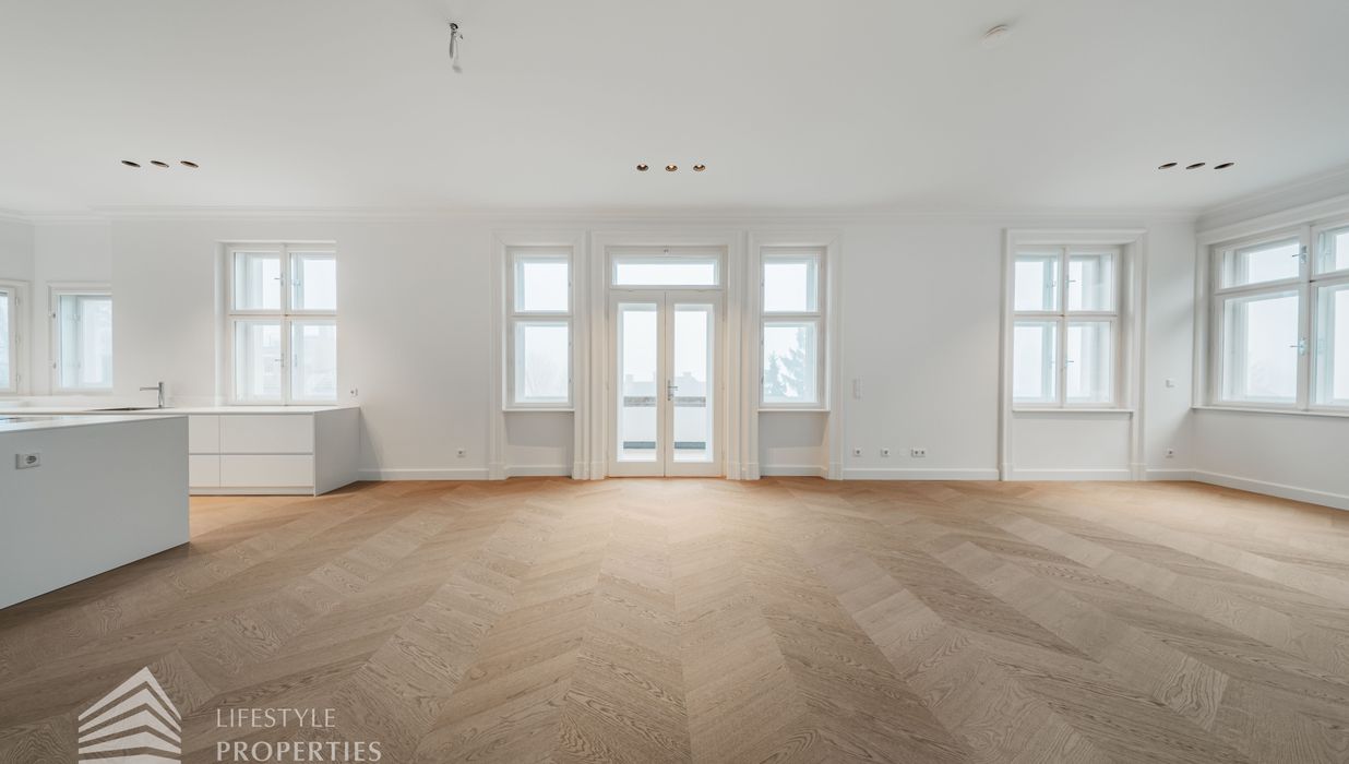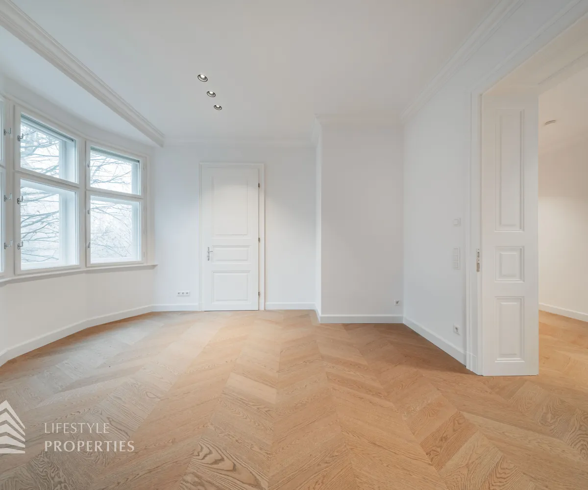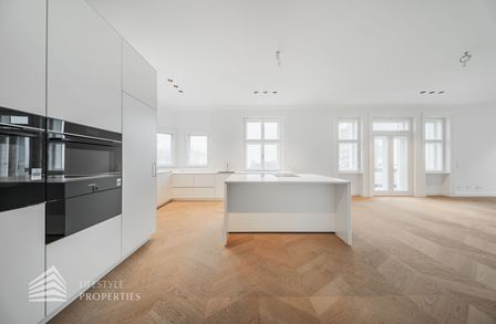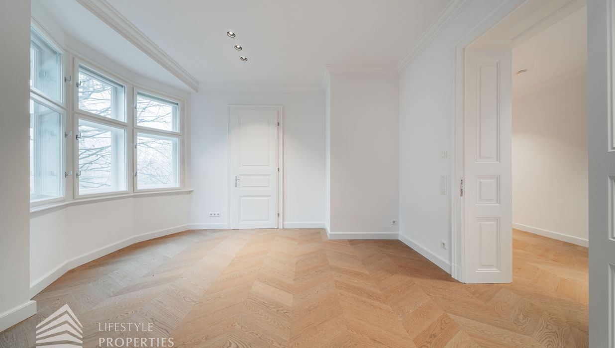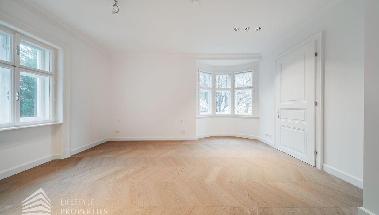 Bereits beim Betreten dieser außergewöhnlichen Altbauresidenz im ersten Obergeschoss offenbart sich ein Wohngefühl auf ca 197m² Wohnfläche und höchstem Niveau. Komfortabel über einen Personenaufzug erreichbar, empfängt ein großzügiges Entrée mit rund 10,5 m², das den Ton für die durchdachte Raumdramaturgie dieser exklusiven Wohnung angibt.