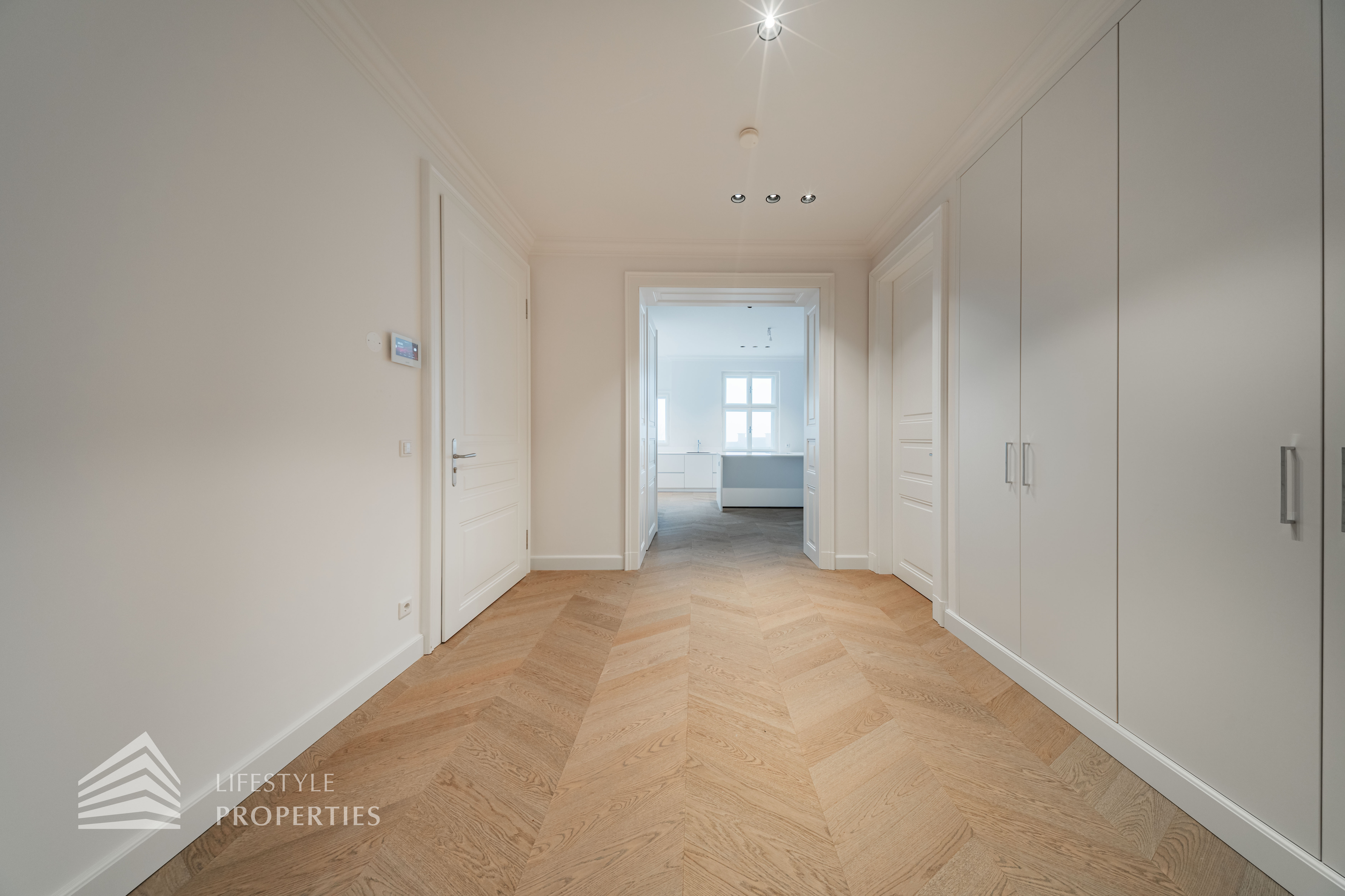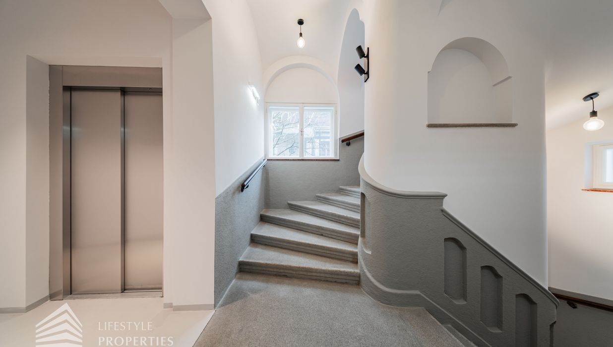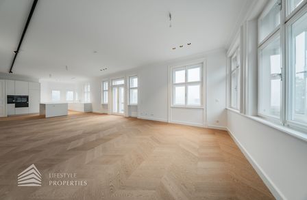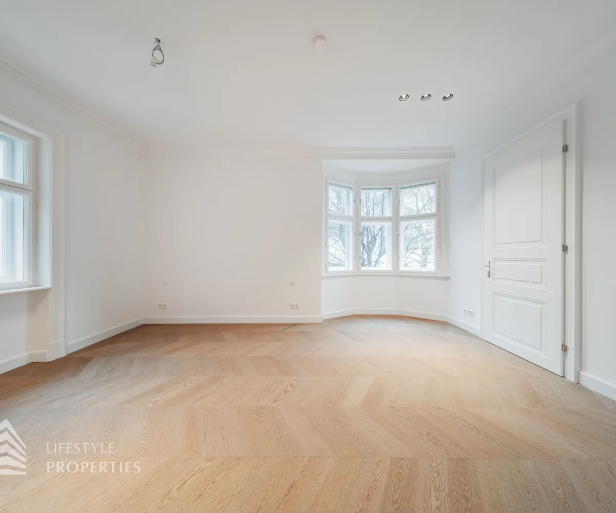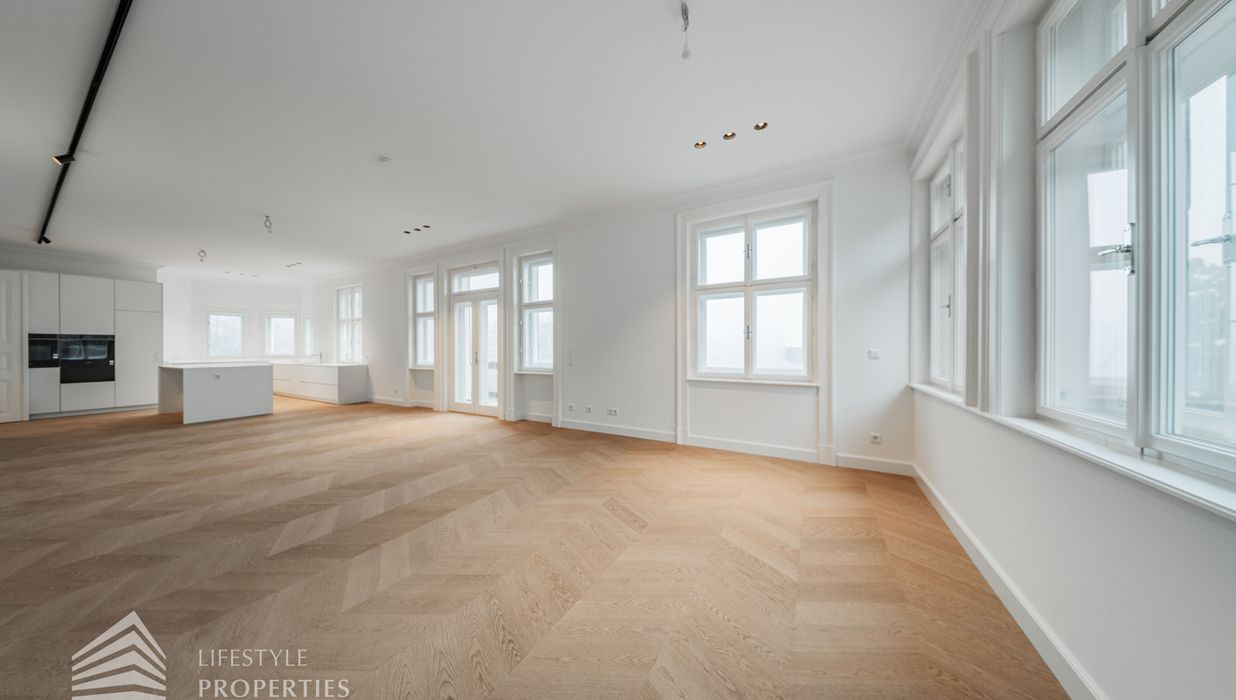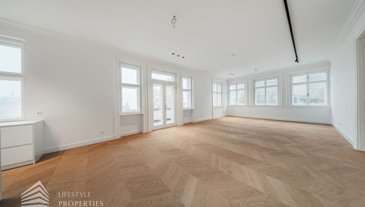 Bereits beim Betreten dieser außergewöhnlichen Altbauresidenz im ersten Obergeschoss offenbart sich ein Wohngefühl auf ca 197m² Wohnfläche und höchstem Niveau. Komfortabel über einen Personenaufzug erreichbar, empfängt ein großzügiges Entrée mit rund 10,5 m², das den Ton für die durchdachte Raumdramaturgie dieser exklusiven Wohnung angibt.