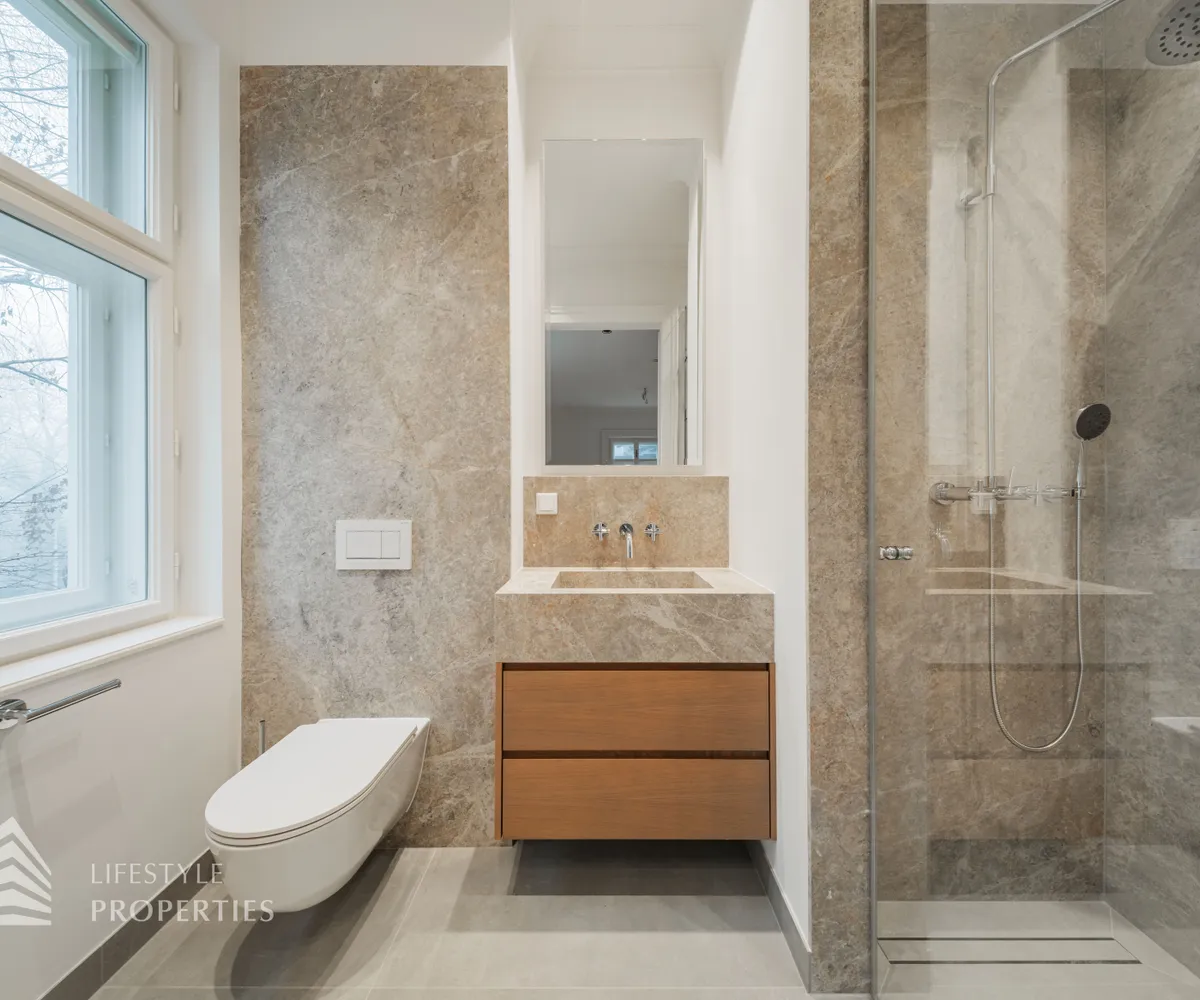 Das zweite Schlafzimmer misst ebenfalls rund 22 m² und verfügt über ein eigenes Badezimmer en suite mit Dusche, Waschbecken und WC. Ein weiteres, ebenso großzügiges Schlafzimmer mit ca. 22 m² besticht durch einen wunderschönen kleinen Erker und wird ebenfalls durch ein elegantes Bad en suite ergänzt.
