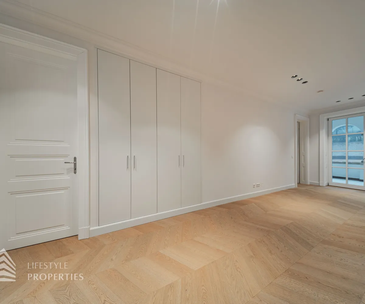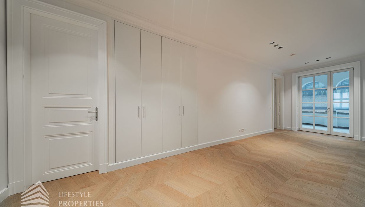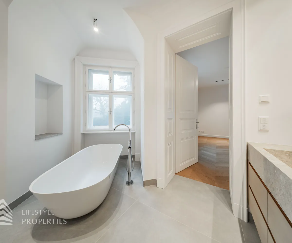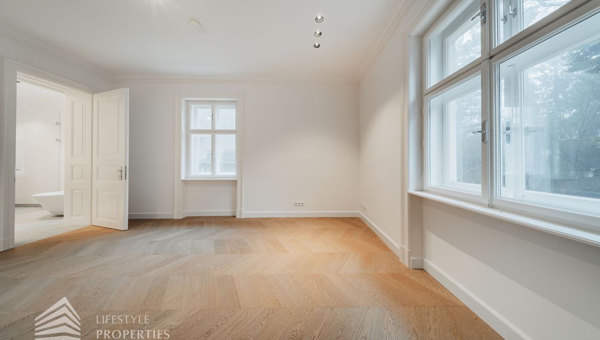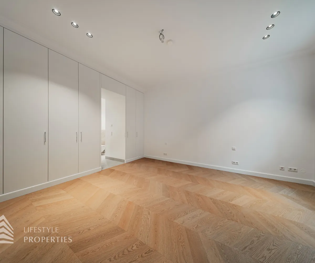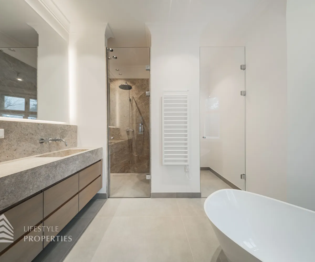 Rechter Hand befindet sich der private Rückzugsbereich mit insgesamt drei großzügigen Schlafräumen, die jeweils höchsten Wohnkomfort bieten. Das Master-Bedroom begeistert mit einer Fläche von rund 23 m², einer separaten Ankleide von etwa 8 m² sowie einem luxuriösen Badezimmer en suite. Dieses überzeugt mit einer freistehenden Badewanne, einer großzügigen Dusche, WC und einem stilvollen Doppelwaschbecken – ein privates Spa-Refugium im eigenen Zuhause.