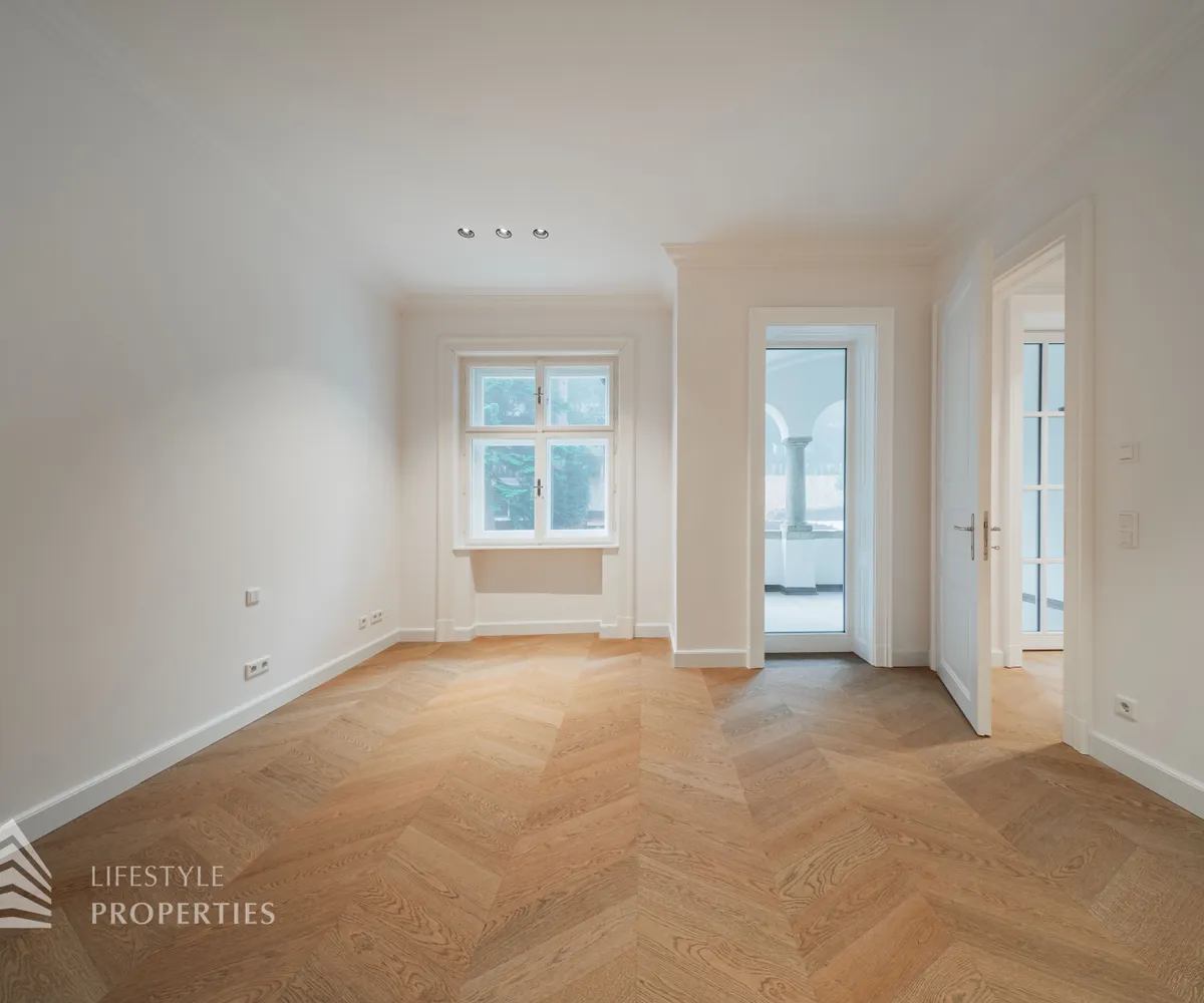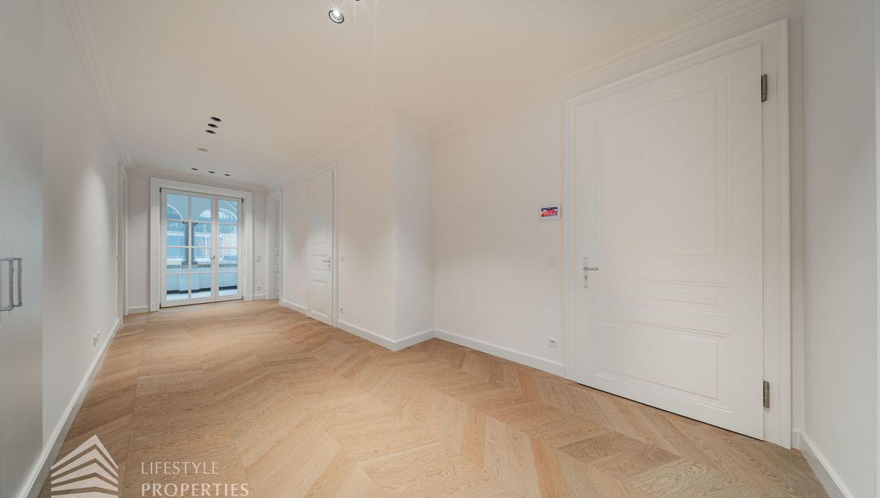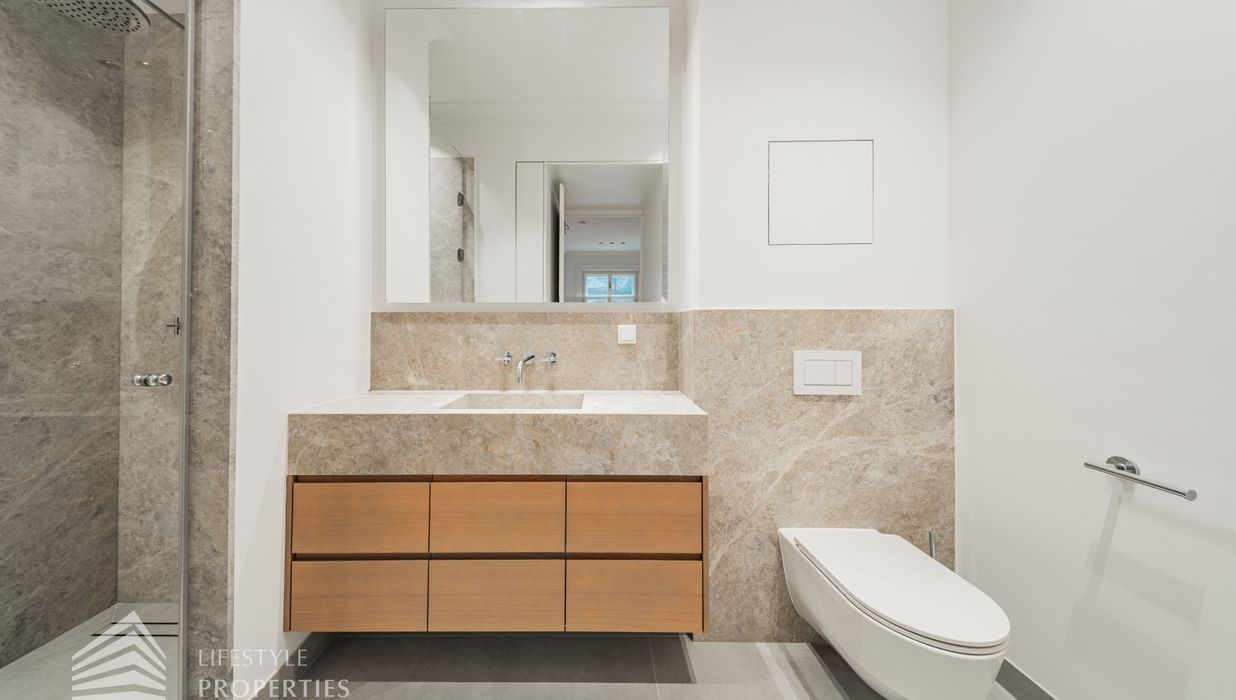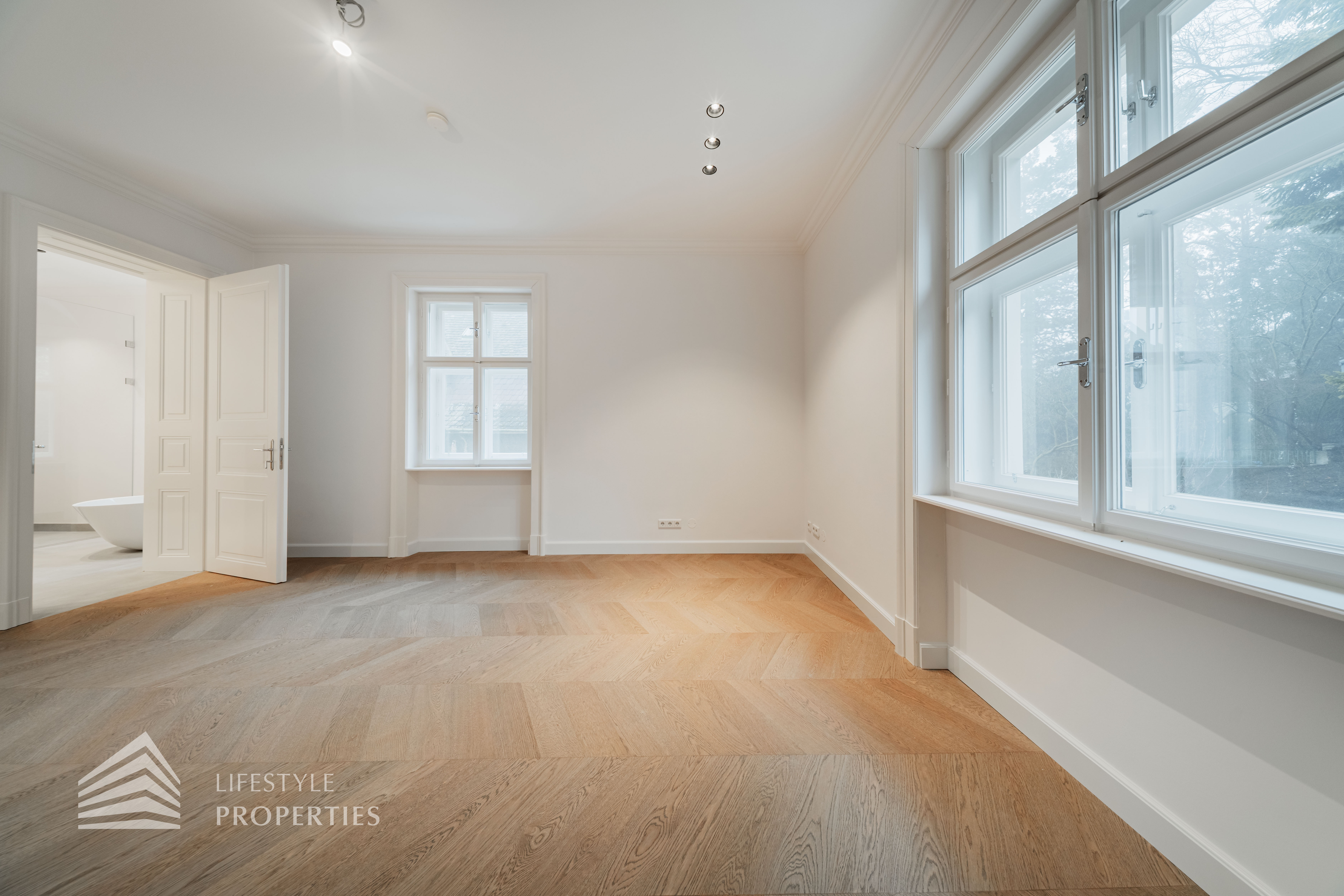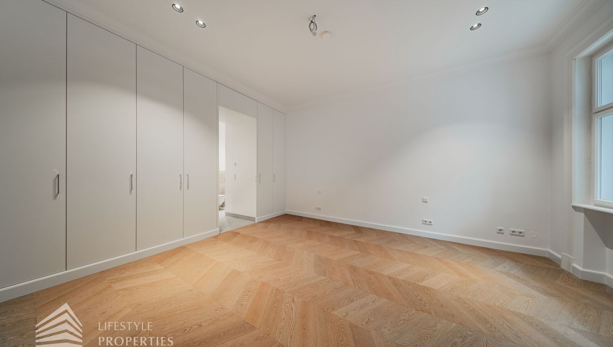 Rechter Hand befindet sich der private Rückzugsbereich mit insgesamt drei großzügigen Schlafräumen, die jeweils höchsten Wohnkomfort bieten. Das Master-Bedroom begeistert mit einer Fläche von rund 23 m², einer separaten Ankleide von etwa 8 m² sowie einem luxuriösen Badezimmer en suite. Dieses überzeugt mit einer freistehenden Badewanne, einer großzügigen Dusche, WC und einem stilvollen Doppelwaschbecken – ein privates Spa-Refugium im eigenen Zuhause.