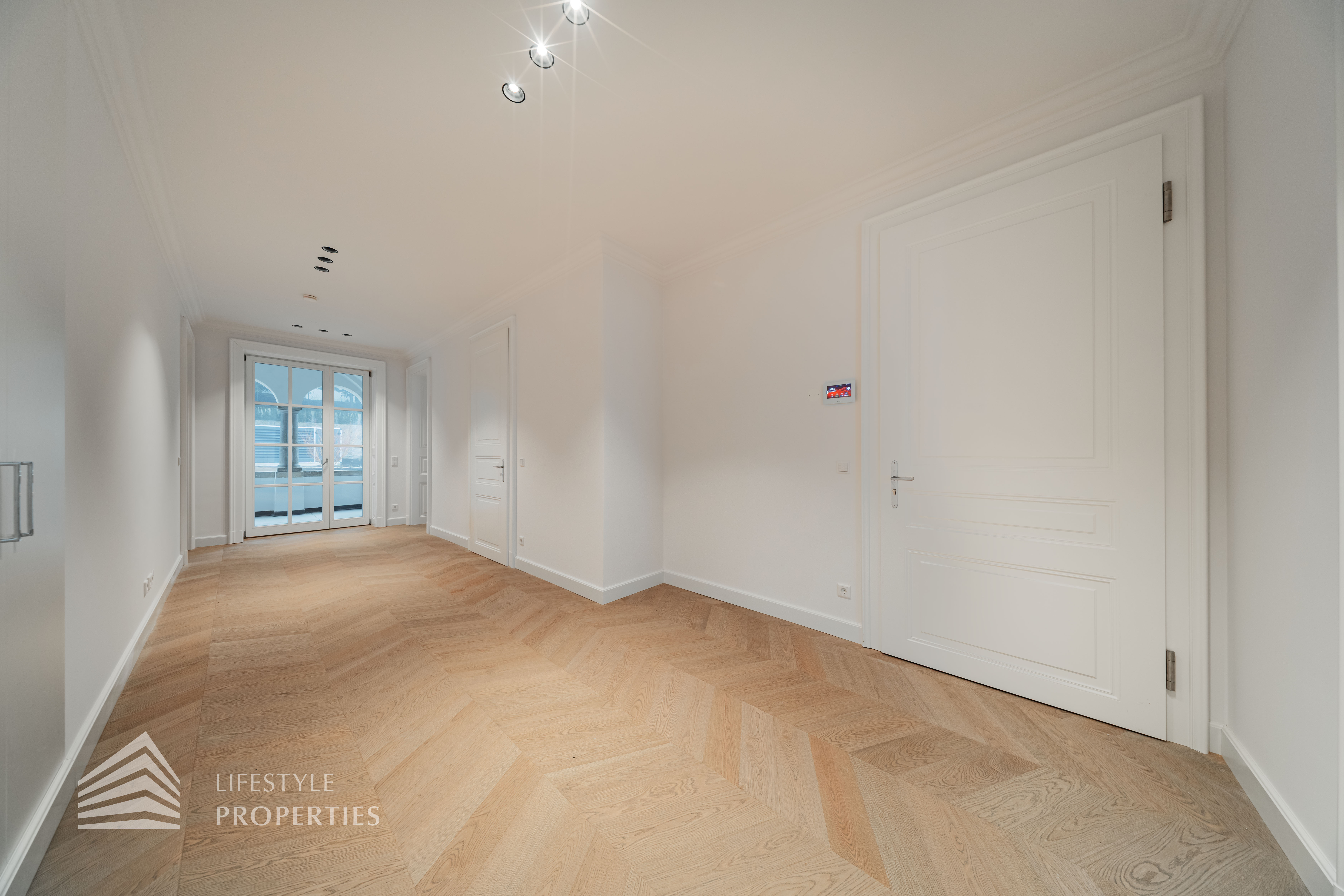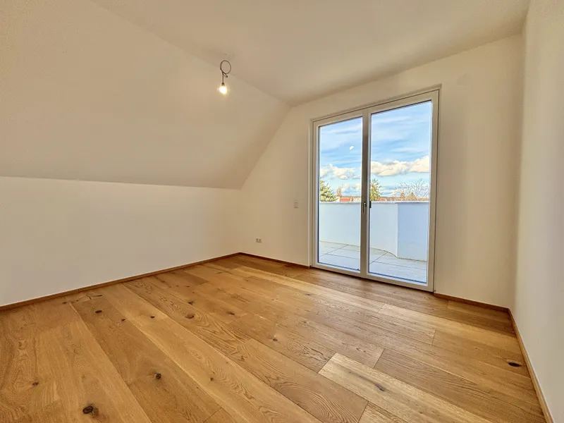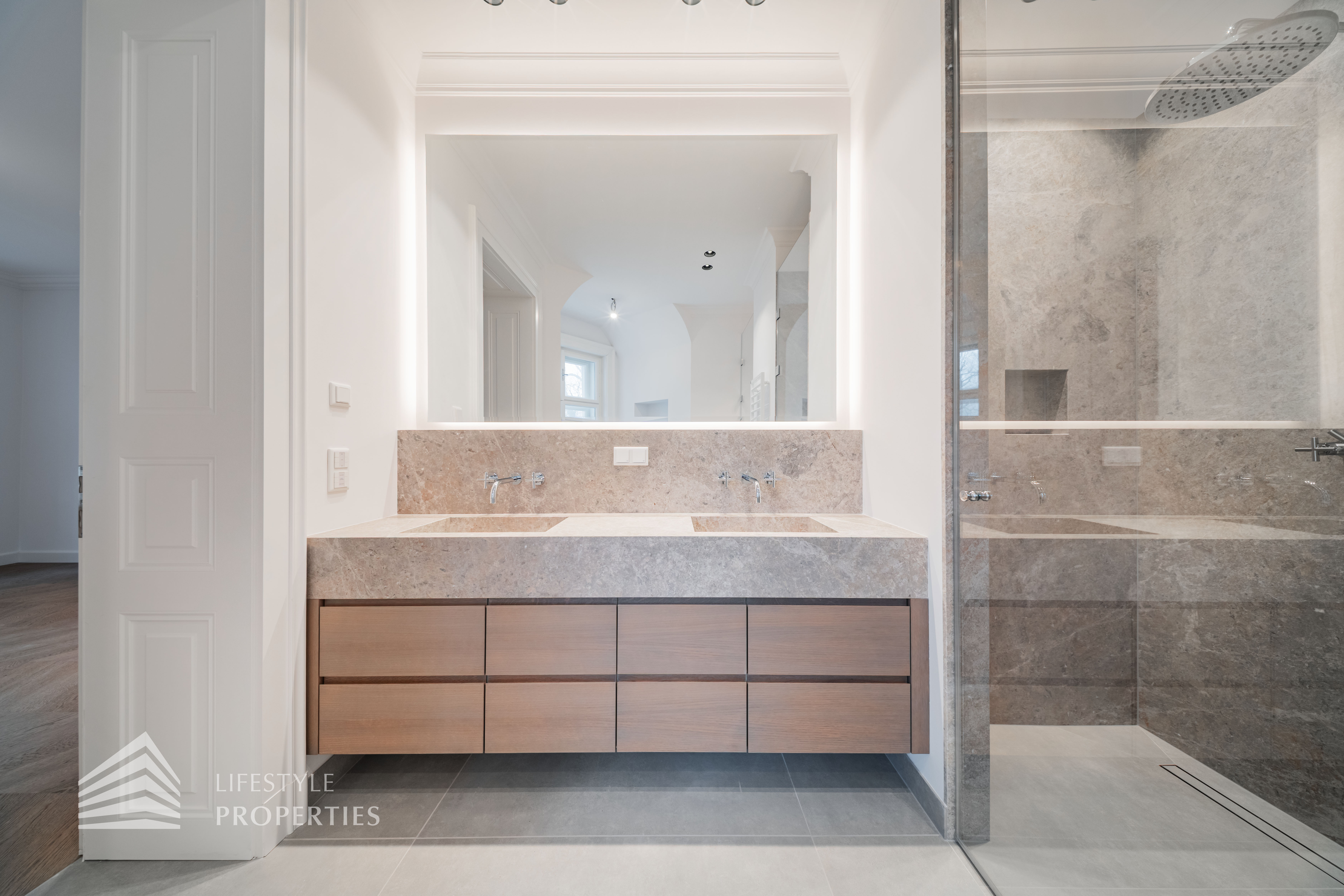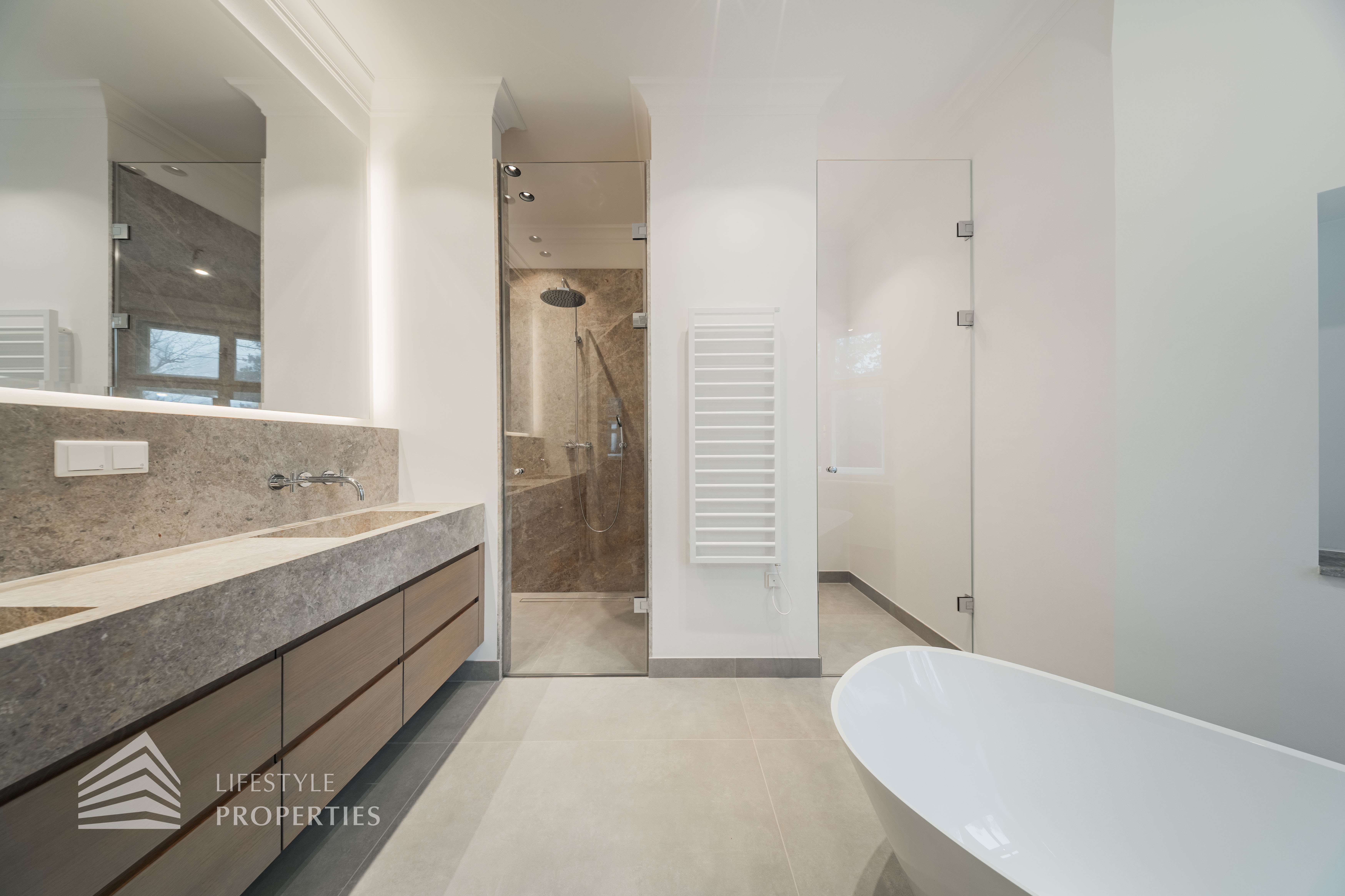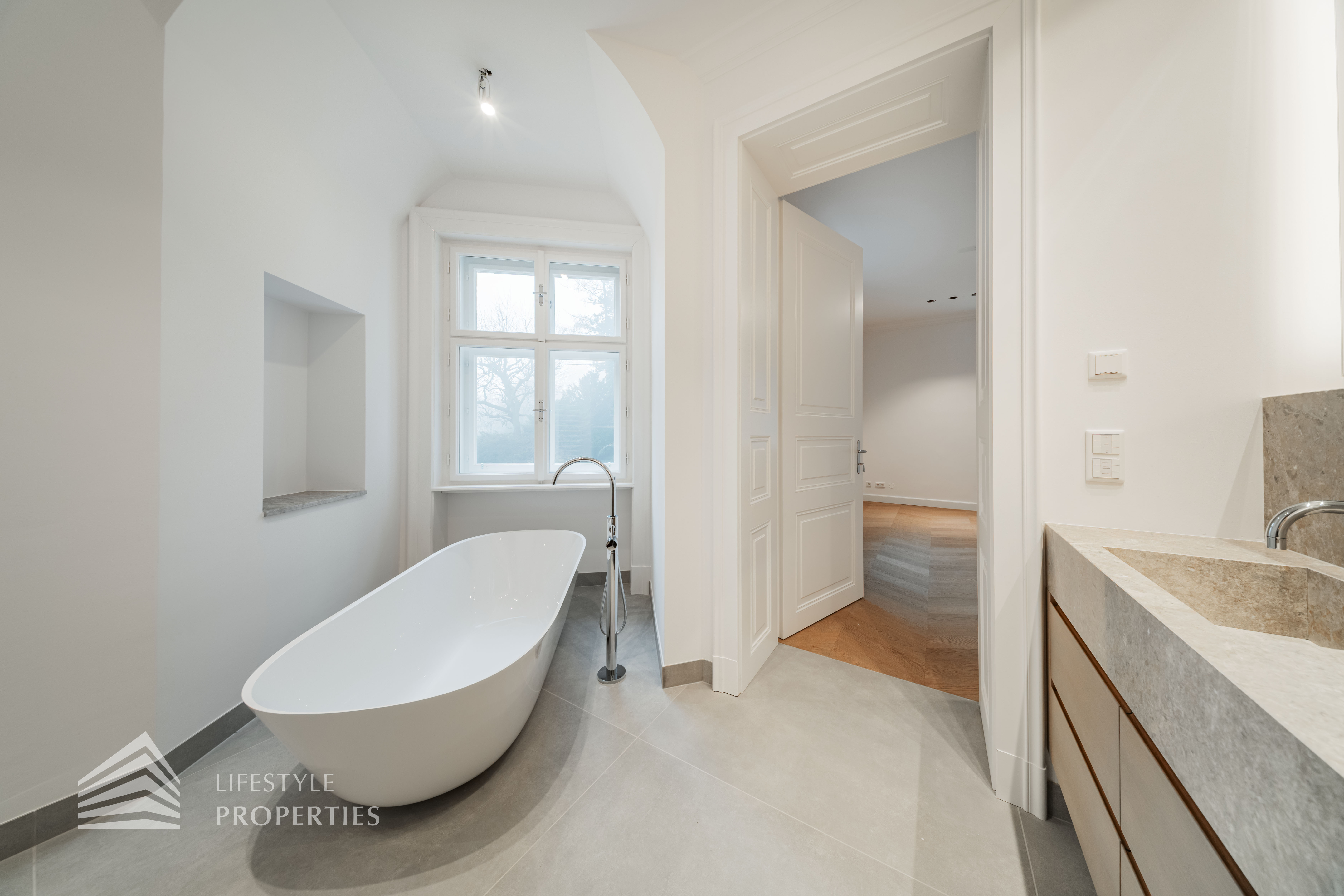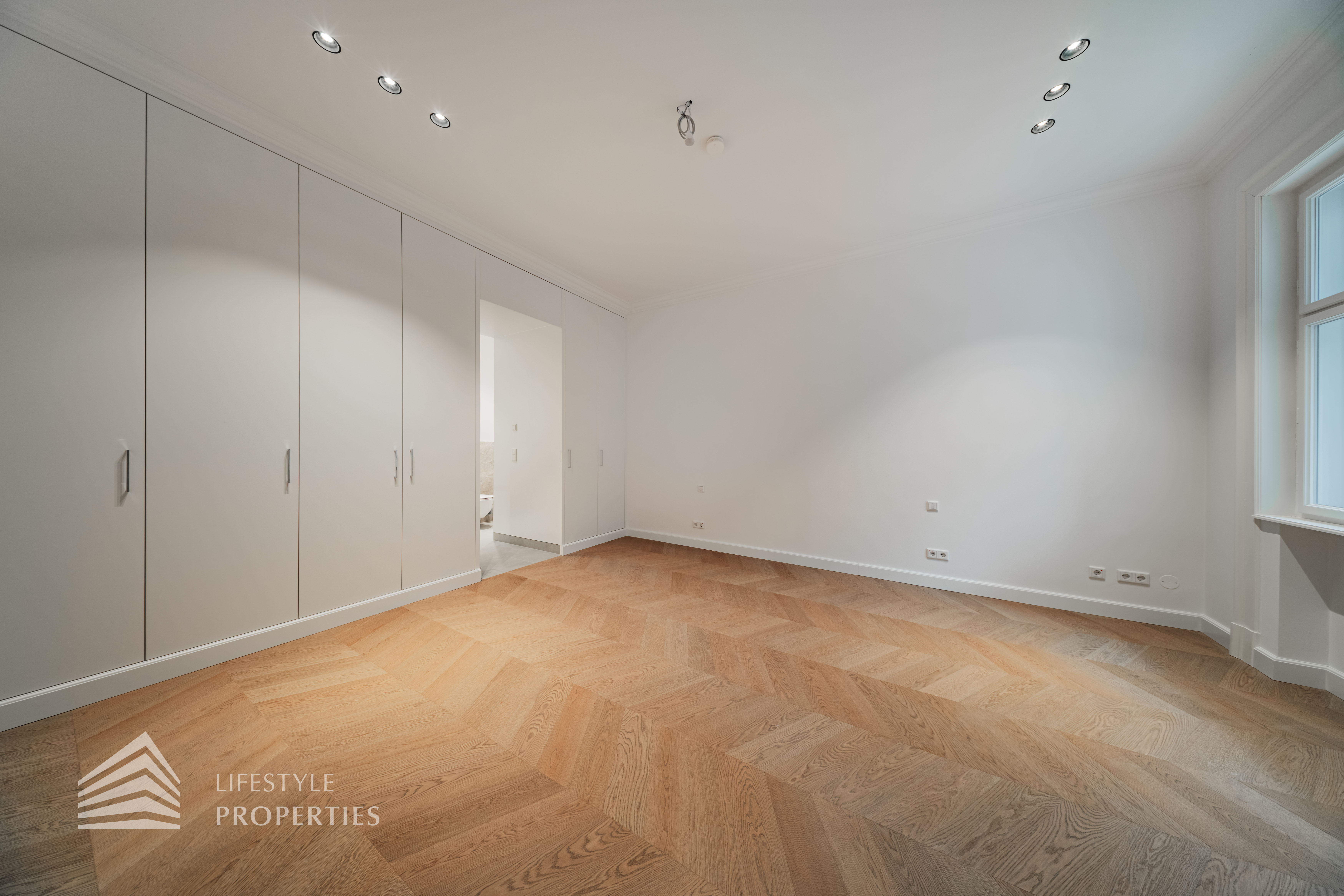 Rechter Hand befindet sich der private Rückzugsbereich mit insgesamt drei großzügigen Schlafräumen, die jeweils höchsten Wohnkomfort bieten. Das Master-Bedroom begeistert mit einer Fläche von rund 23 m², einer separaten Ankleide von etwa 8 m² sowie einem luxuriösen Badezimmer en suite. Dieses überzeugt mit einer freistehenden Badewanne, einer großzügigen Dusche, WC und einem stilvollen Doppelwaschbecken – ein privates Spa-Refugium im eigenen Zuhause.