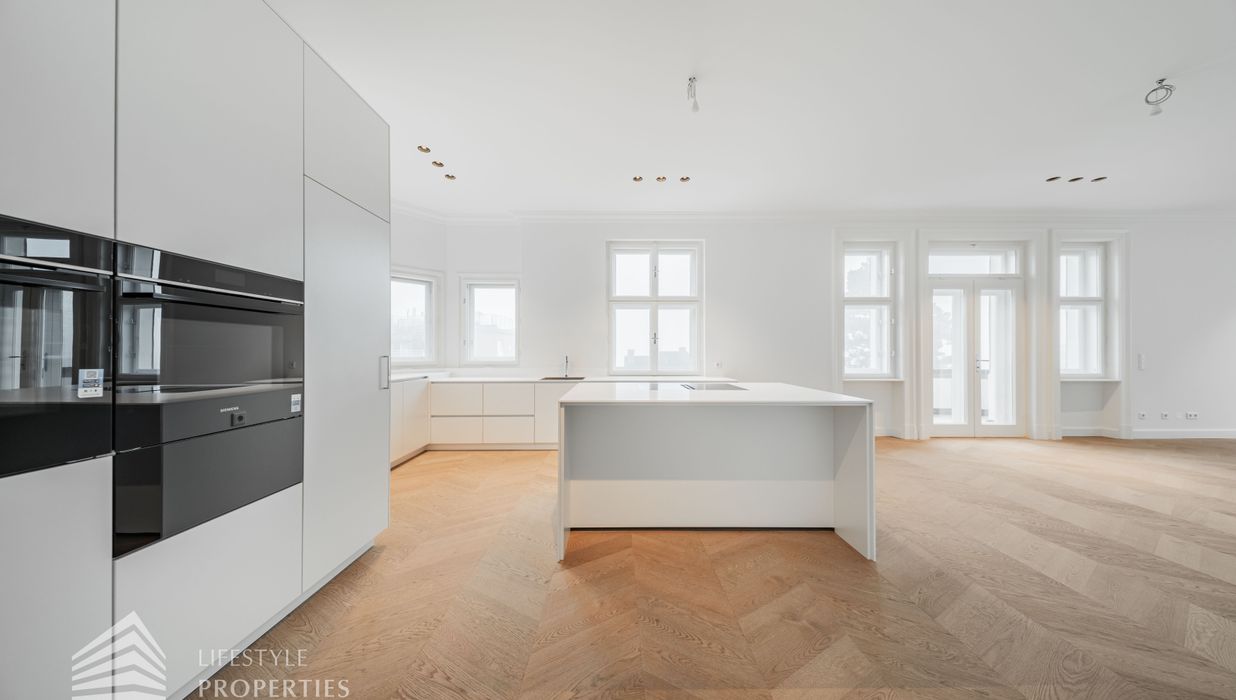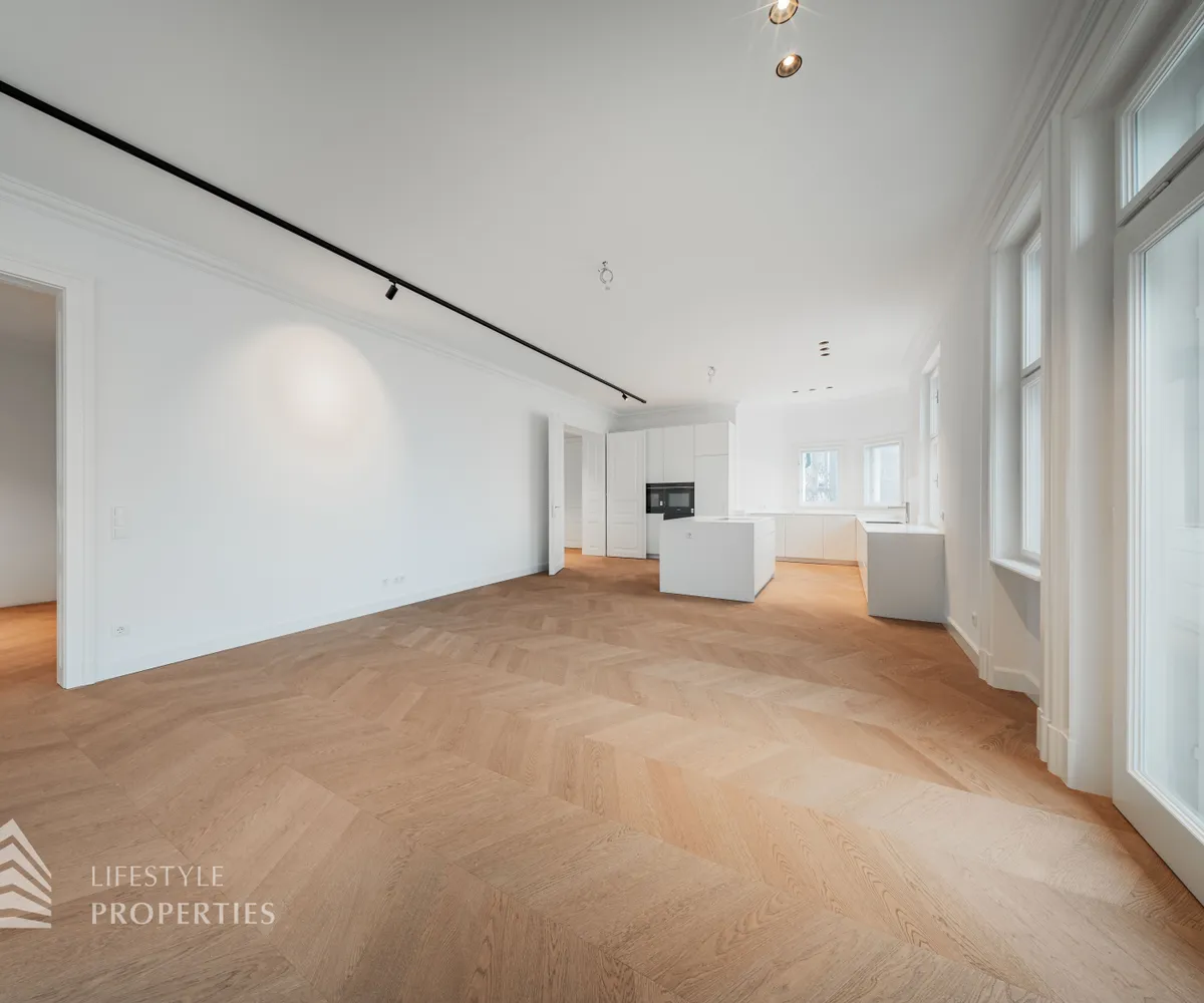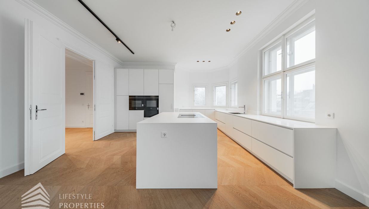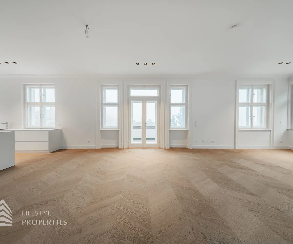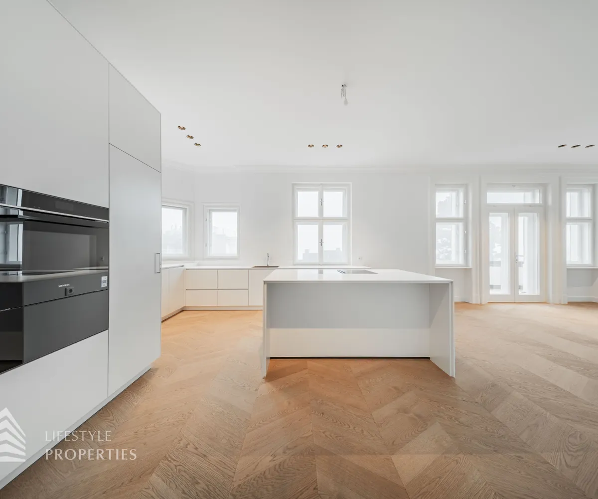 Linker Hand öffnet sich die beeindruckende Wohnküche mit ca. 66 m² – ein lichtdurchfluteter Lebensraum, der Kochen, Genießen und Geselligkeit in perfekter Harmonie vereint. Die elegante Kochinsel bildet das Herzstück dieses Bereichs, während der angrenzende Balkon eine charmante Erweiterung ins Freie bietet und den Raum zusätzlich aufwertet.