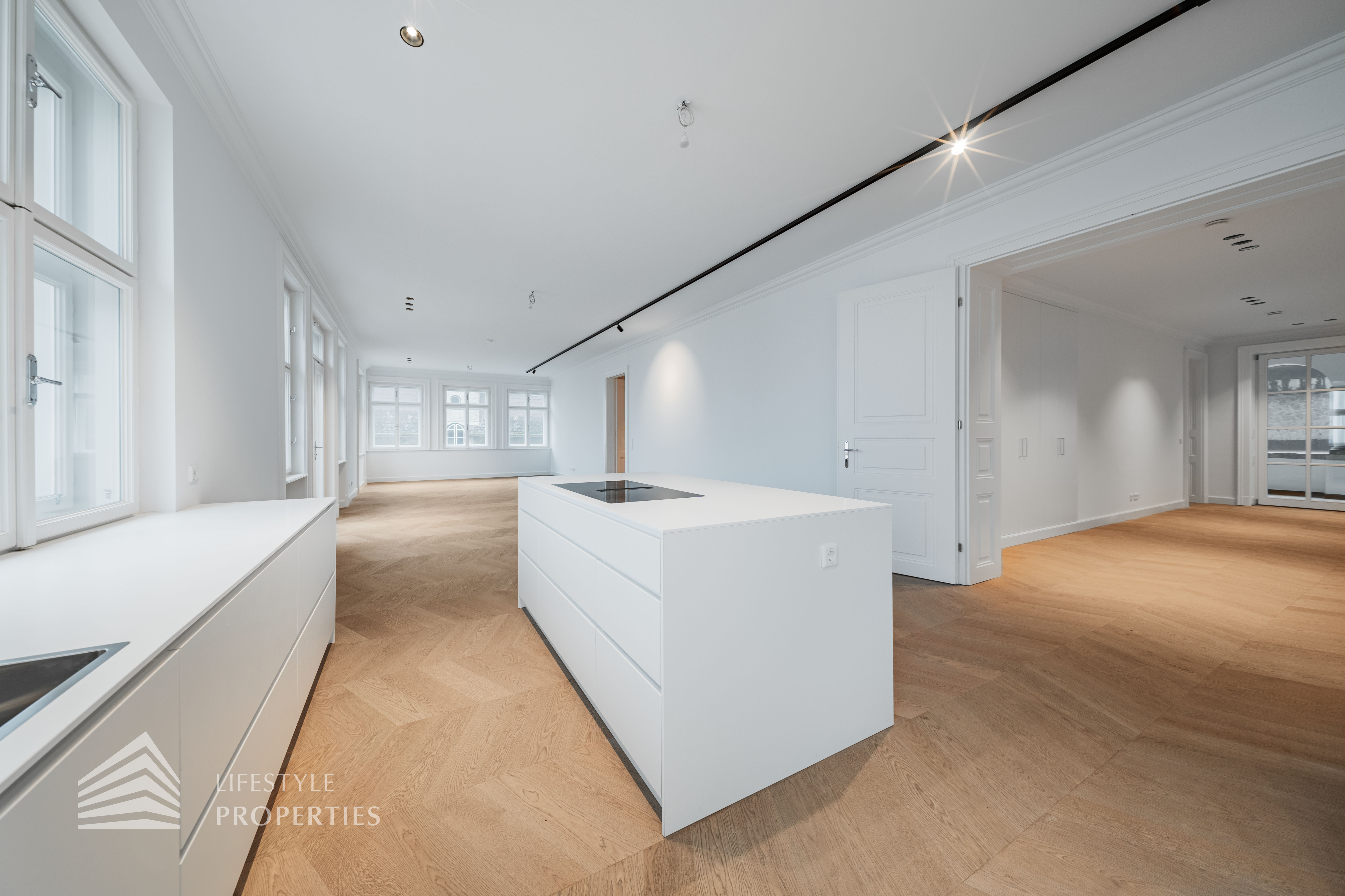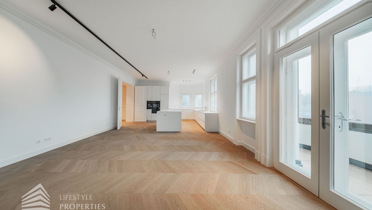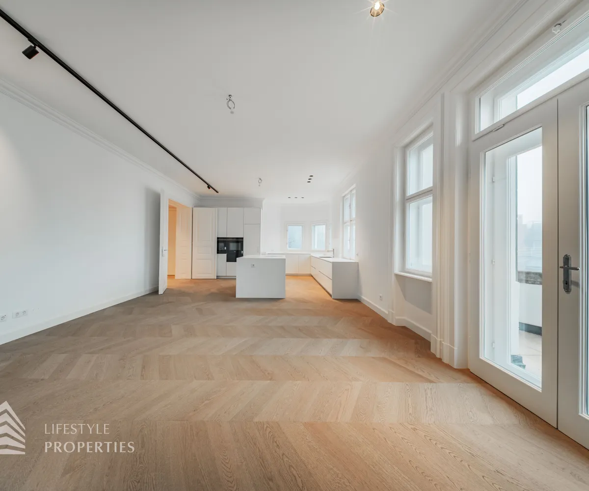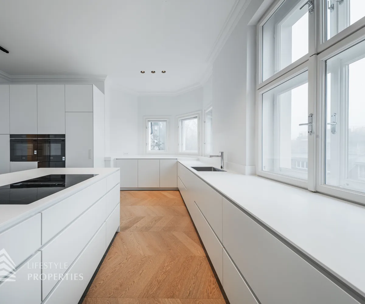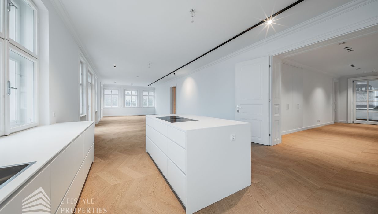 Linker Hand öffnet sich die beeindruckende Wohnküche mit ca. 66 m² – ein lichtdurchfluteter Lebensraum, der Kochen, Genießen und Geselligkeit in perfekter Harmonie vereint. Die elegante Kochinsel bildet das Herzstück dieses Bereichs, während der angrenzende Balkon eine charmante Erweiterung ins Freie bietet und den Raum zusätzlich aufwertet.
