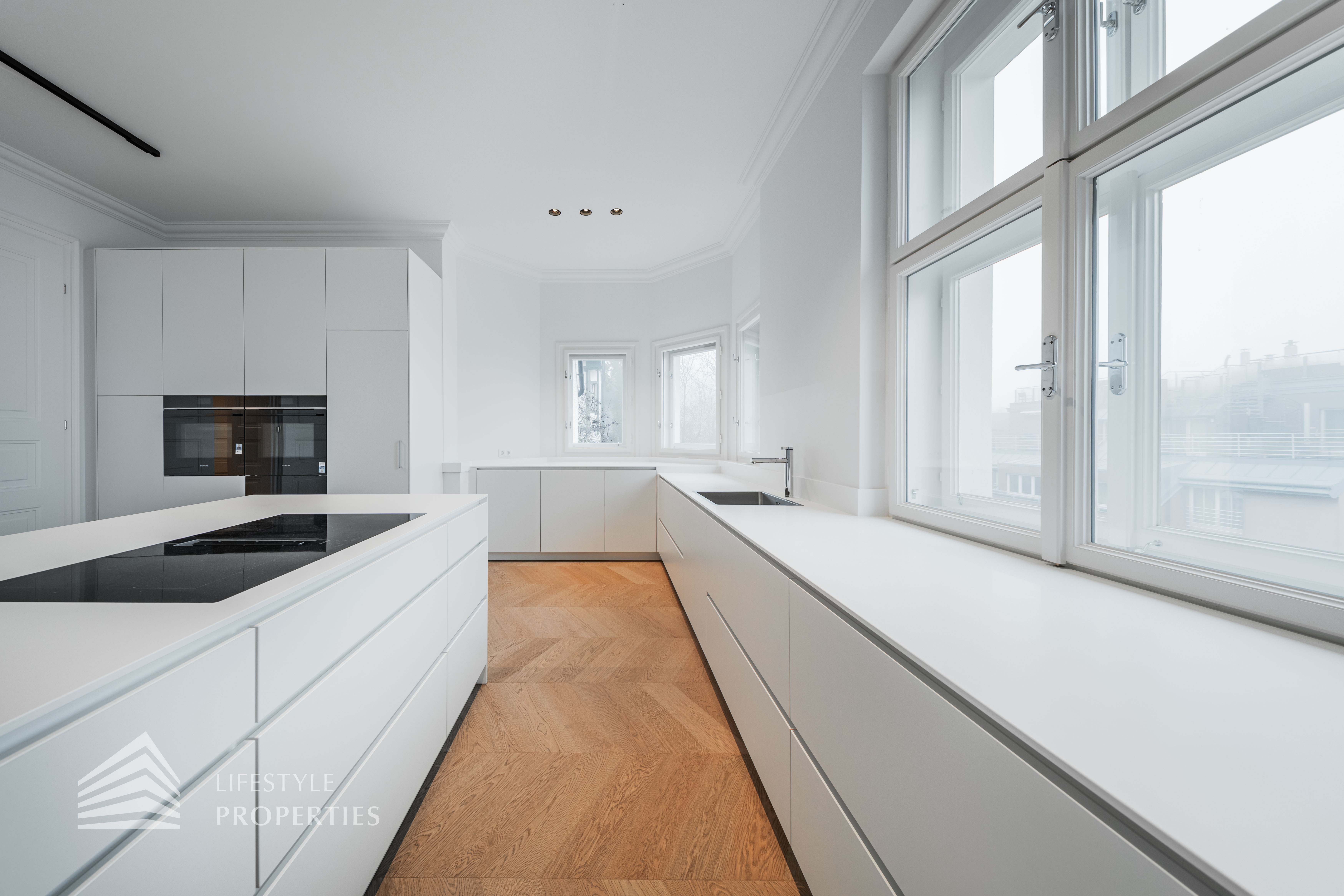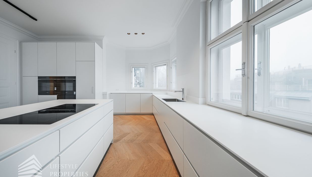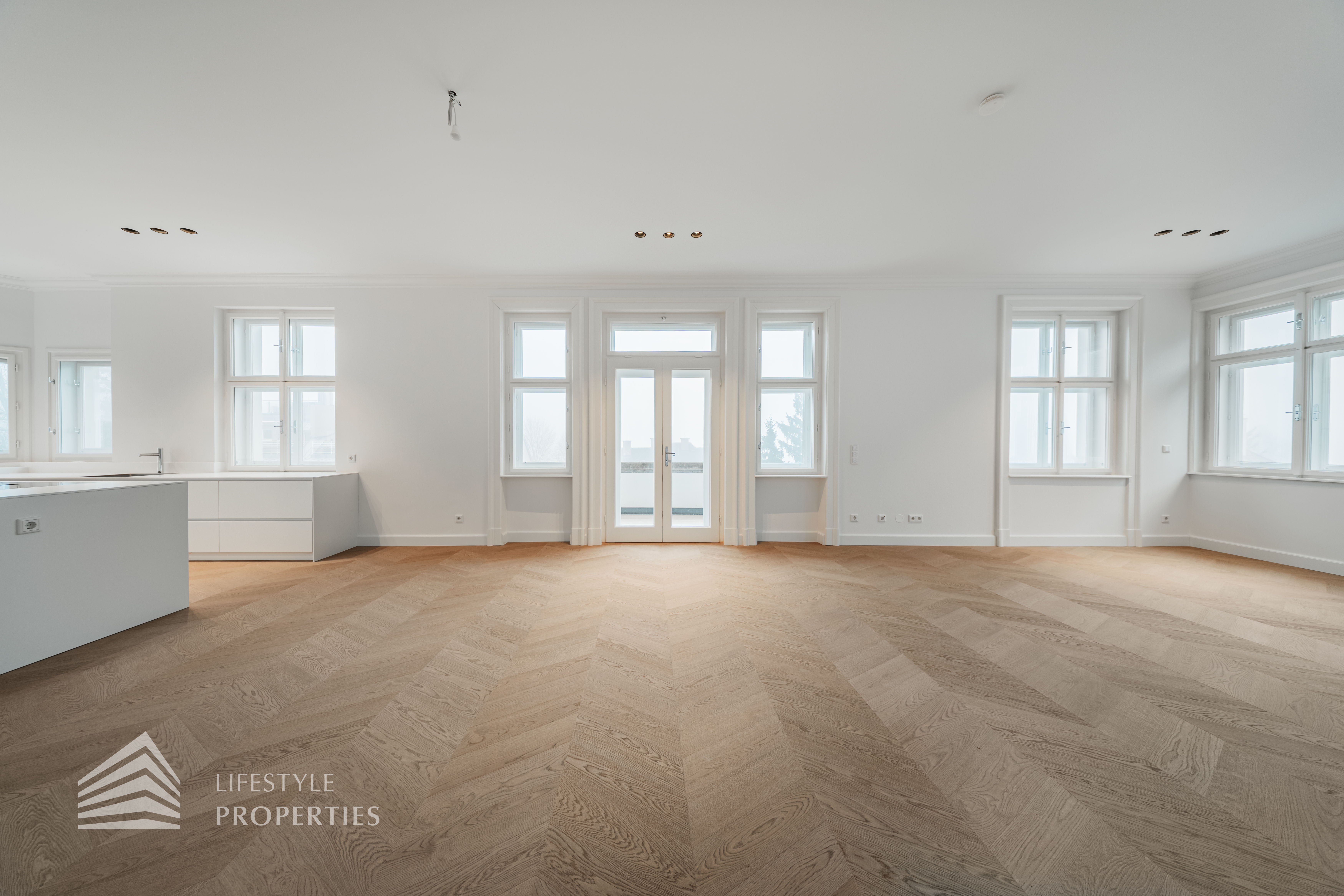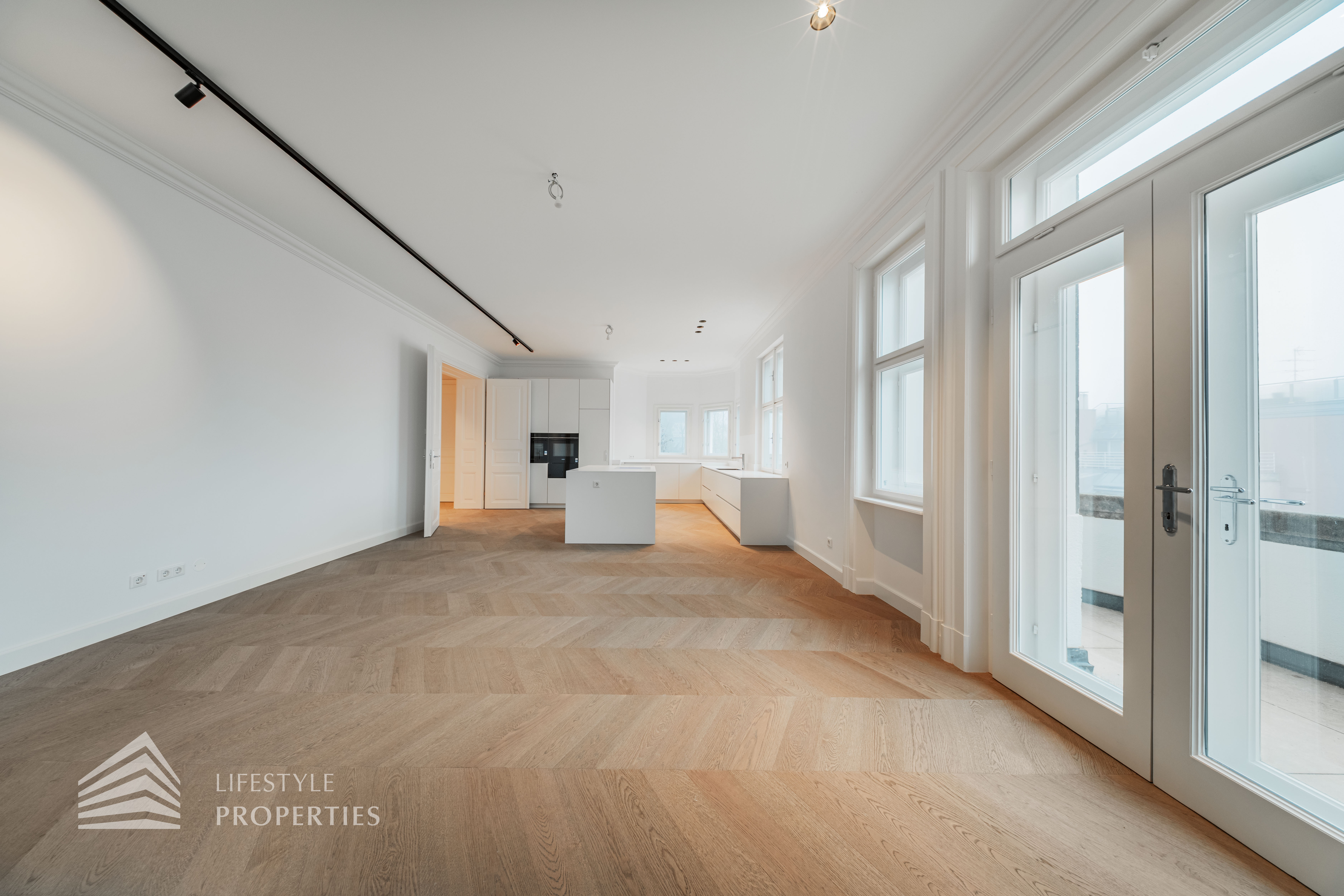 Linker Hand öffnet sich die beeindruckende Wohnküche mit ca. 66 m² – ein lichtdurchfluteter Lebensraum, der Kochen, Genießen und Geselligkeit in perfekter Harmonie vereint. Die elegante Kochinsel bildet das Herzstück dieses Bereichs, während der angrenzende Balkon eine charmante Erweiterung ins Freie bietet und den Raum zusätzlich aufwertet.