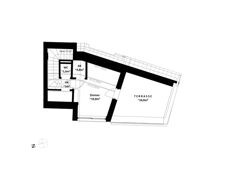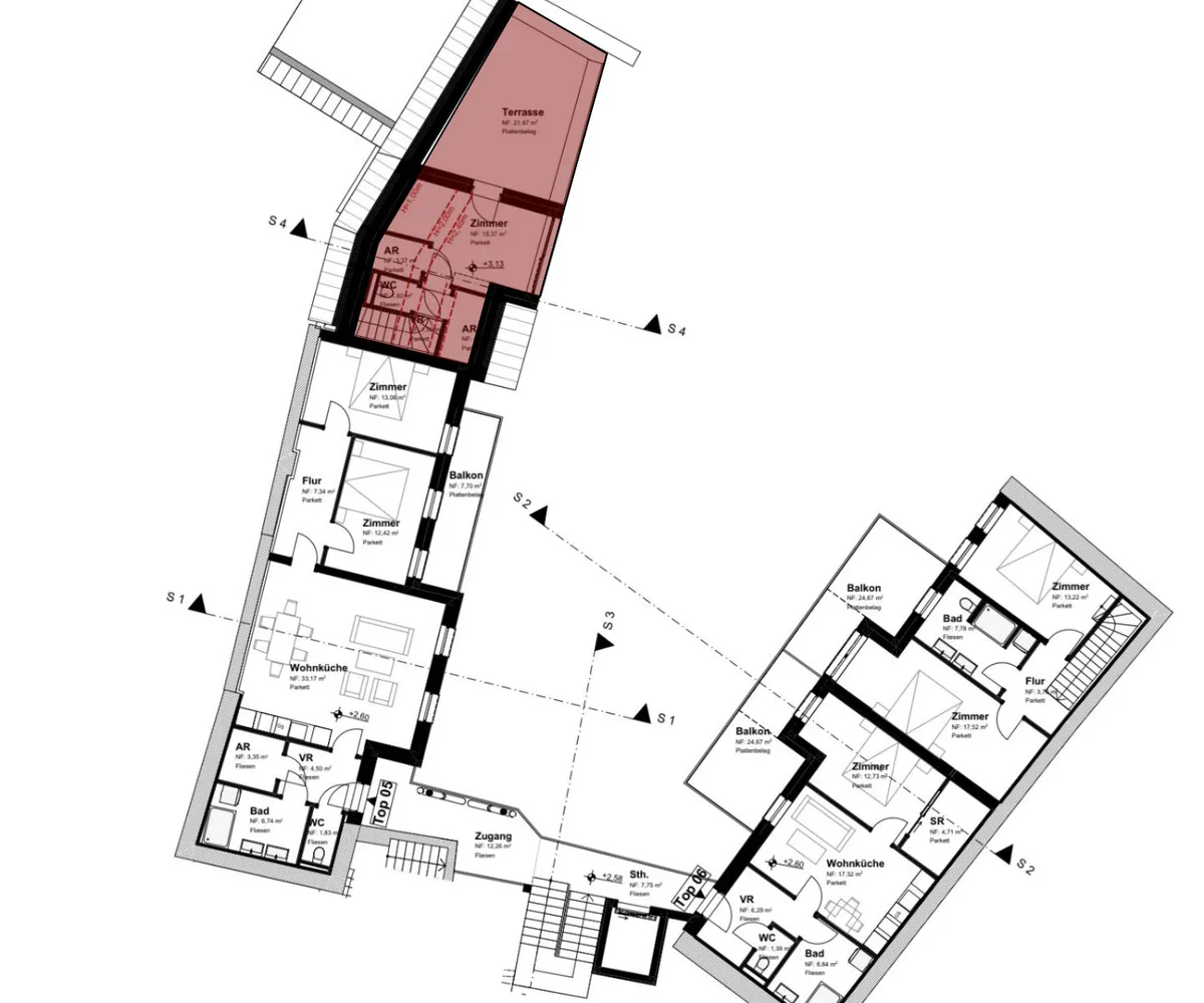 Ebene 2 ist der "Elternbereich" ihr absoluter privater Rückzugsbereich: ein großzügiges Schlafzimmer mit eigener ca. 19 m² Terrasse – Privatsphäre wird hier wirklich großgeschrieben.