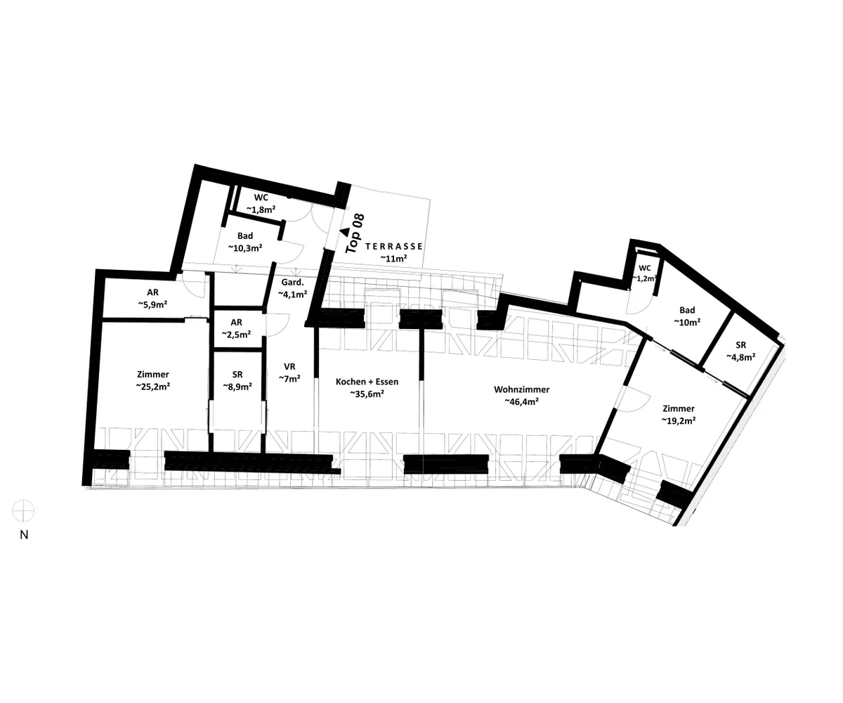 Mit rund 183 m² ist diese Wohnung die größte Einheit im gesamten Projekt – und überzeugt durch eine durchdachte sowie großzügige Raumaufteilung, genug Platz und Freiraum. In allen Räumen sorgen die großen Fensterflächen für viel Tageslicht und schaffen eine helle, freundliche Atmosphäre mit vielfältigen Nutzungsmöglichkeiten. Der Koch- und Essbereich bildet das kommunikative Herzstück der Wohnung, ergänzt durch einen geräumigen Wohnbereich , der direkt auf die Terrasse führt und so den Wohnraum auch noch nach außen erweitert.